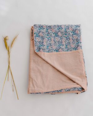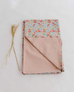 Funda nórdica para camas de 80/90cm. Abertura en la parte de abajo para introducir el relleno deseado, cierre mediante lazo. Confeccionado combinando Liberty Mara Azul y plumeti rosa