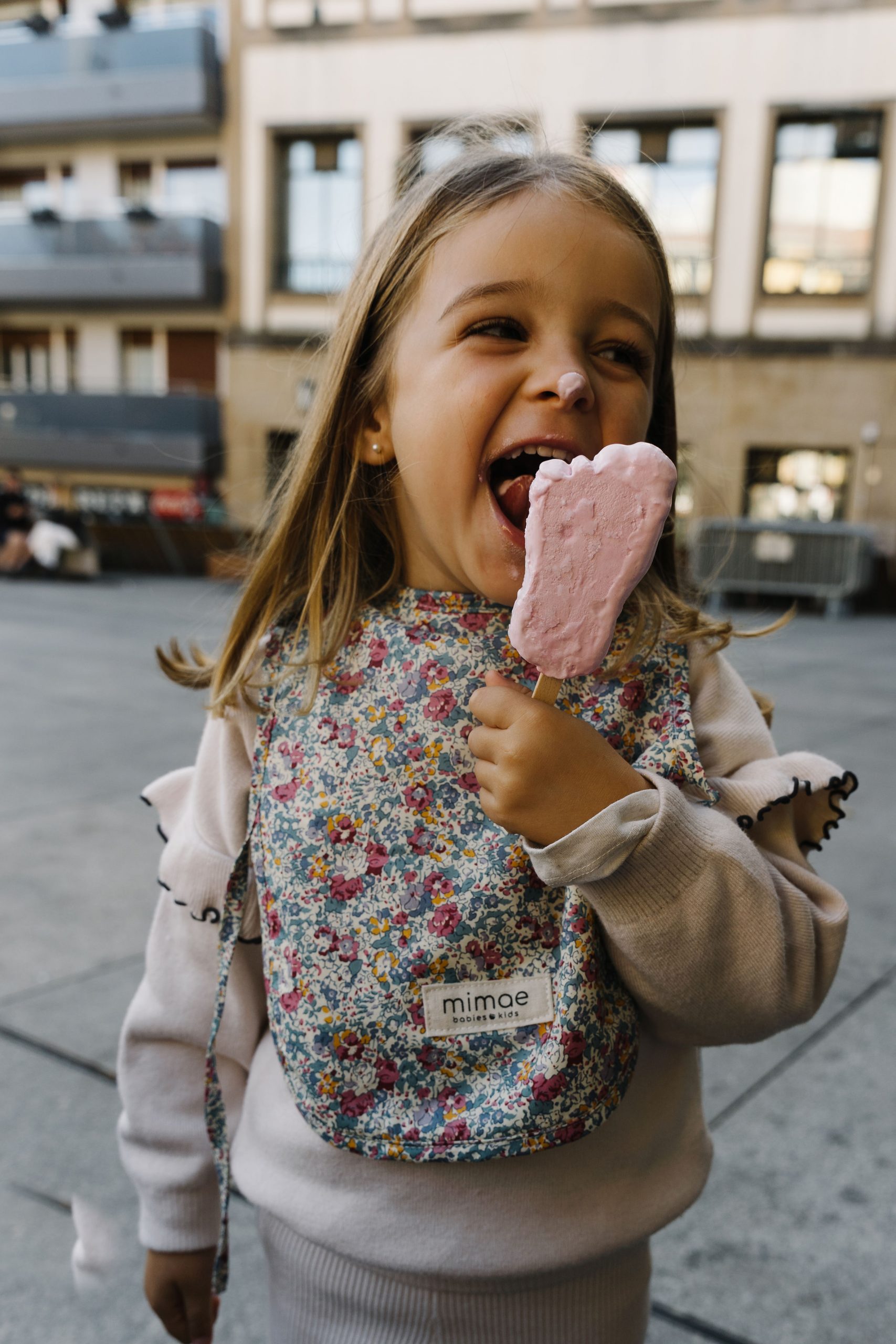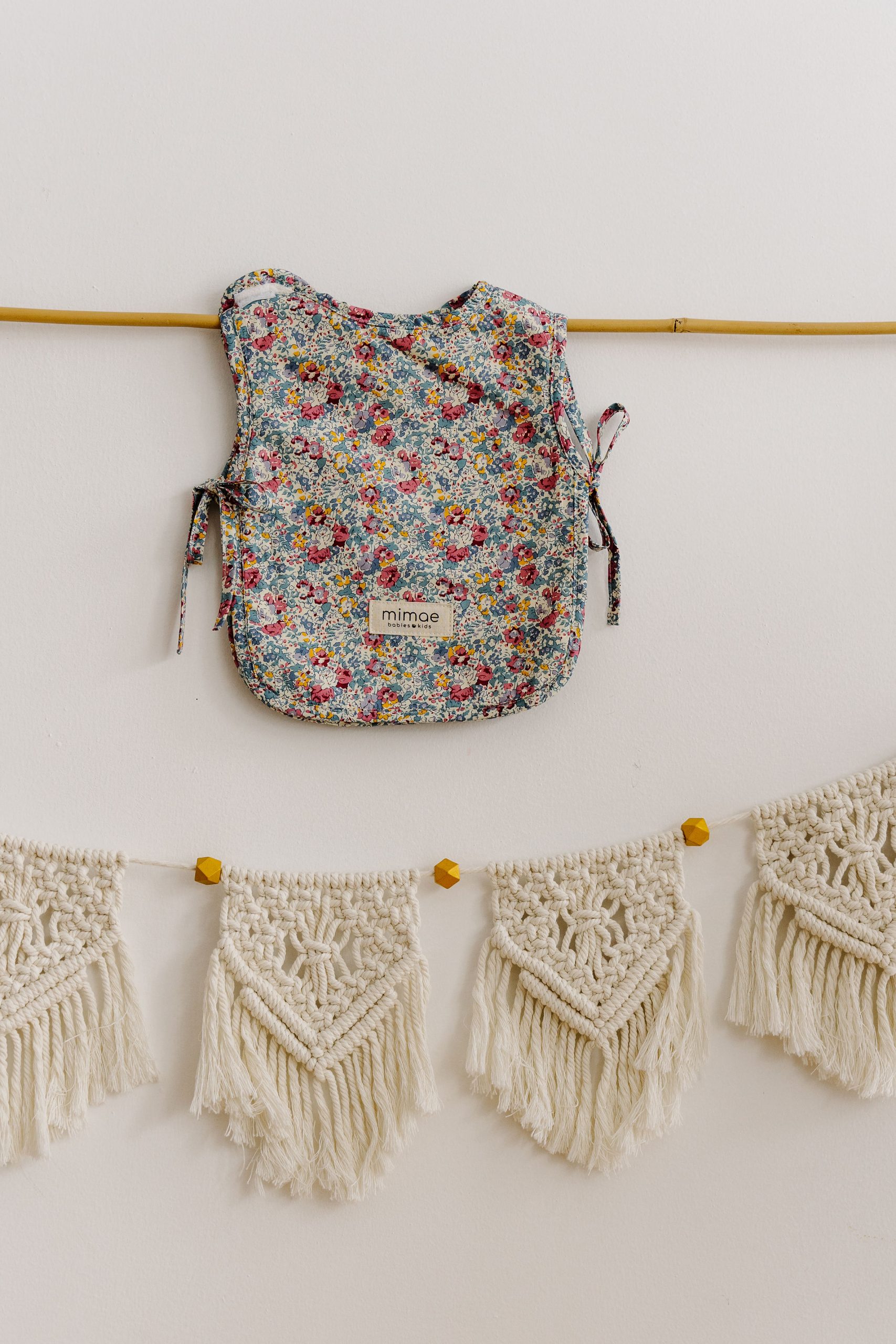 Baberos classic, con pechera doble. Se adaptan muy bien gracias a los lazos de los laterales. Cierre en el cuello mediante velcro. Interior Rizo toalla algodón. Talla desde los 6 meses hasta los 4 años. Tejido en nuestro Liberty Matilde.
