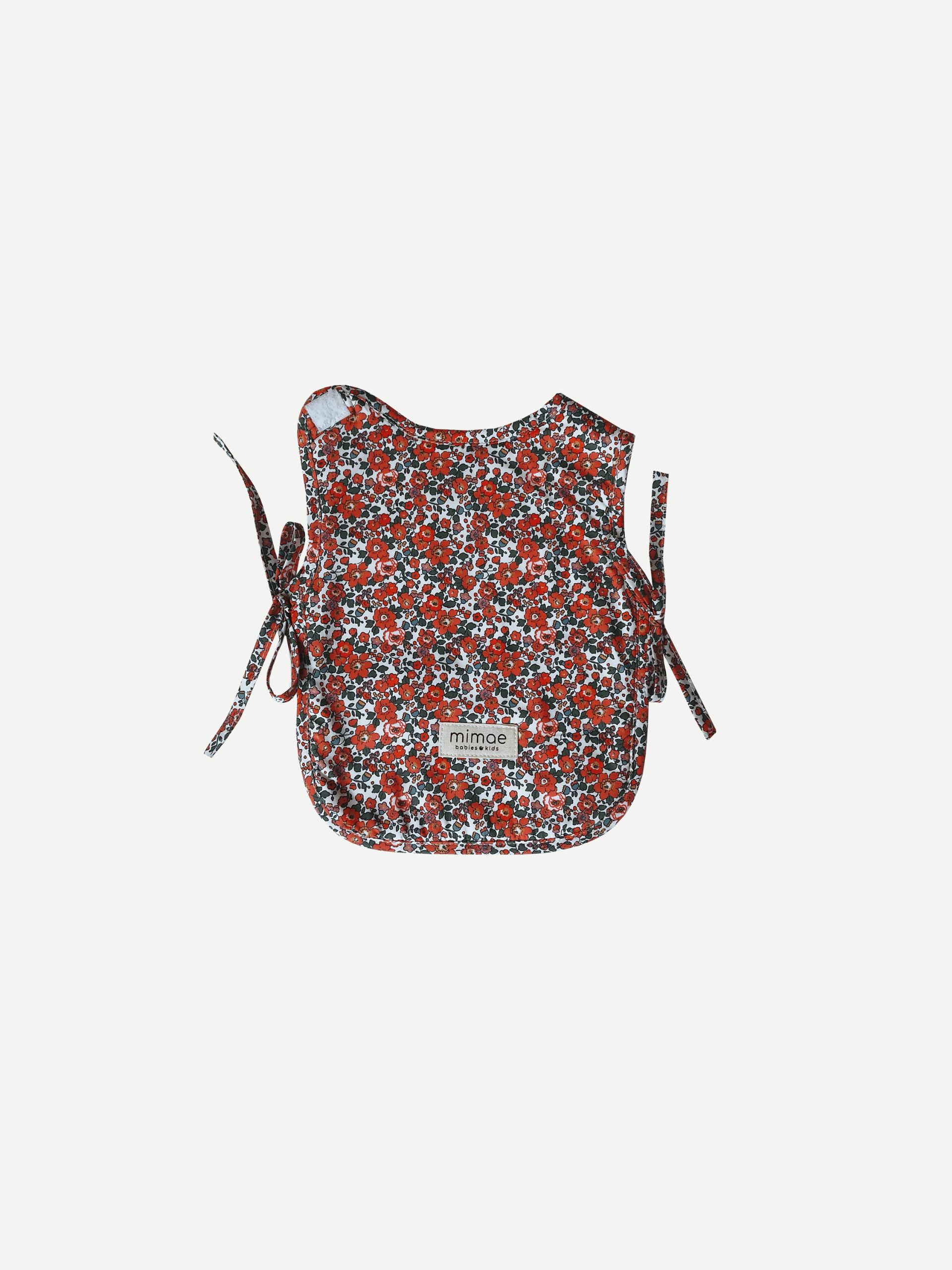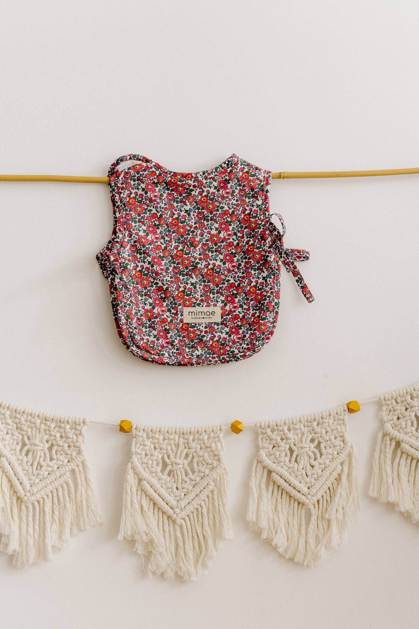 Baberos classic, con pechera doble. Se adaptan muy bien gracias a los lazos de los laterales. Cierre en el cuello mediante velcro. Interior Rizo toalla algodón. Talla desde los 6 meses hasta los 4 años. Tejido en nuestro Liberty Rous.