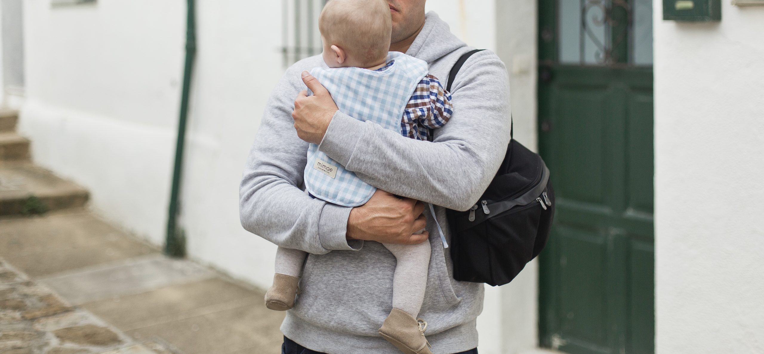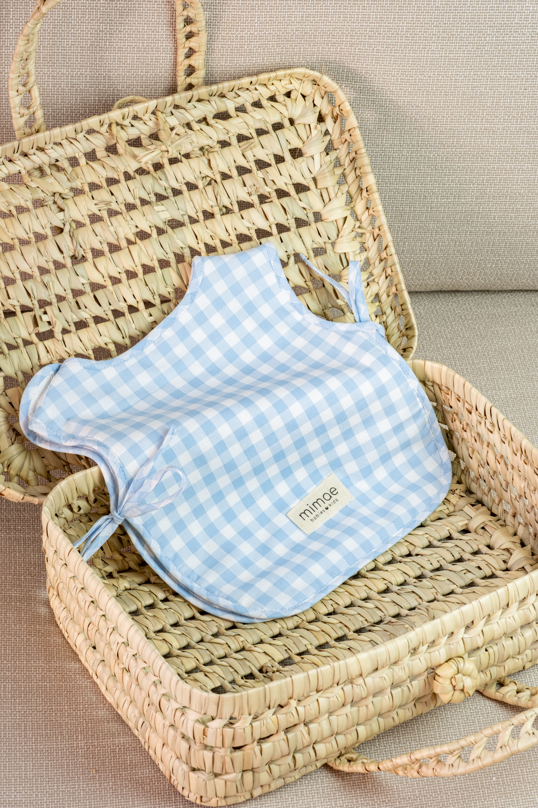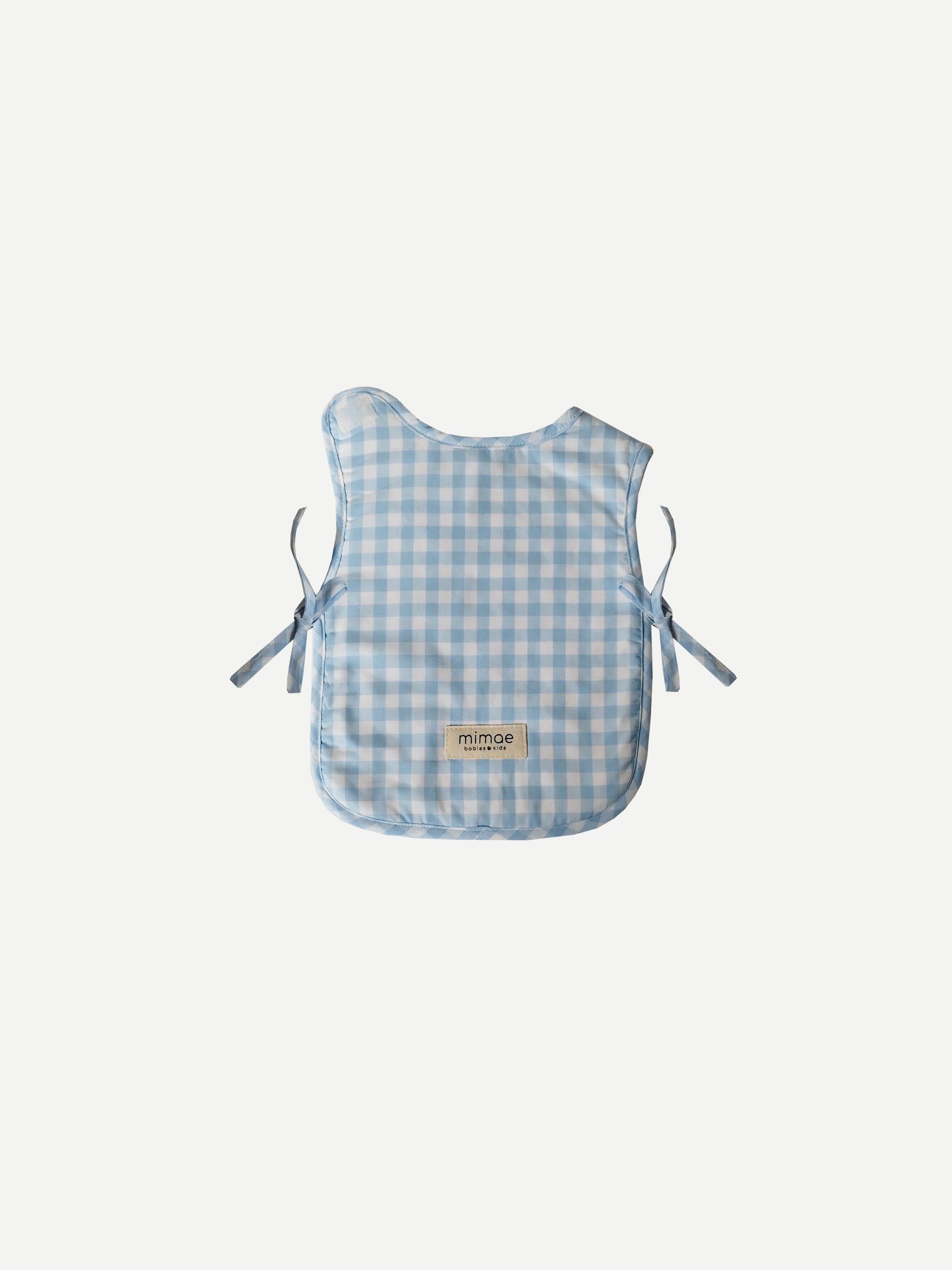 Babero Classic Mimae doble estilo pechera. Forrado en rizo toalla de algodón, se cierra con un velcro en el escote y se adapta a la medida del niño con los lacitos laterales. Tejido en nuestro Vichy de algodón azul claro y blanco.