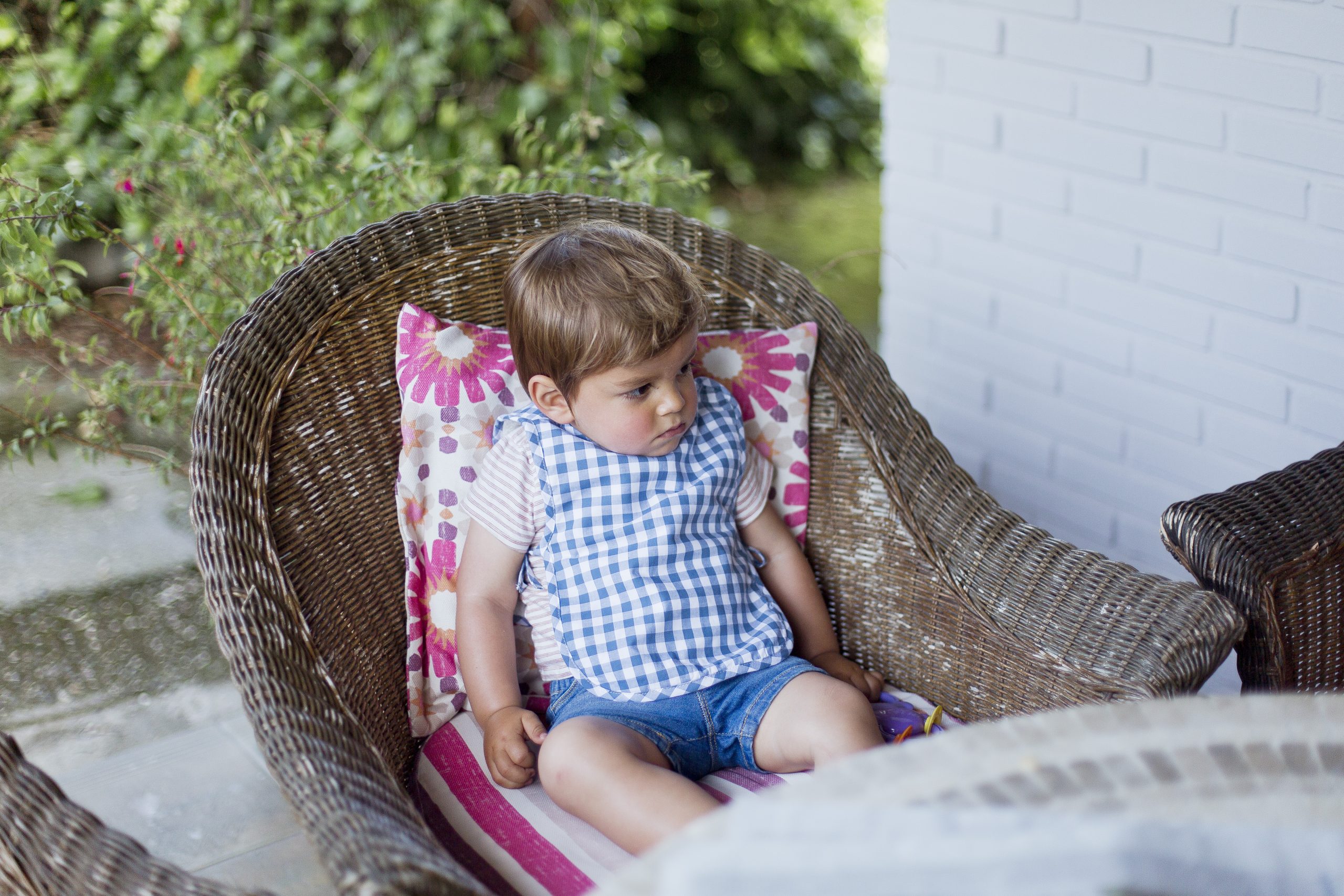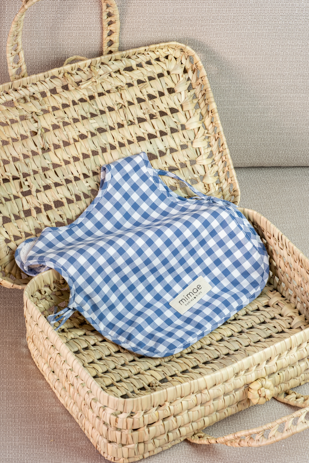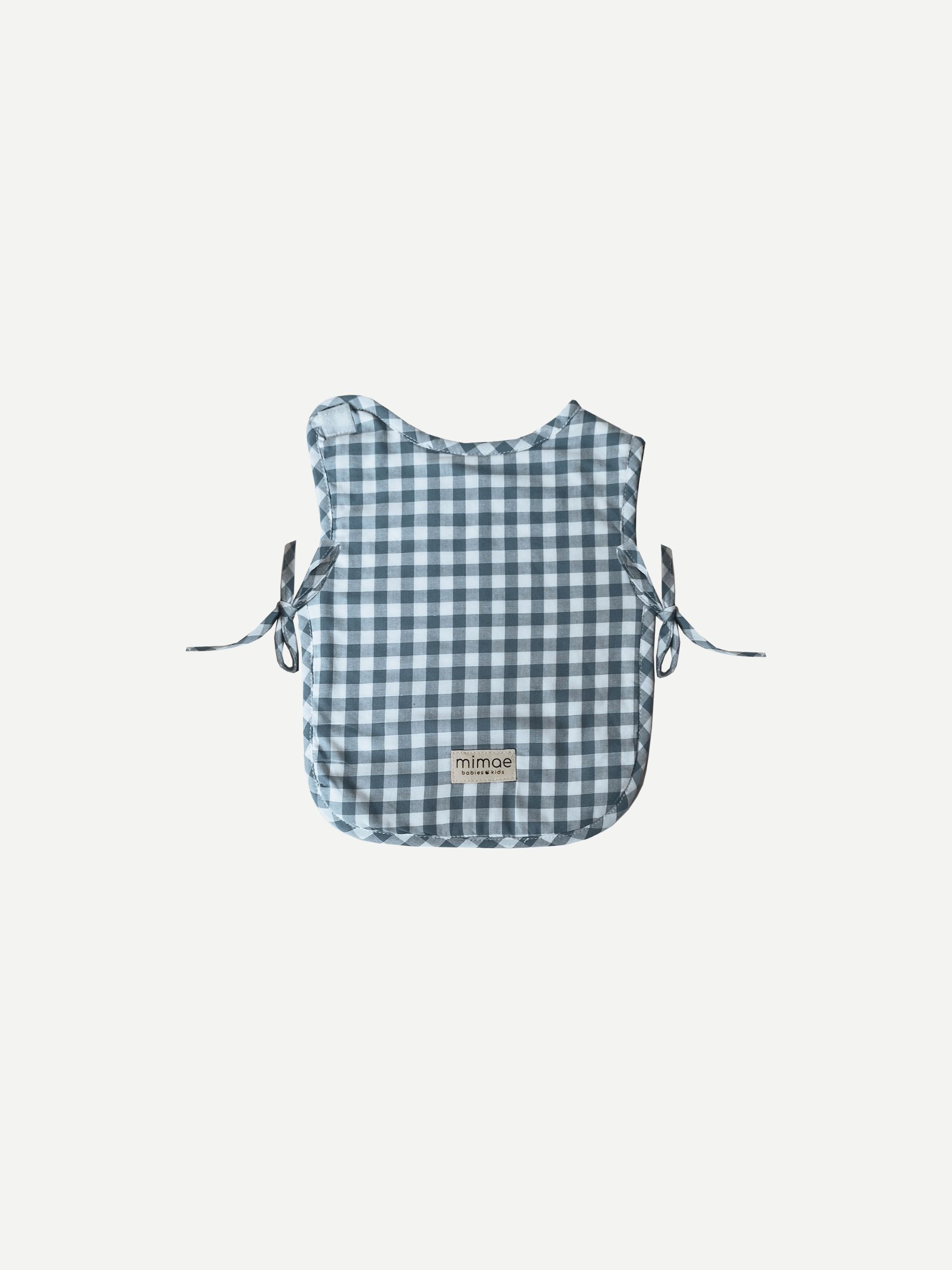 Babero Classic Mimae doble estilo pechera. Forrado en rizo toalla de algodón, se cierra con un velcro en el escote y se adapta a la medida del niño con los lacitos laterales. Tejido en nuestro Vichy de algodón azul y blanco.
