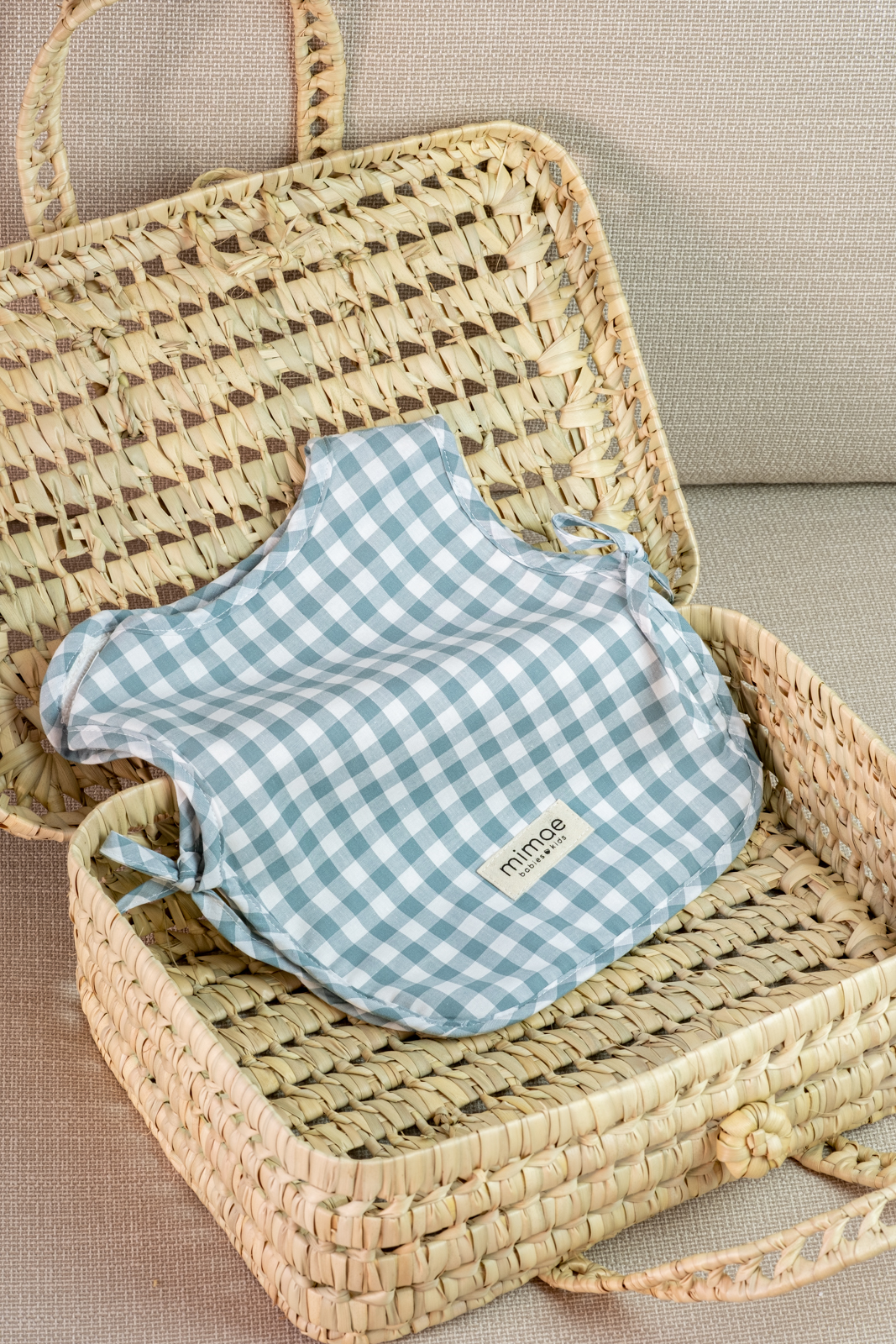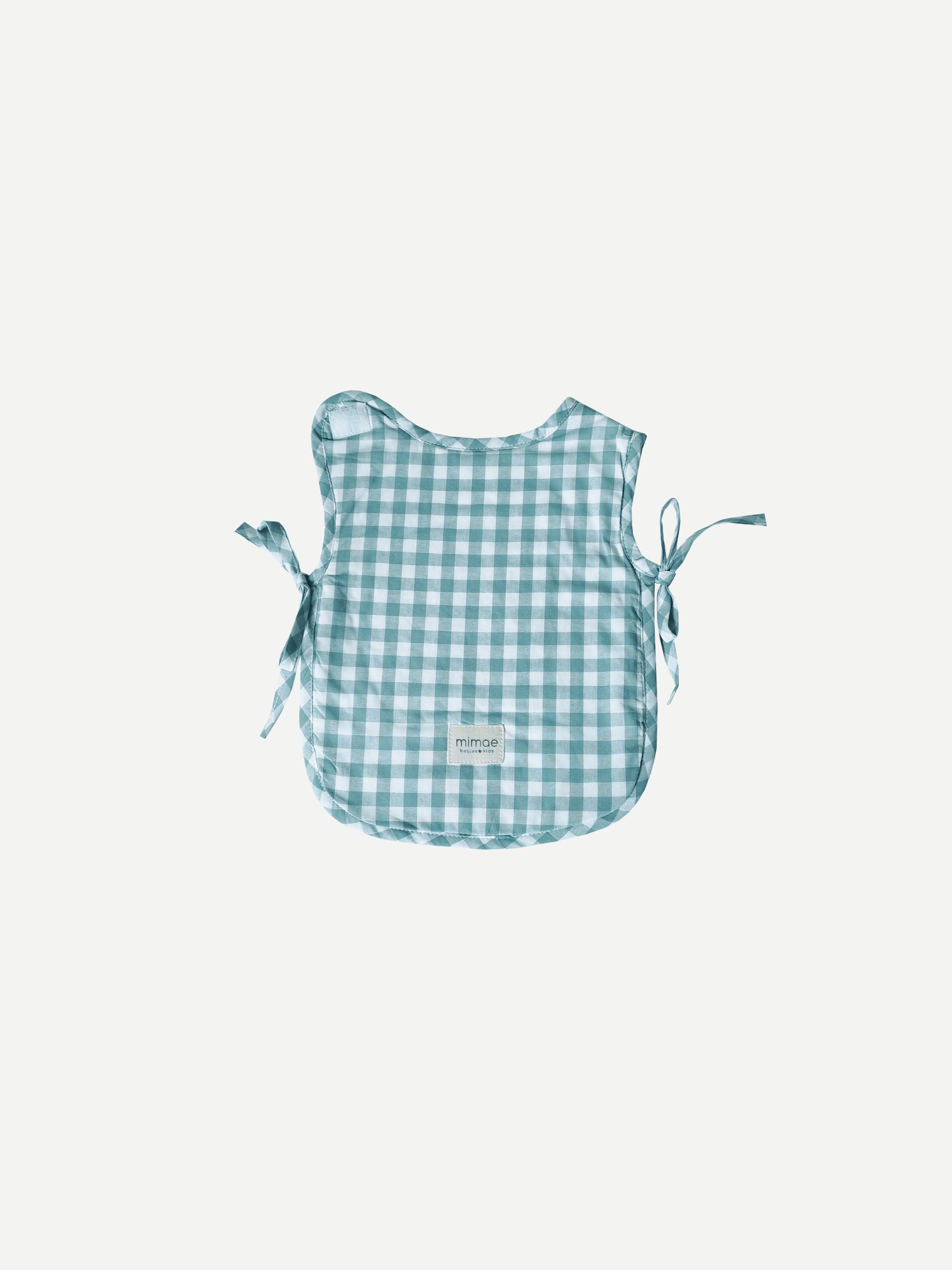 Babero Classic Mimae doble estilo pechera. Forrado en rizo toalla de algodón, se cierra con un velcro en el escote y se adapta a la medida del niño con los lacitos laterales. Tejido en nuestro Vichy de algodón menta y blanco.