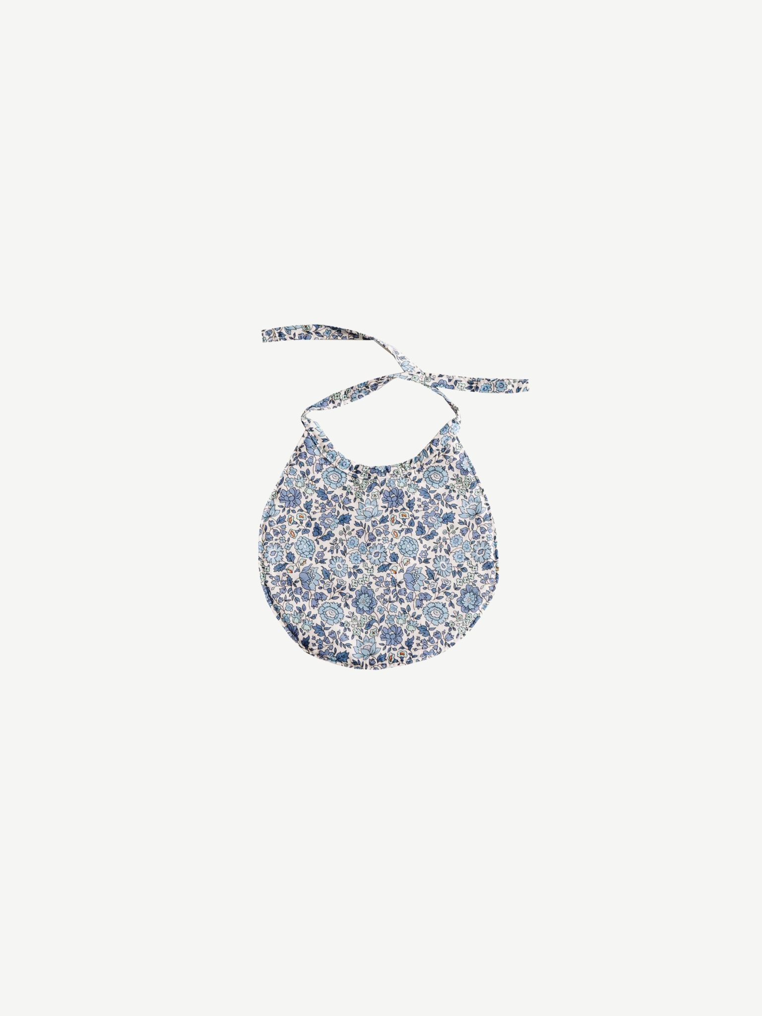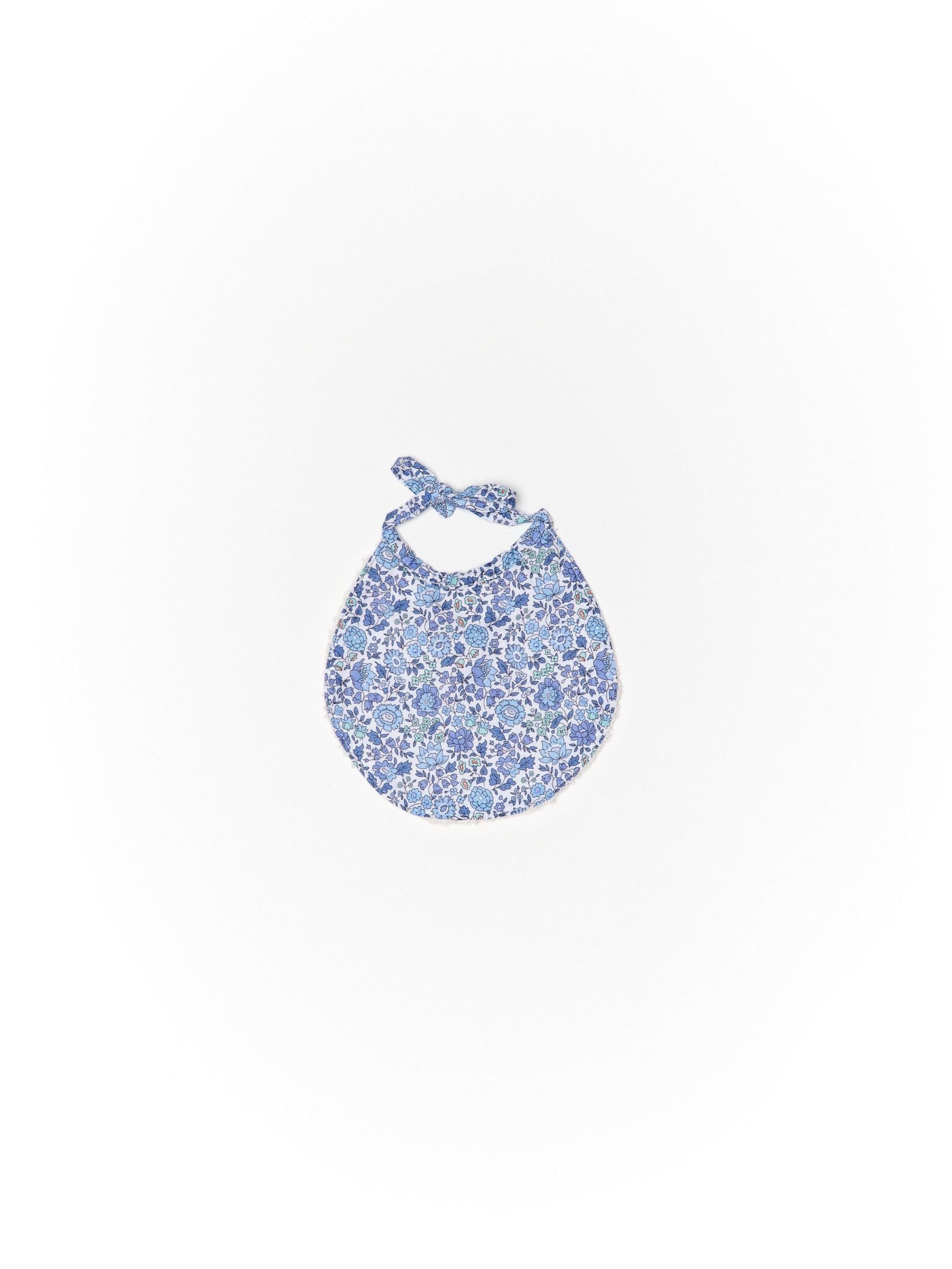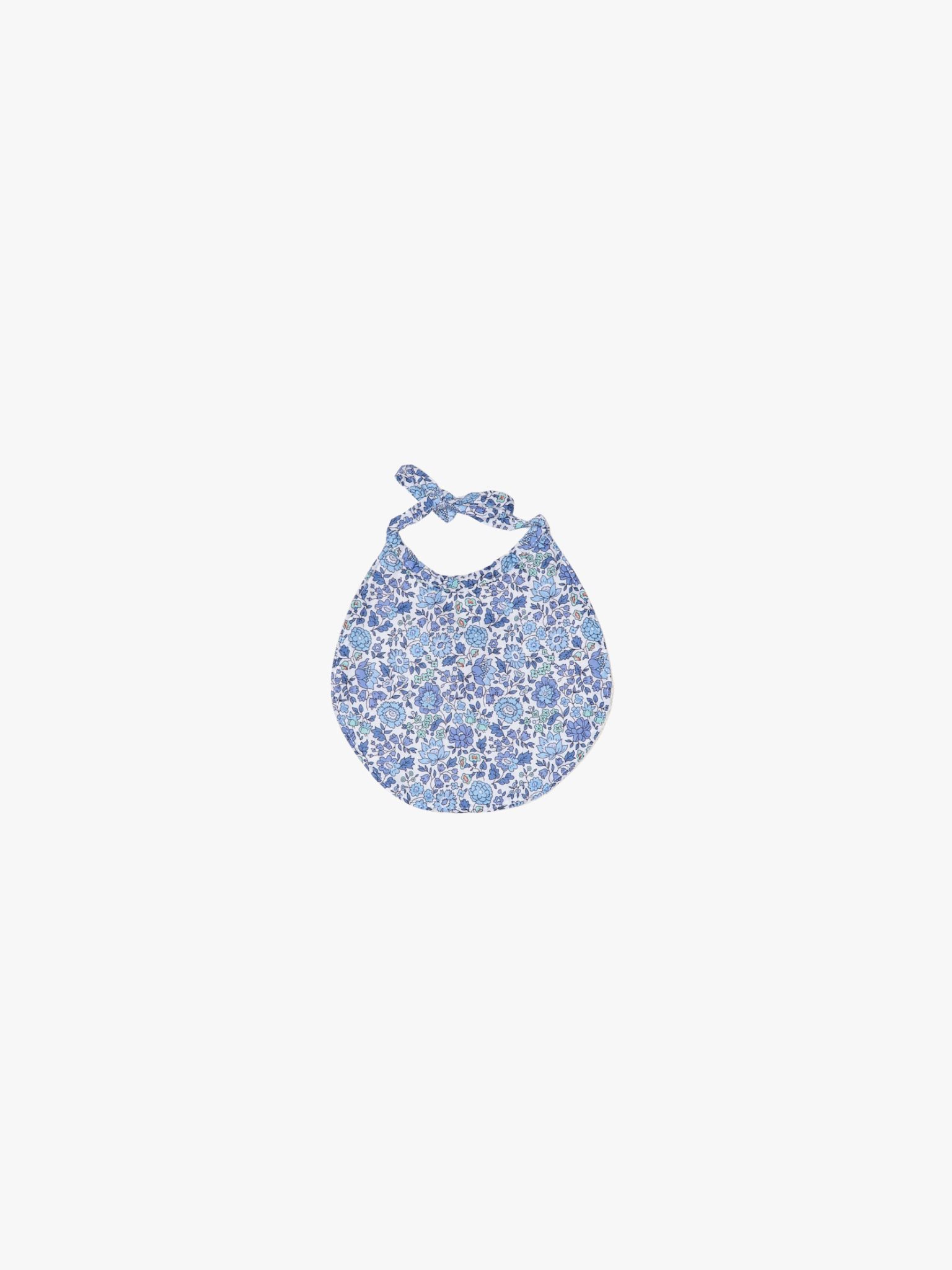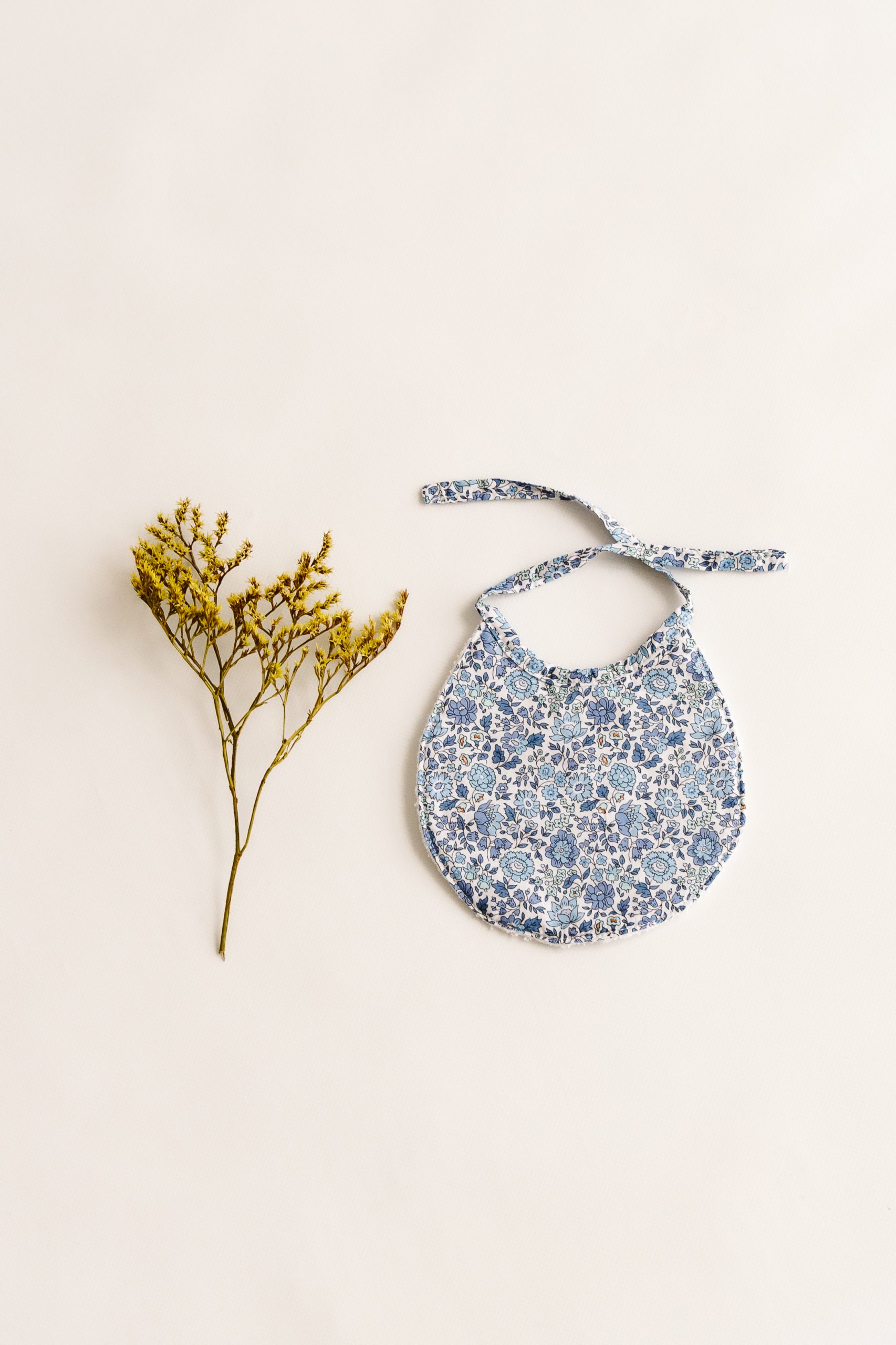 Babero de recien nacido con rizo de Algodón. Se atan al cuello mediante lazo. Talla hasta los 12 meses aprox. Tejido en nuestro Liberty Azuli.