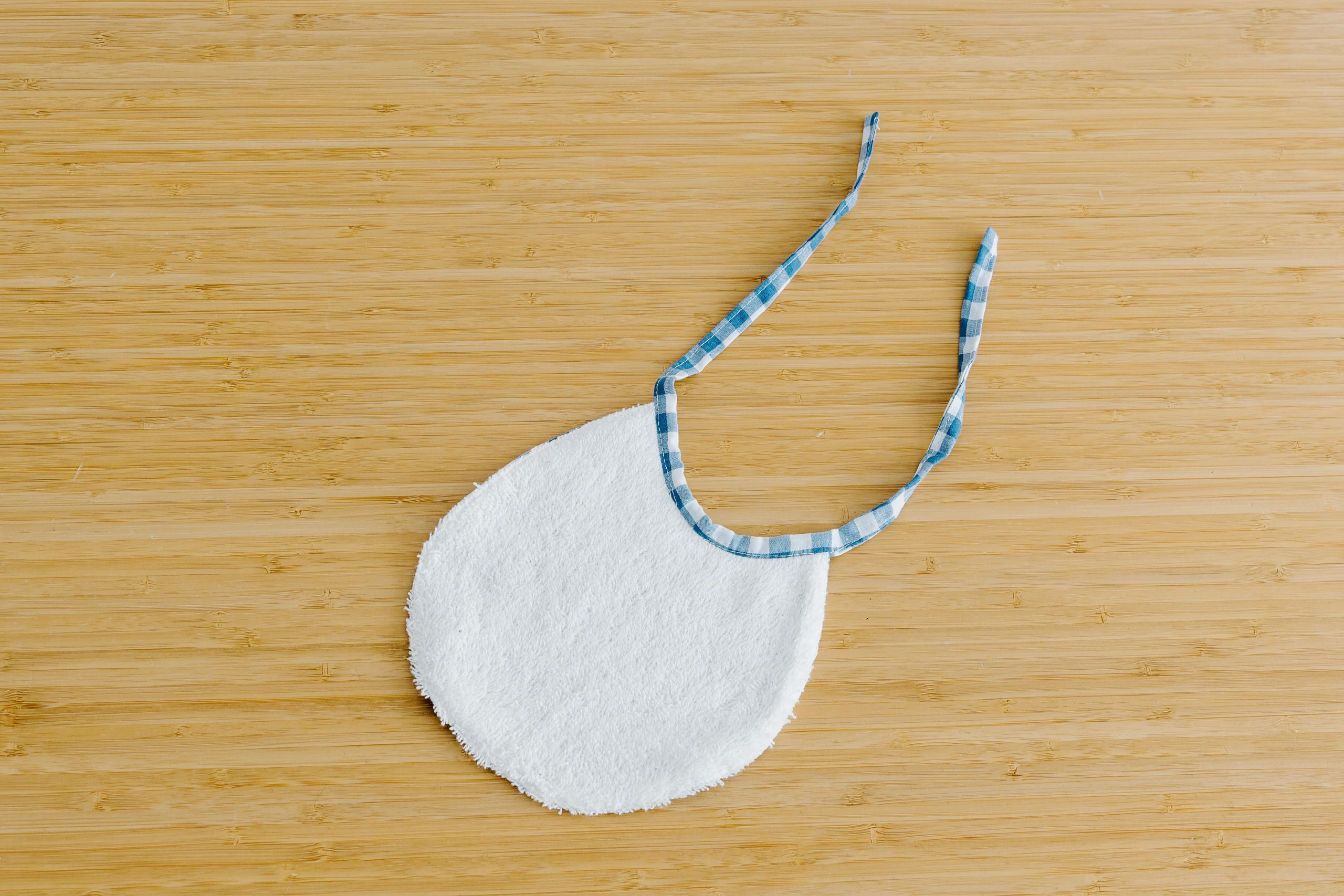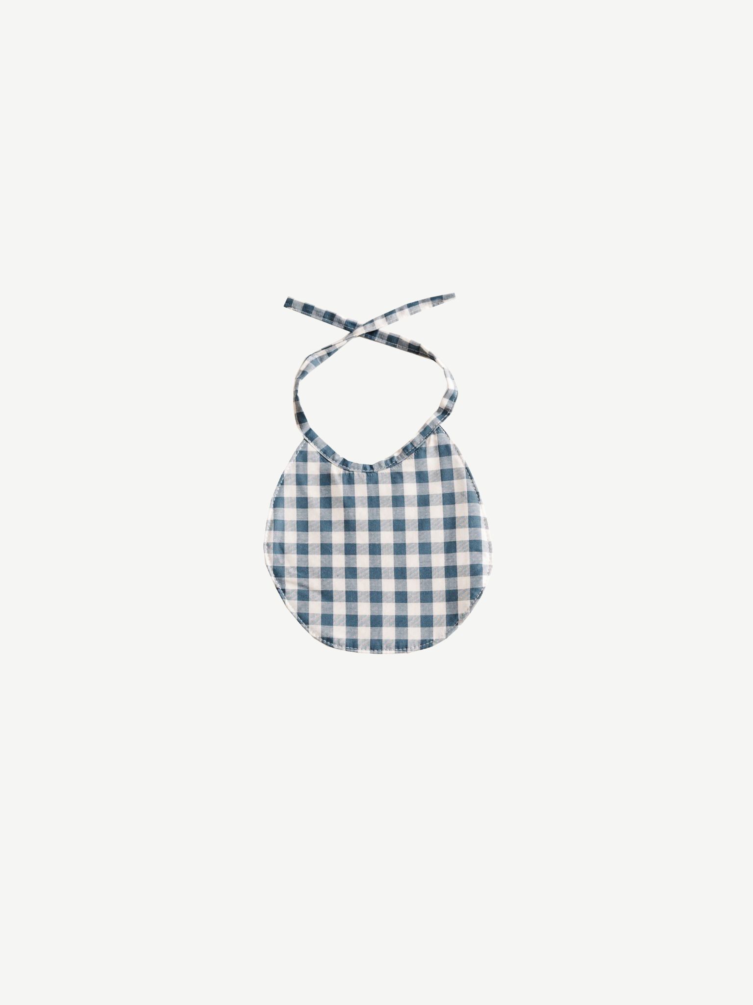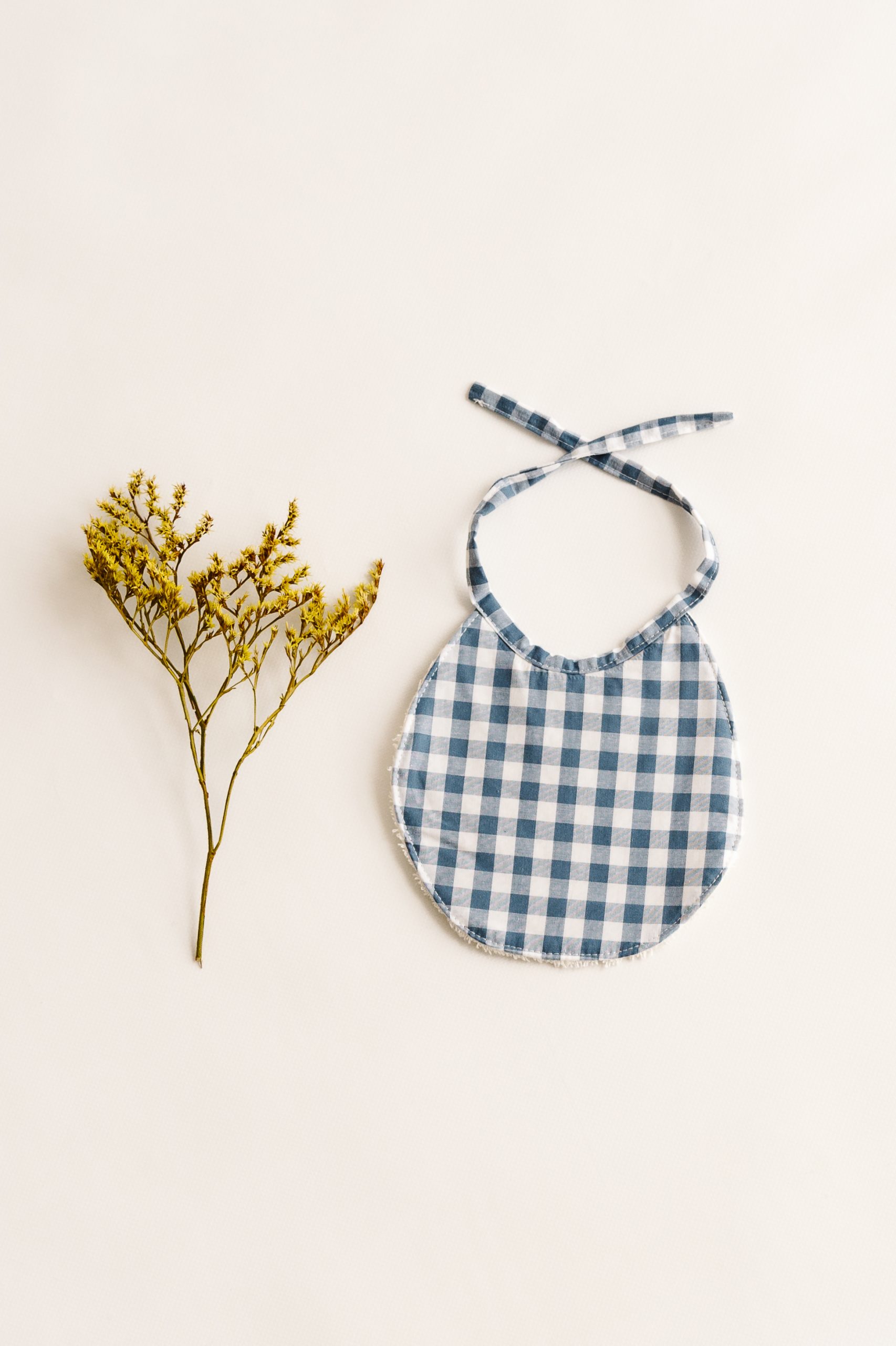 Babero de recien nacido con rizo de Algodón. Se atan al cuello mediante lazo. Talla hasta los 12 meses aprox. Tejido en nuestro Vichy Azul.