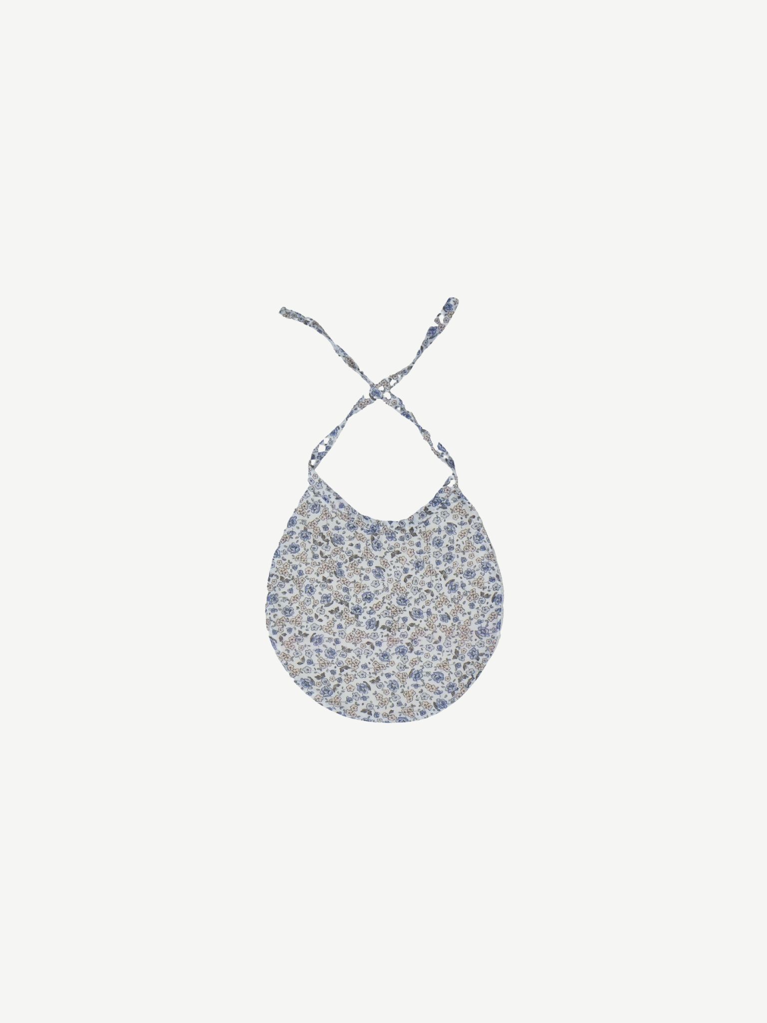 Babero de recien nacido con rizo de Algodón. Se atan al cuello mediante lazo. Talla hasta los 24  meses aprox. Tejido en nuestro Liberty Azuli.