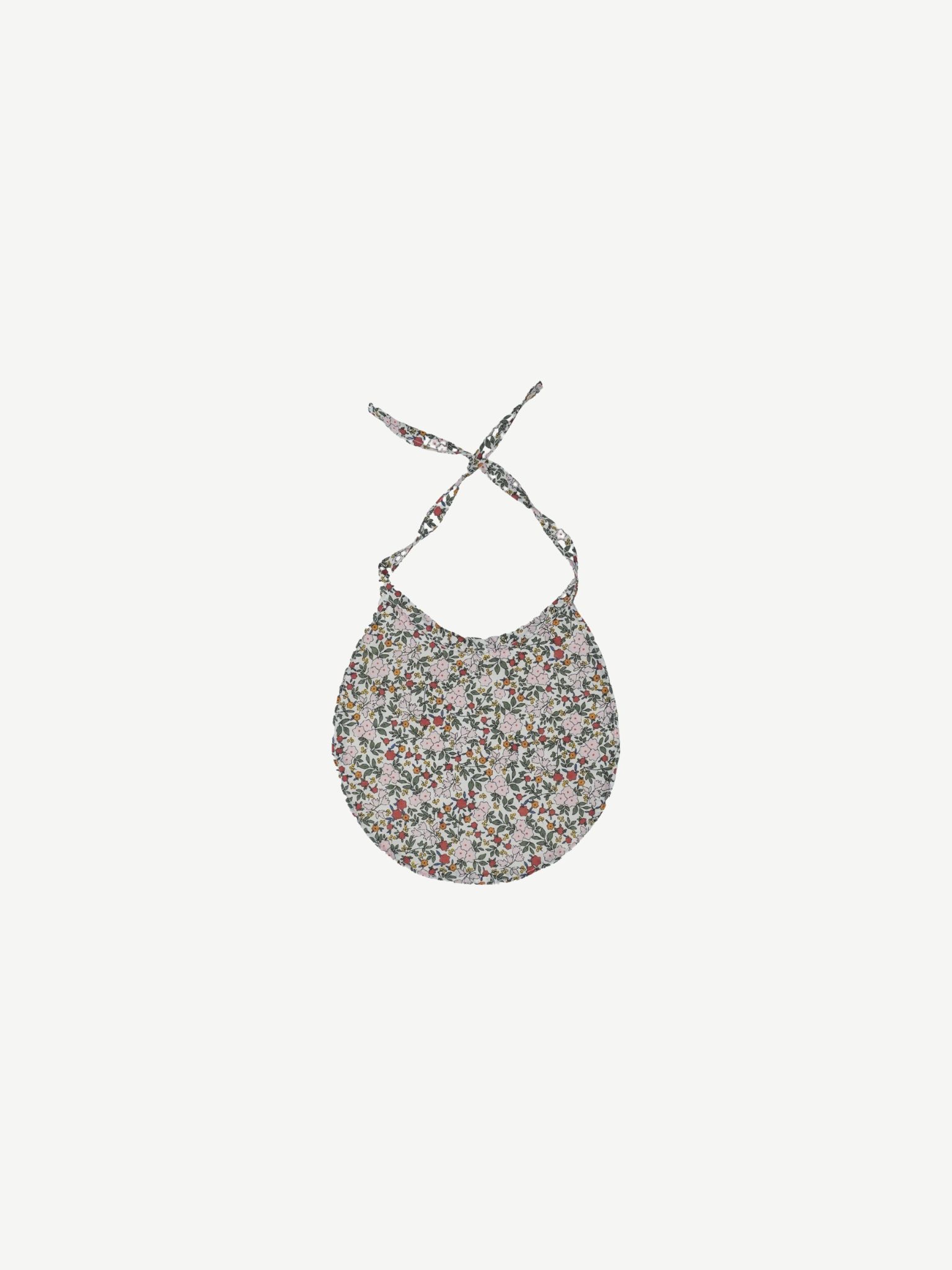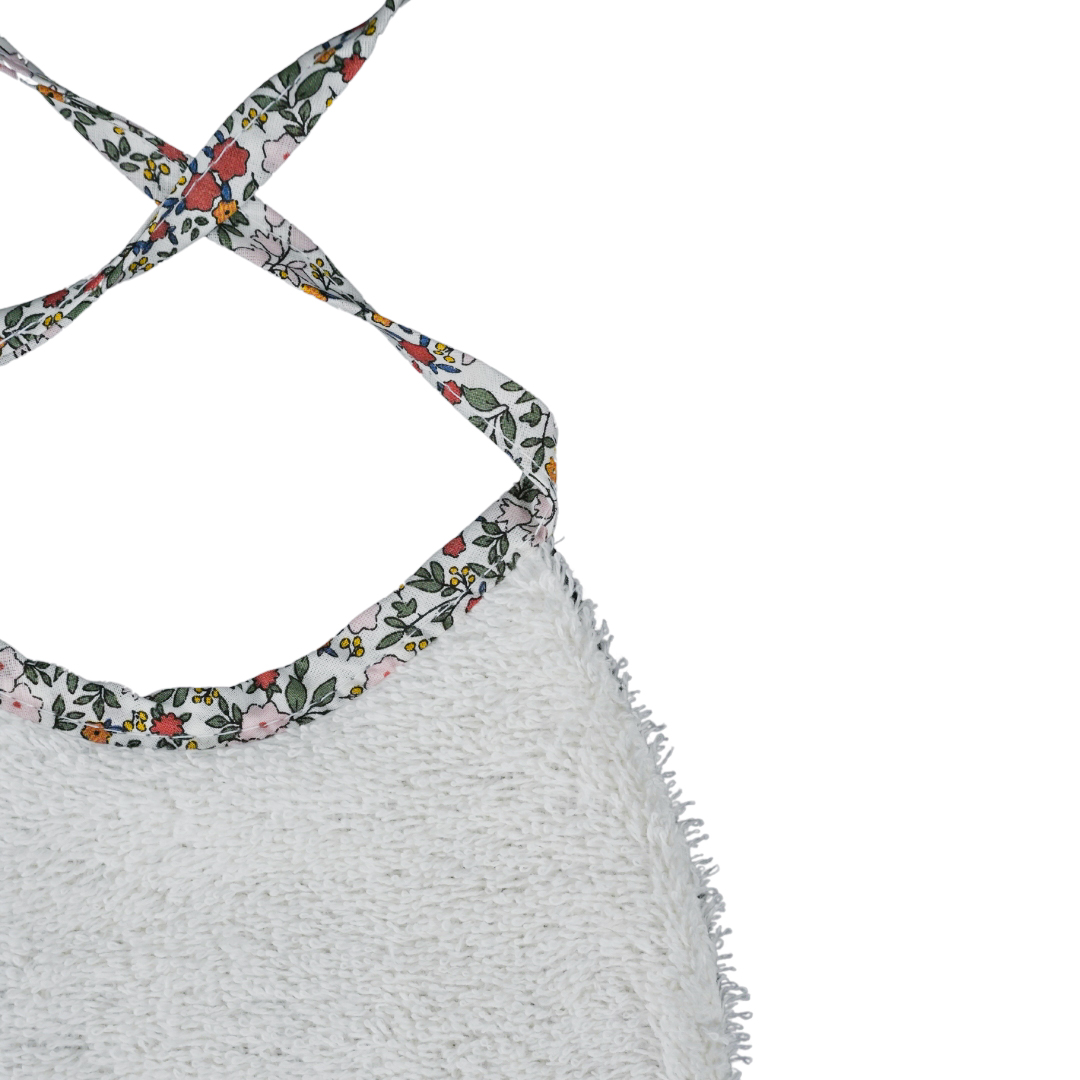 Babero de recien nacido con rizo de Algodón. Se atan al cuello mediante lazo. Talla hasta los 24  meses aprox. Tejido en nuestro Liberty Azuli.
