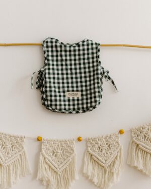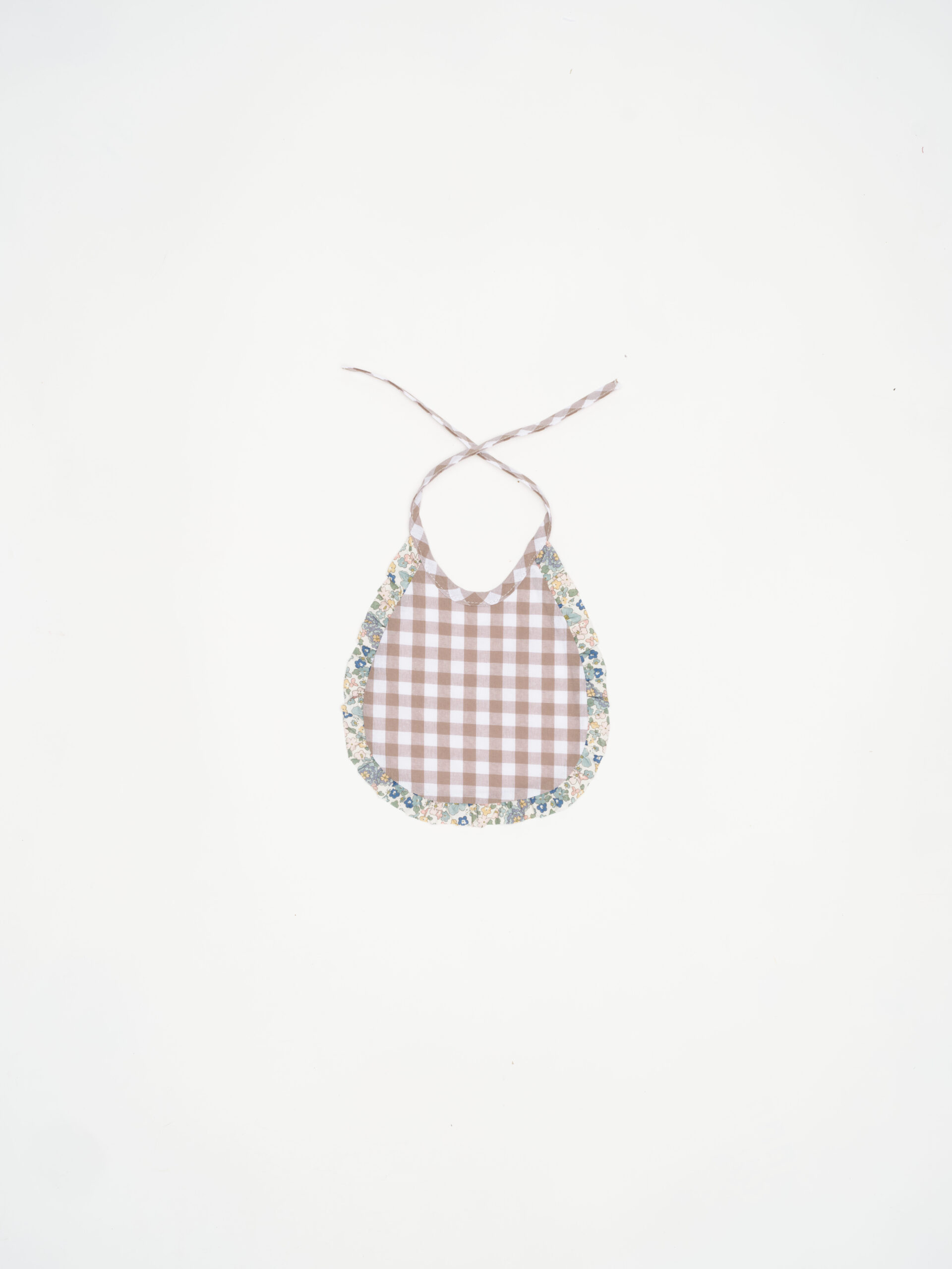 Babero mini vichy beige con volante Mauri, suave y delicado, ideal para los primeros meses del bebé.