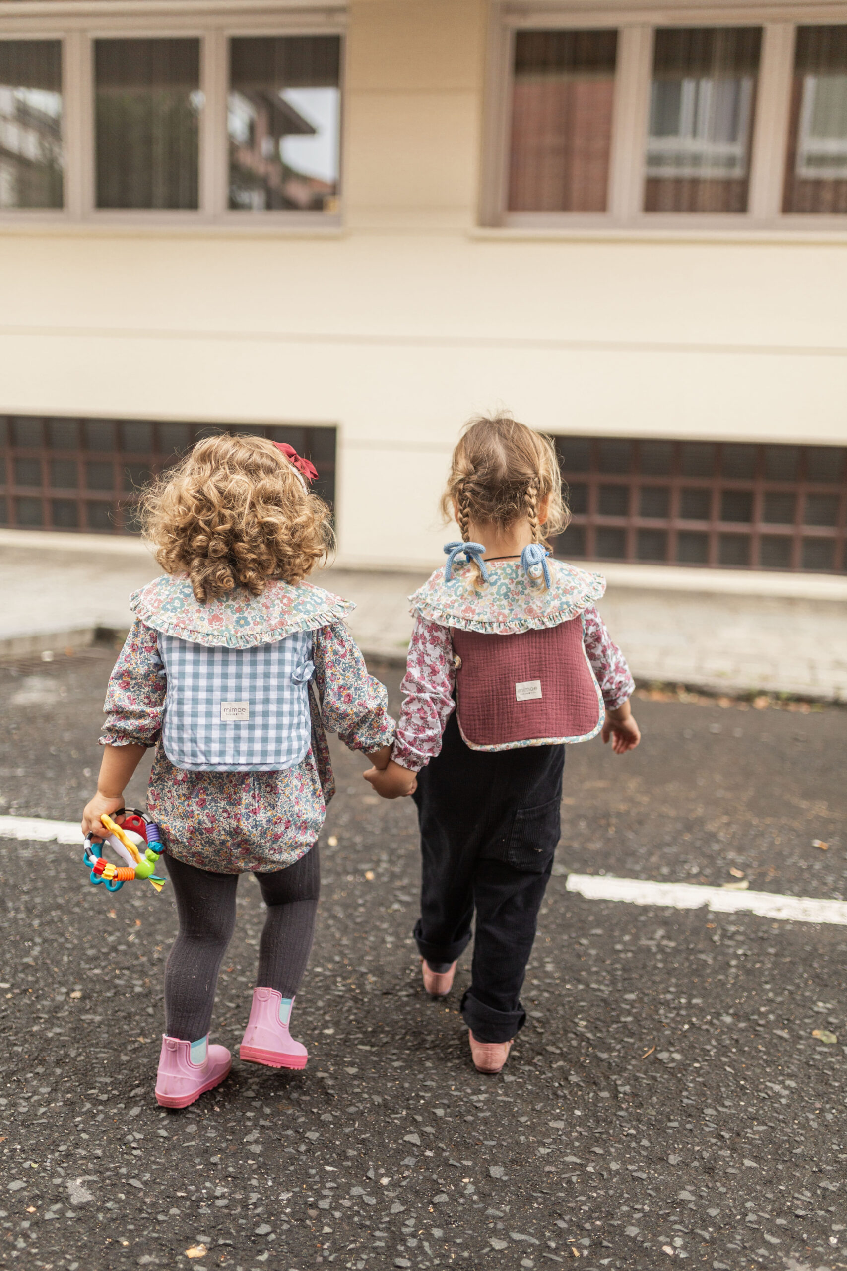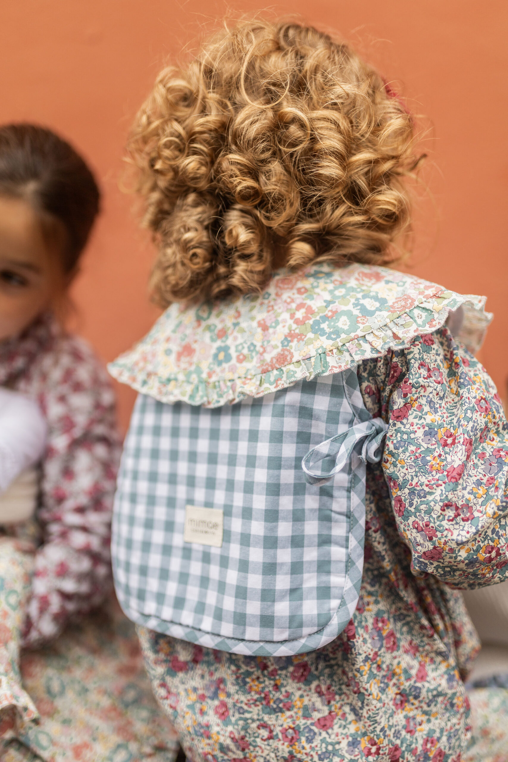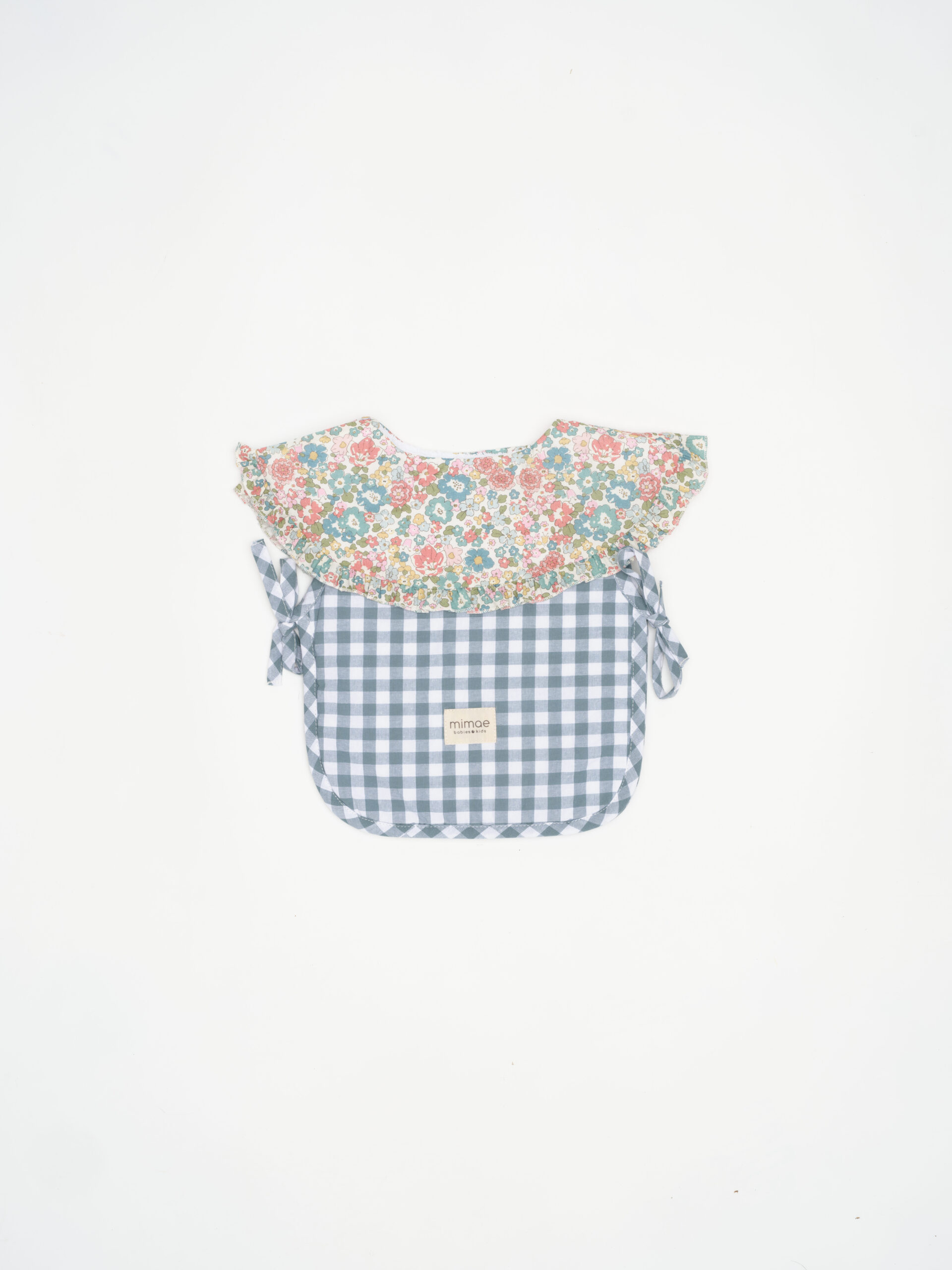 Babero Mimae con cuello y volante estilo  pechera. Forrado en rizo toalla de algodón muy absorbente y suave, se cierra con un velcro en el escote y se adapta a la medida del niño con los lacitos laterales. Desde 6 meses a 4 años. El cuellito esta forrado con algodón organico