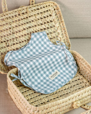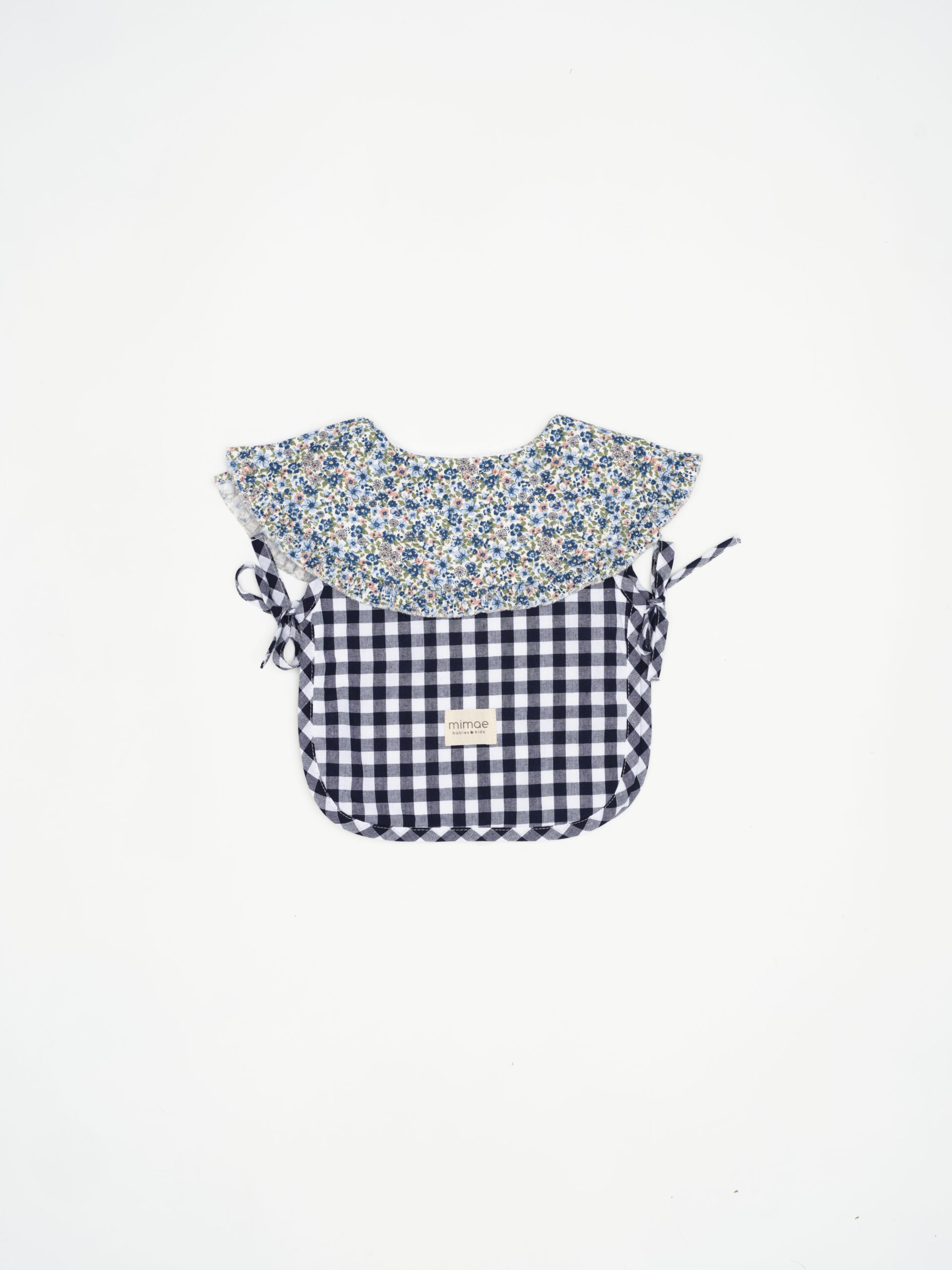 Babero Mimae con cuello y volante estilo  pechera. Forrado en rizo toalla de algodón muy absorbente y suave, se cierra con un velcro en el escote y se adapta a la medida del niño con los lacitos laterales. Desde 6 meses a 4 años. El cuellito esta forrado con algodón organico