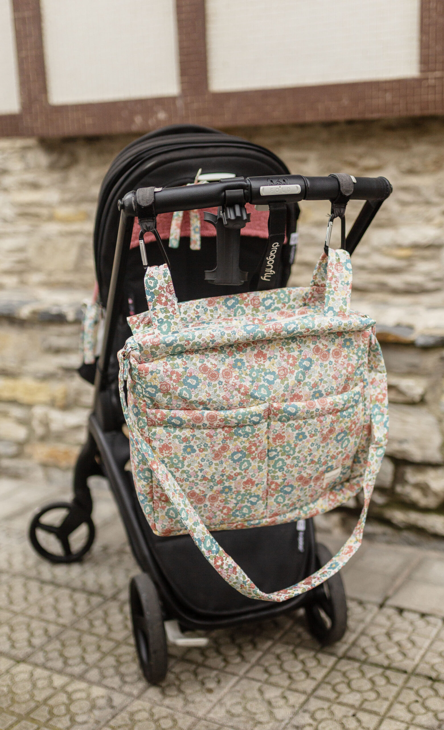 Nuestro bolso Big es ideal para guardar todo lo necesario cuando salimos de paseo. Acolchado con una guata de grosor medio está forrado con un algodón orgánico y se cierra con cremallera. Además entre el forro y la guata tiene un tejido impermeable para que el bolso no se empape si se derrama algún líquido. Tiene dos bolsillos en el exterior y otros dos en el interior para llevar todo bien organizado. Se engancha al carro mediante dos asas con corchetes. . TIENE ASA BANDOLERA.