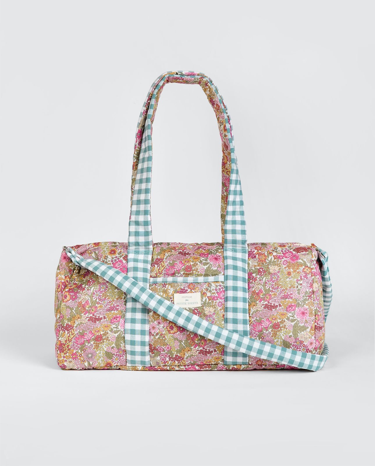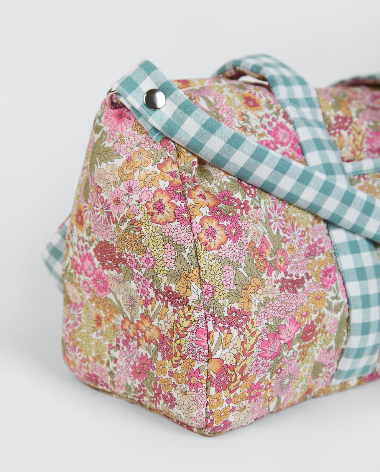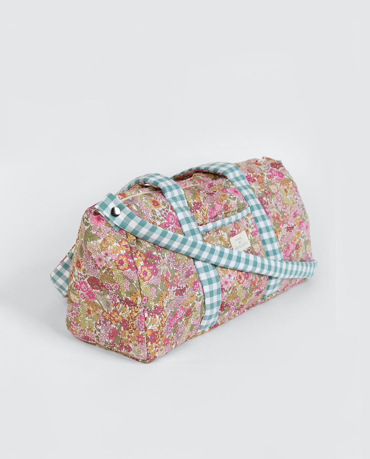 Bolsa de viaje pequeña Liberty Annie confeccionado en tejido Liberty Fabrics original combinado con Vichy Menta. Muy práctica se puede usar para llevarla el fin de semana, para las extraescolares, piscina.. MEDIDAS: 45×22,5×15