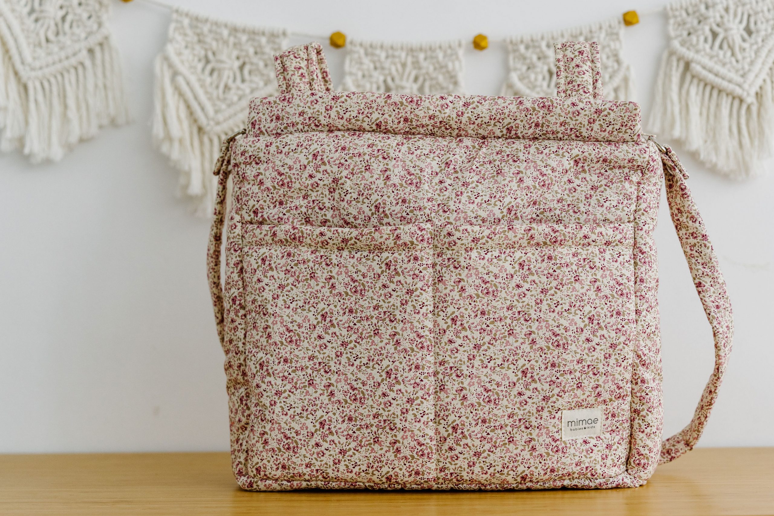 Nuestro bolso Big es ideal para guardar todo lo necesario cuando salimos de paseo. Acolchado con una guata de grosor medio está forrado con un algodón orgánico y se cierra con cremallera. Además entre el forro y la guata tiene un tejido impermeable para que el bolso no se empape si se derrama algún líquido. Tiene dos bolsillos en el exterior y otros dos en el interior para llevar todo bien organizado. Se engancha al carro mediante dos asas con corchetes. Estampado Liberty Nikole en tonos rosas. TIENE ASA BANDOLERA