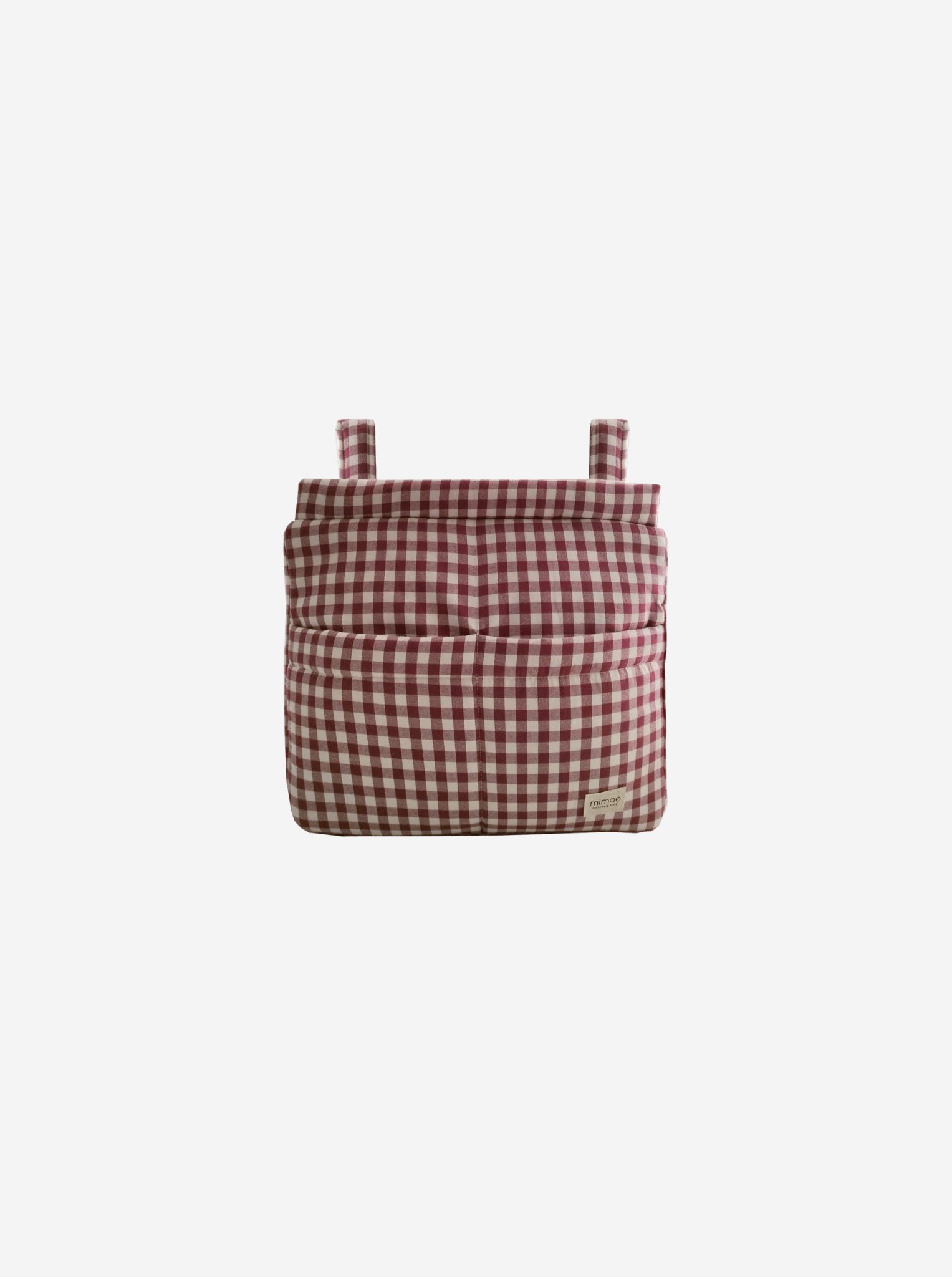 Nuestro bolso Big es ideal para guardar todo lo necesario cuando salimos de paseo. Acolchado con una guata de grosor medio está forrado con un algodón orgánico y se cierra con cremallera. Además entre el forro y la guata tiene un tejido impermeable para que el bolso no se empape si se derrama algún líquido. Tiene dos bolsillos en el exterior y otros dos en el interior para llevar todo bien organizado. Se engancha al carro mediante dos asas con corchetes. Estampado Vichy Granate