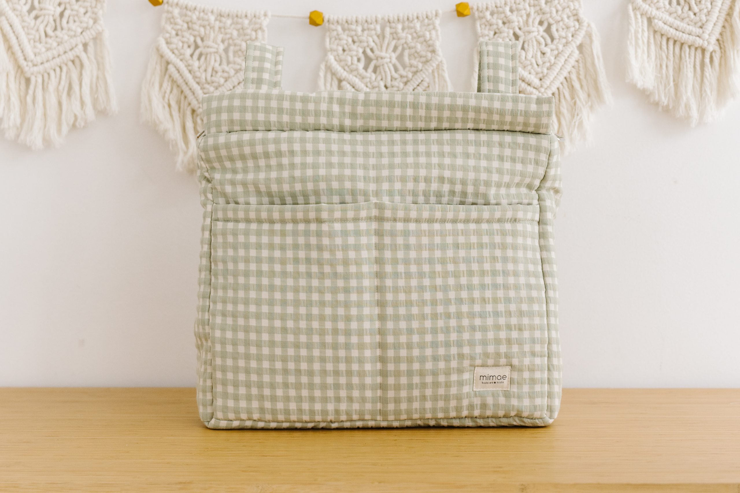 Nuestro bolso Big es ideal para guardar todo lo necesario cuando salimos de paseo. Acolchado con una guata de grosor medio está forrado con un algodón orgánico y se cierra con cremallera. Además entre el forro y la guata tiene un tejido impermeable para que el bolso no se empape si se derrama algún líquido. Tiene dos bolsillos en el exterior y otros dos en el interior para llevar todo bien organizado. Se engancha al carro mediante dos asas con corchetes. Estampado Vichy Musgo.