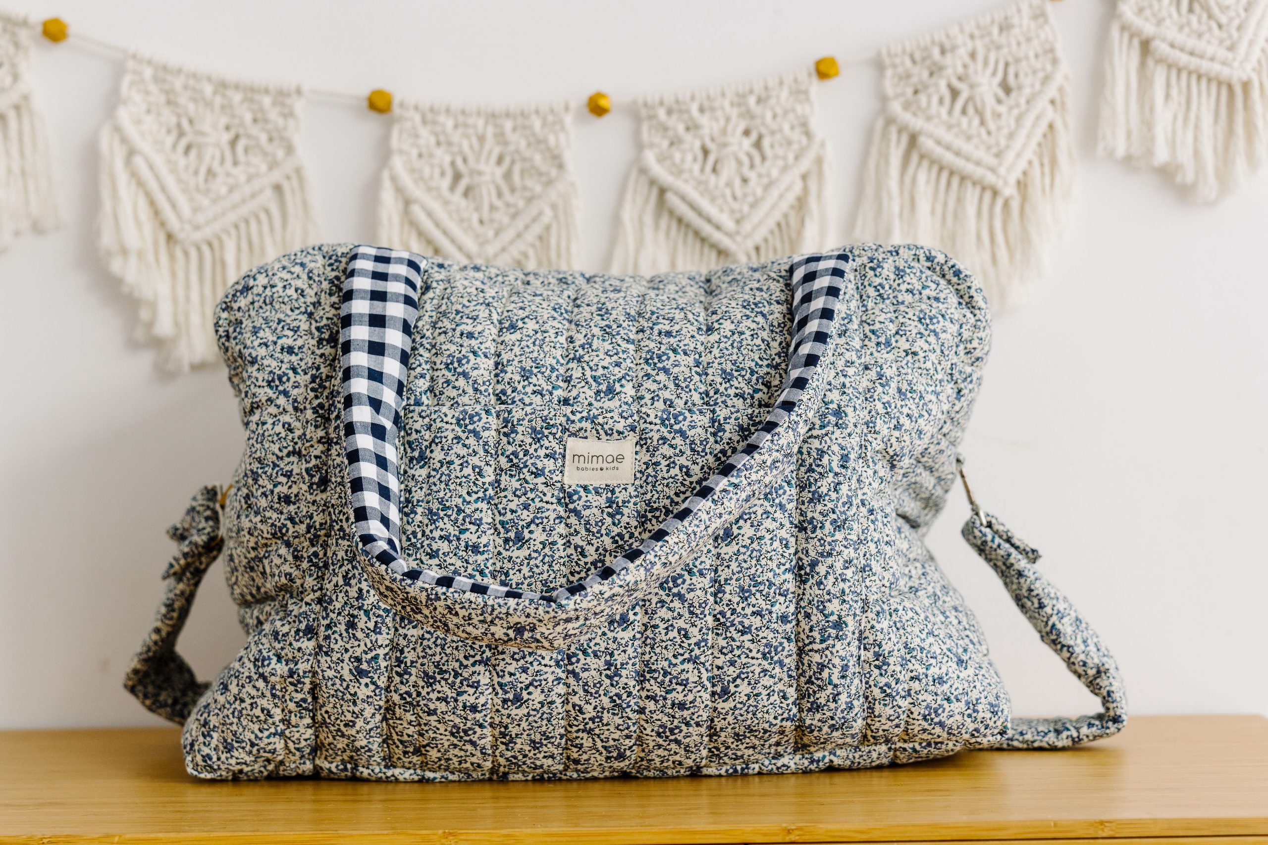 Bolsa de maternidad o fin de semana tiene un tamaño perfecto para guardar todo lo necesario para llevar al hospital o también para usarla en vuestros viajes en familia. Muy practica gracias a su doble asa enguatada y la tira bandolera de quitar y poner mediante garfios metálicos. Totalmente acolchada, tiene una guata de grosor medio para que mantenga bien la forma. Forrada con algodón 100%, tiene un bolsillo platón en la parte exterior y cuatro en el interior. Exterior en estampado Liberty Paul, asas en contrate en tejido Vichy Navy.