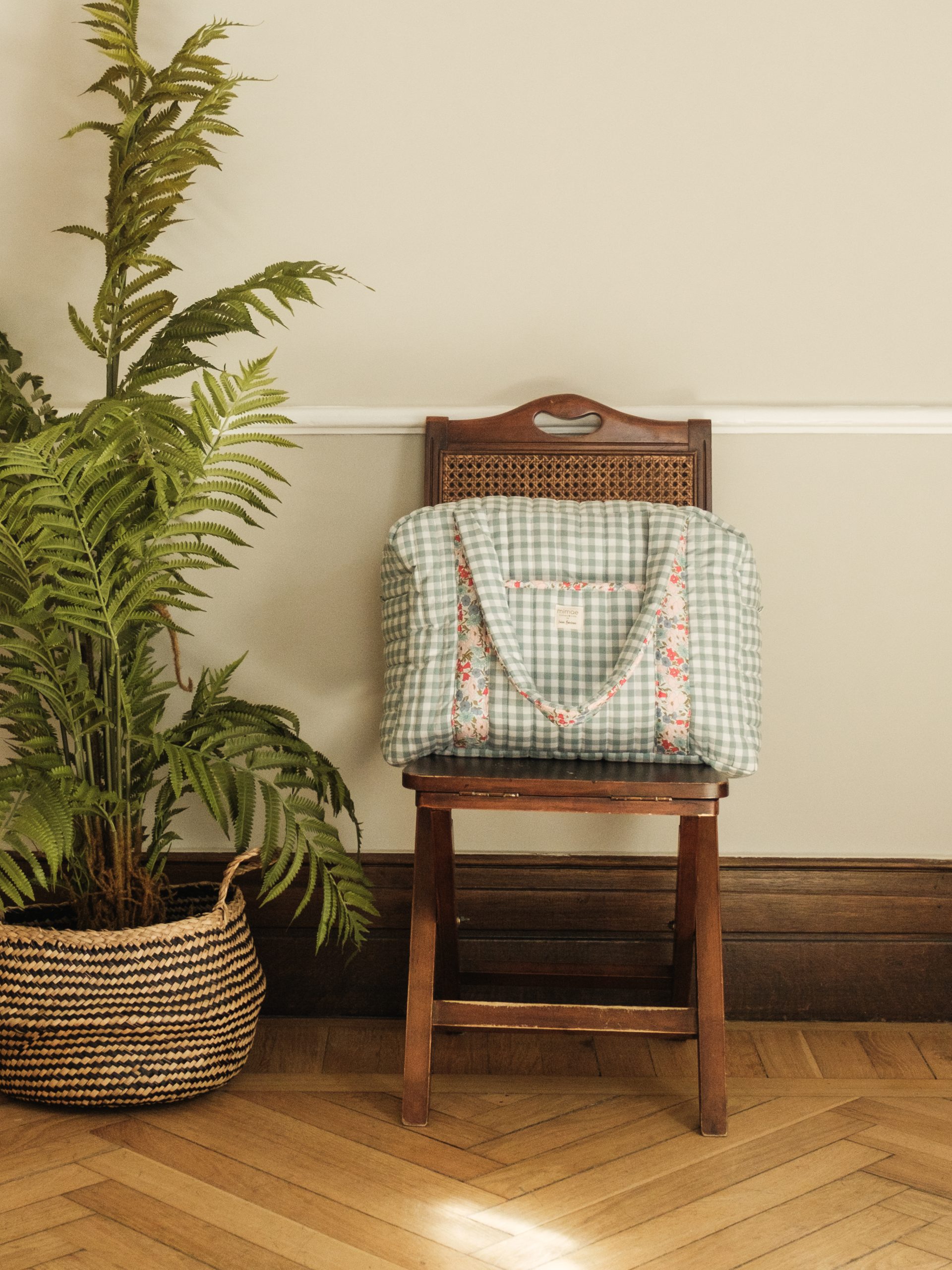Bolsa de maternidad o fin de semana tiene un tamaño perfecto para guardar todo lo necesario para llevar al hospital o también para usarla en vuestros viajes en familia. Muy practica gracias a su doble asa enguatada y la tira bandolera de quitar y poner mediante garfios metálicos. Totalmente acolchada, tiene una guata de grosor medio para que mantenga bien la forma. Forrada con algodón 100%, tiene un bolsillo plastón en la parte exterior y cuatro en el interior. Exterior en Vichy menta, asas en contrate en Liberty Lucía. Confeccionado con estampado Liberty London Original, diseño by Lucía Bárcena