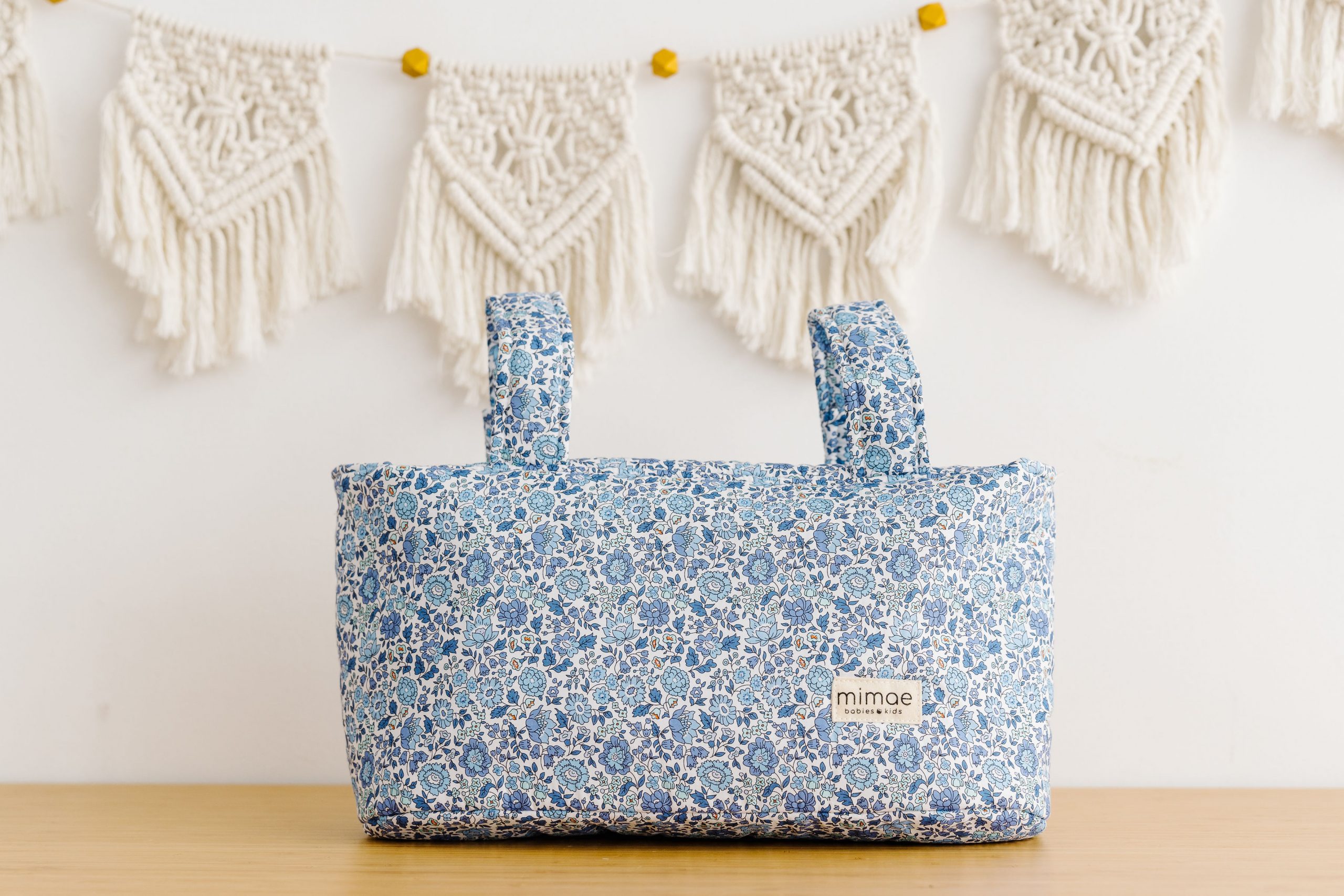 Nuestro bolso mini es super cómodo y practico para llevar lo imprescindible. Acolchados con una guata de grosor medio, están forrados con algodón orgánico y se cierra con cremallera. Además entre el forro y la guata tiene un tejido impermeable para que el bolso no se empape si se derrama algún líquido. Tejido Liberty Azuli en tonos azules y menta. Recomendamos colgarlo de los ganchos para mayor durabilidad.
