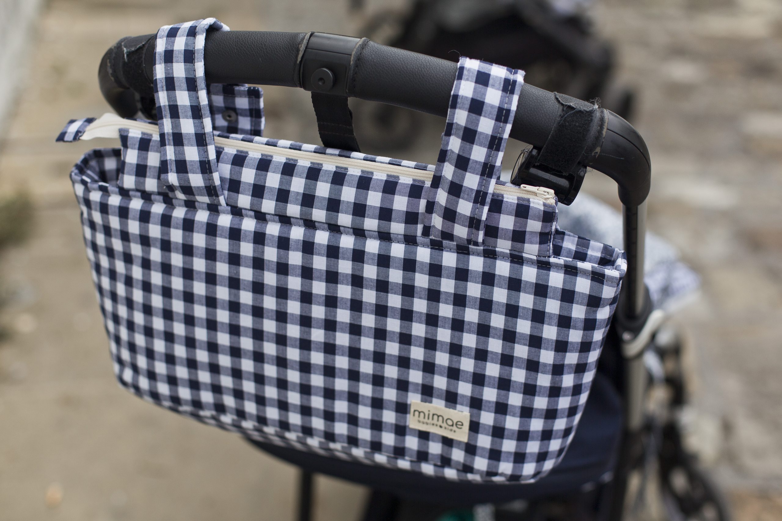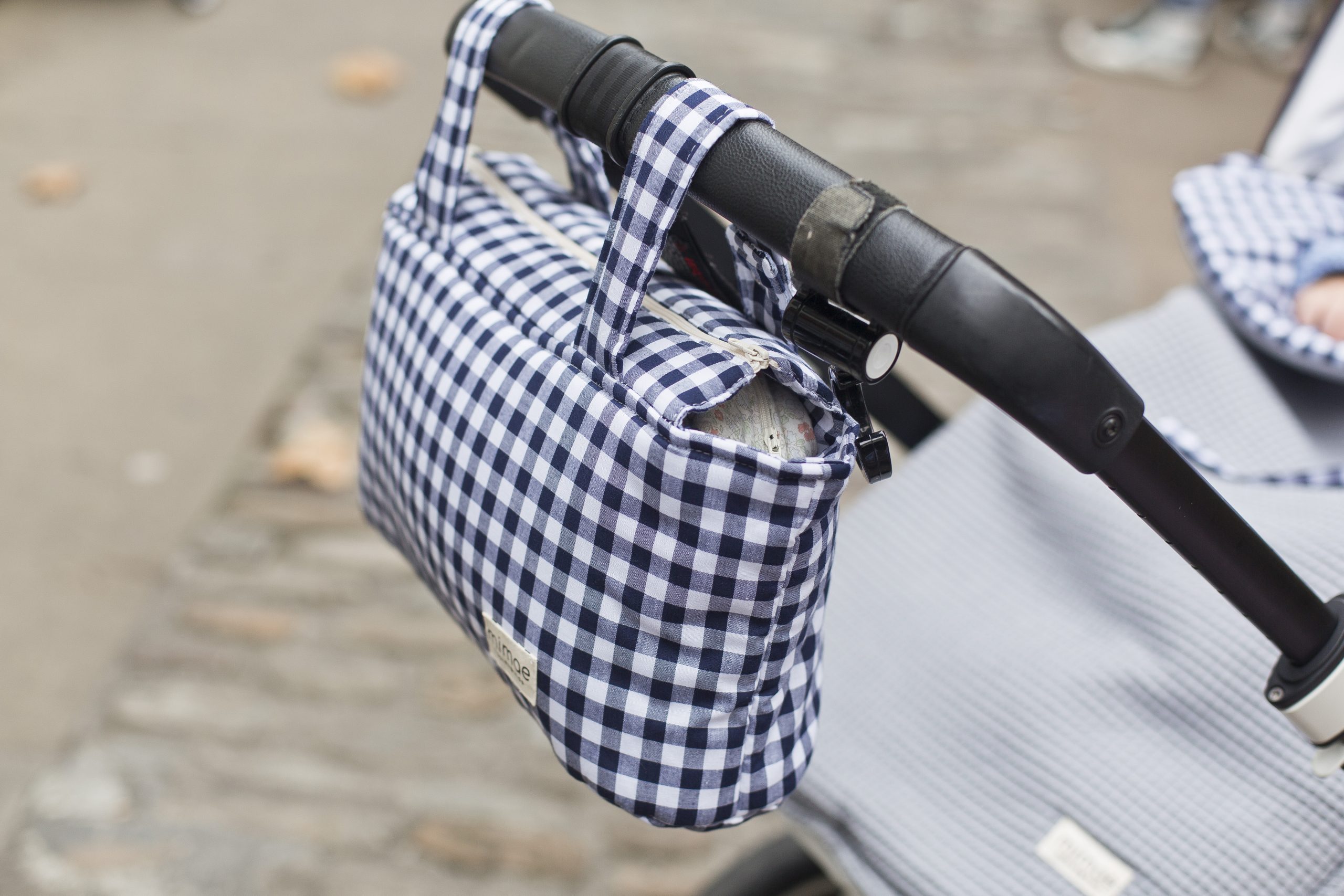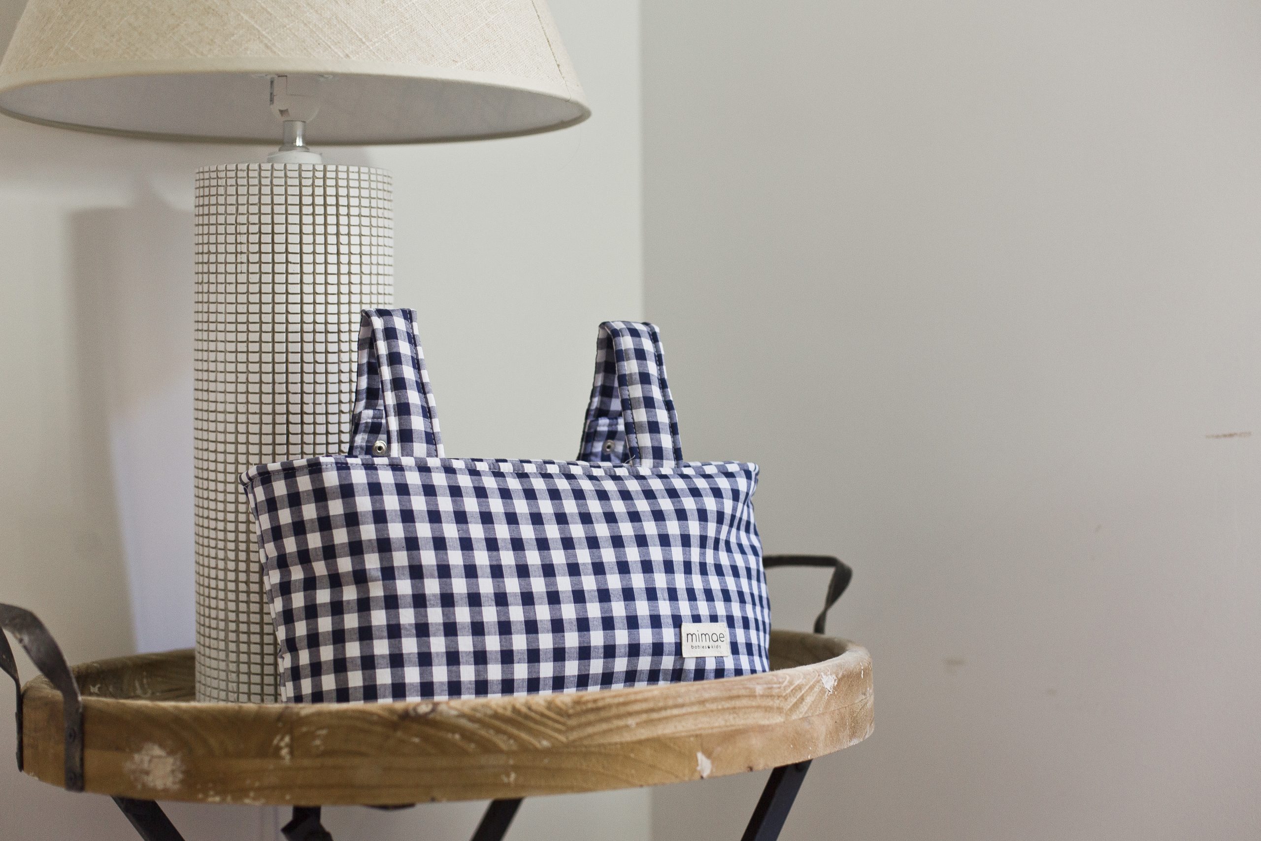 Nuestro bolso mini es super cómodo y practico para llevar lo imprescindible. Acolchados con una guata de grosor medio, están forrados con  algodón orgánico y se cierra con cremallera. Además entre el forro y la guata tiene un tejido impermeable para que el bolso no se empape si se derrama algún líquido. Tejido Vichy de algodón en colores azul marino y blanco.