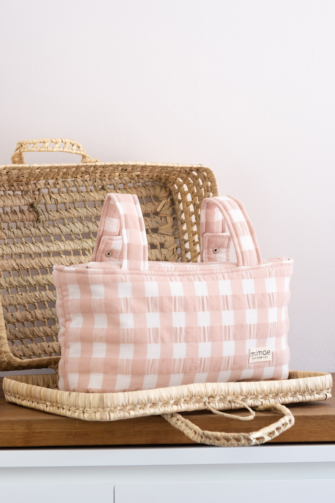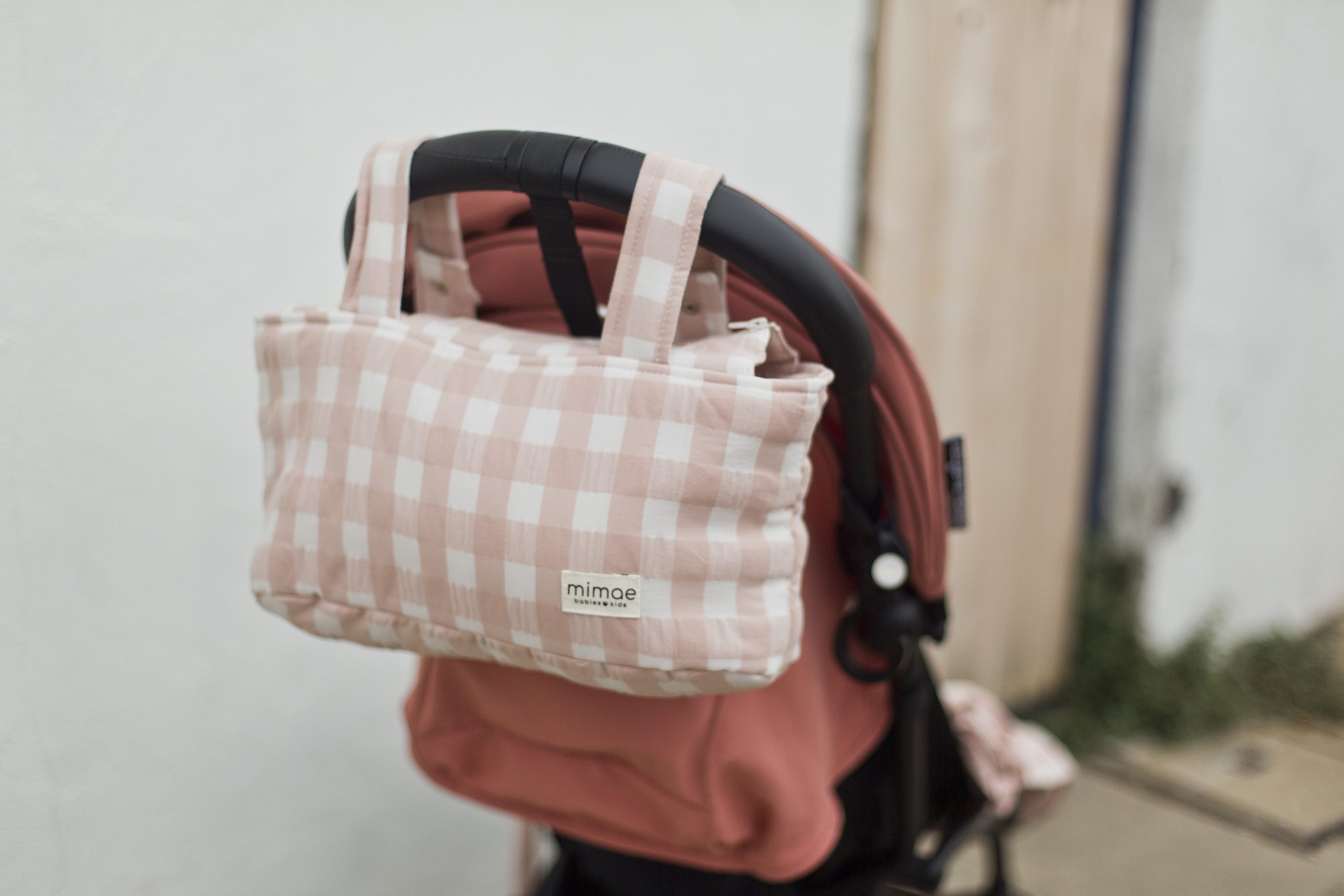 Nuestro bolso mini es super cómodo y practico para llevar lo imprescindible. Acolchados con una guata de grosor medio, están forrados con algodón orgánico y se cierra con cremallera. Además entre el forro y la guata tiene un tejido impermeable para que el bolso no se empape si se derrama algún líquido. Tejido Vichy Rosa. Recomendamos usarlo colgado de los ganchos para mayor durabilidad.