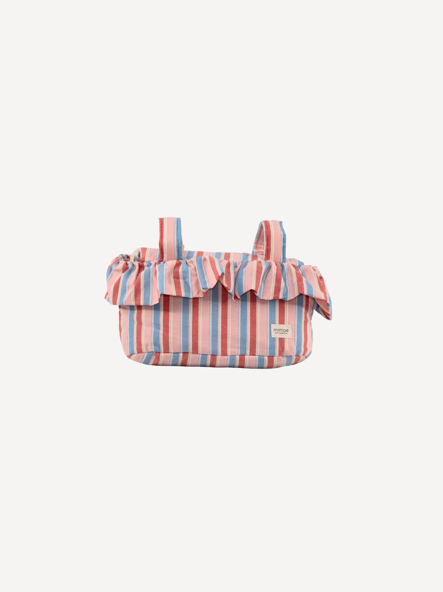 Nuestro bolso mini volante estampado de rayas es super cómodo y practico para llevar lo imprescindible. Acolchados con una guata de grosor medio, están forrados con algodón orgánico y se cierra con cremallera. Además entre el forro y la guata tiene un tejido impermeable para que el bolso no se empape si se derrama algún líquido. Tejido estampado rayas strawberry&dream