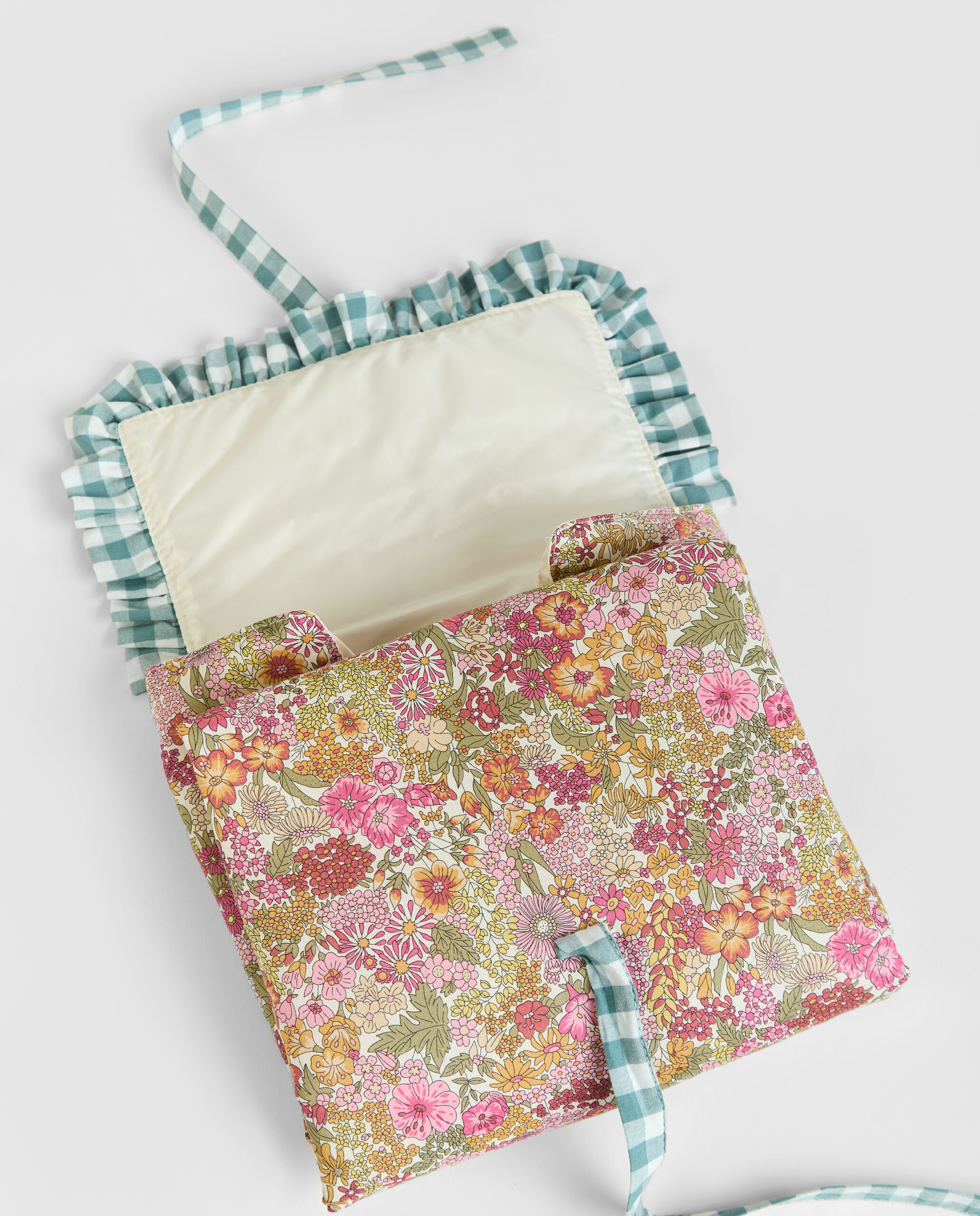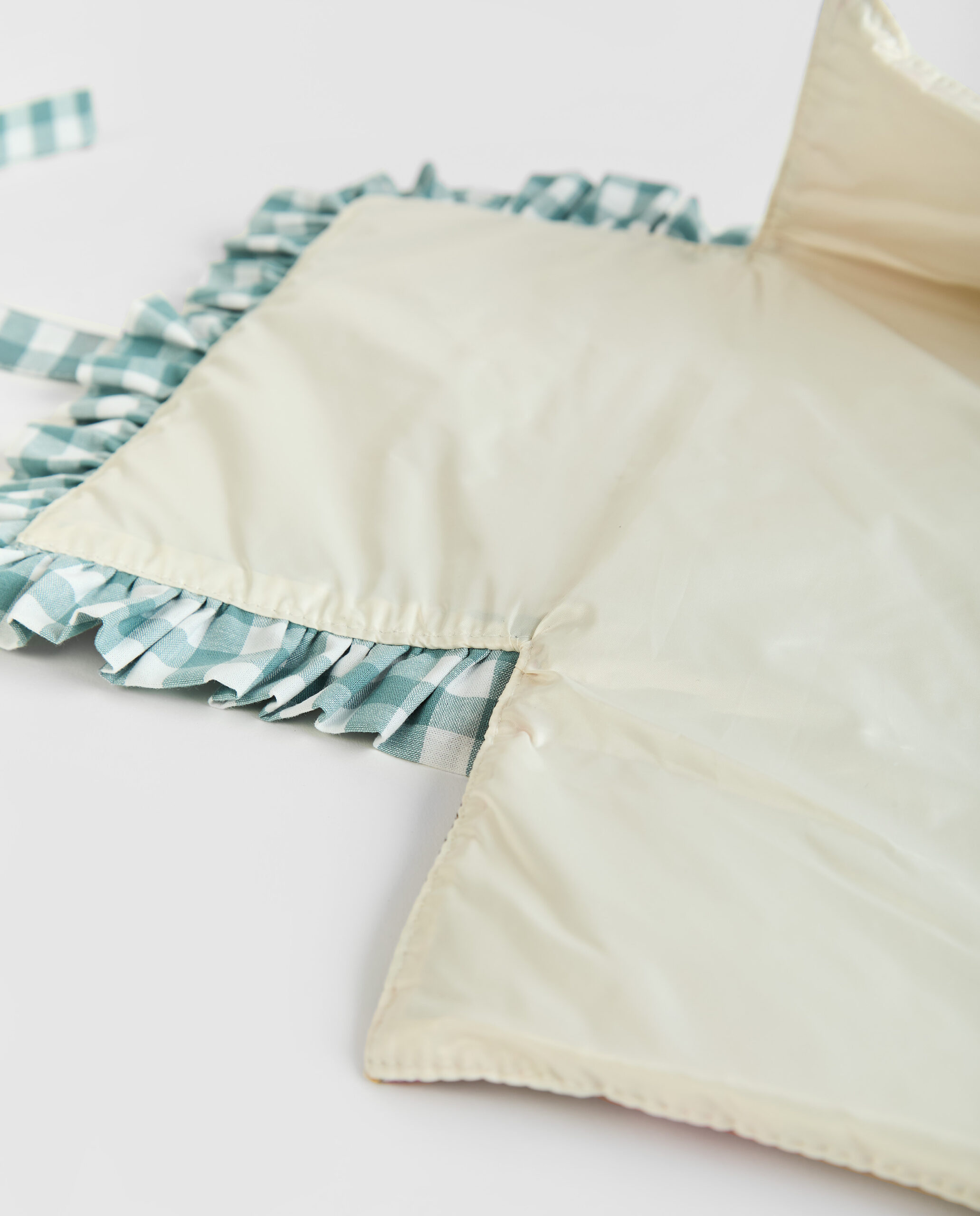 Cambiador de viaje Liberty Annie. Está confeccionado con el tejido Liberty Fabrics original y volante Vichy Menta. Relleno de una guata mullidita, ideales para proteger a tu bebe. Forrado con un tejido impermeable súper agradable al tacto y fácil de limpiar. TAMAÑO: 17cm x 22cm. cerrado / 64cm x 44cm. abierto.