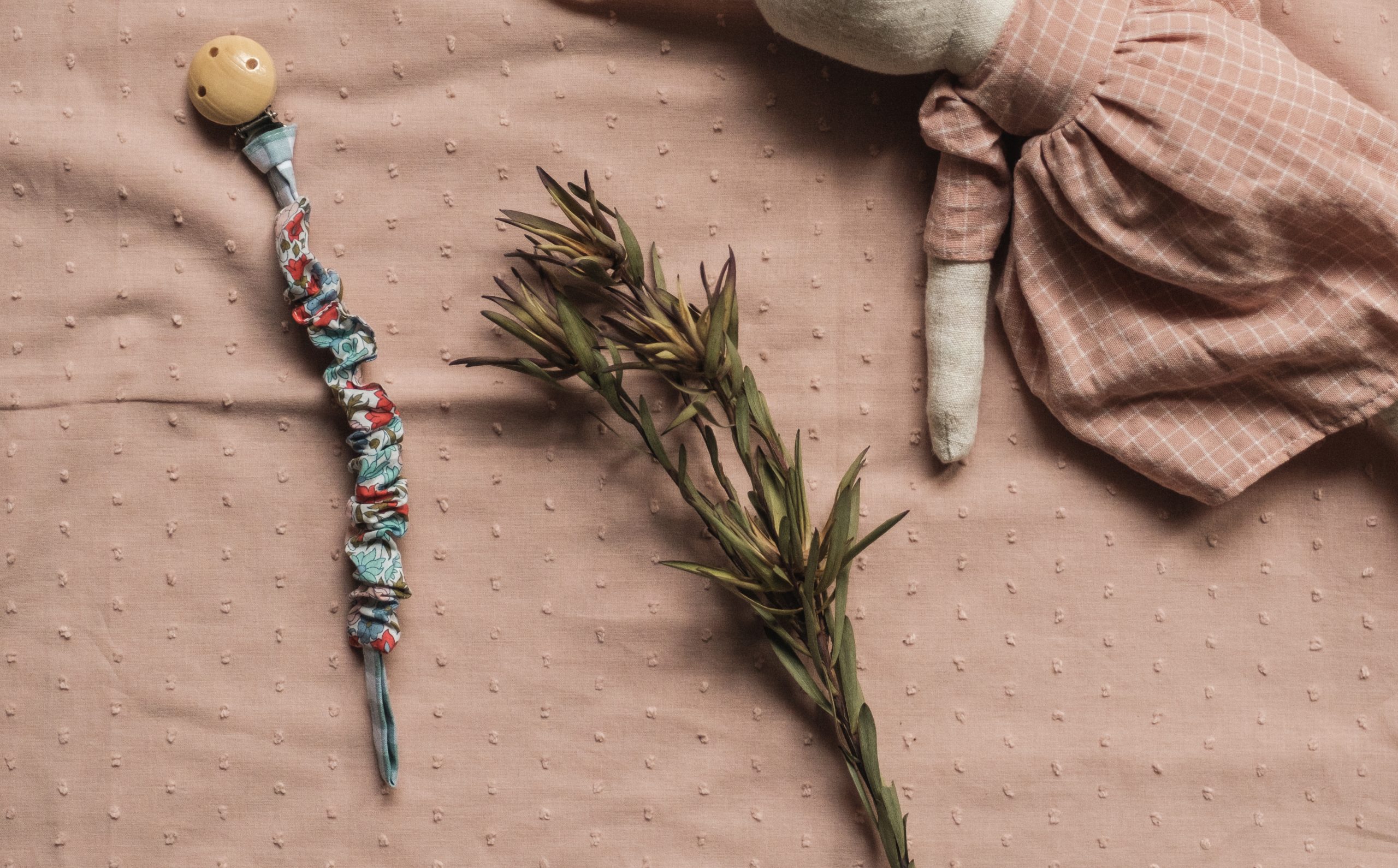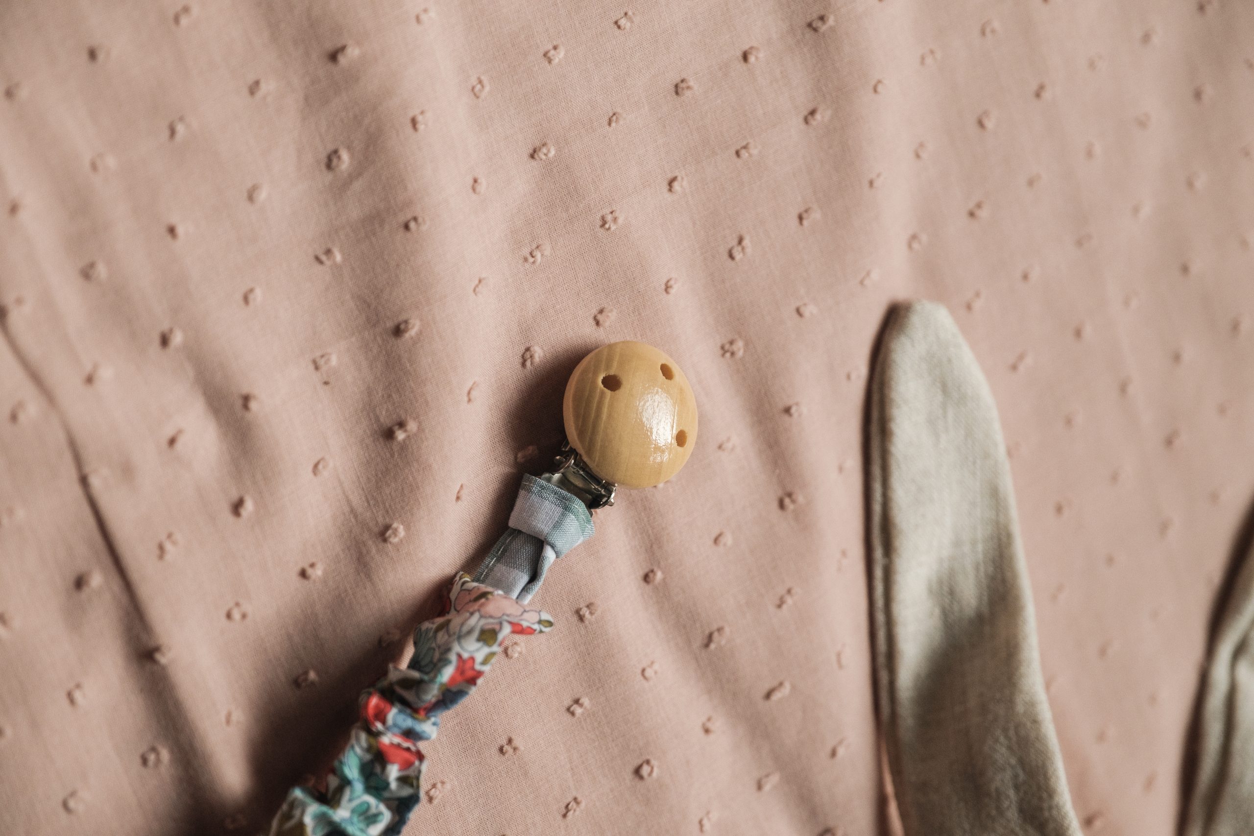Chupetero confeccionado en tejido de algodón con un clip de madera natural. Súper practico para tener siempre el chupete cerca de tu bebe. Diseño by Lucía Bárcena