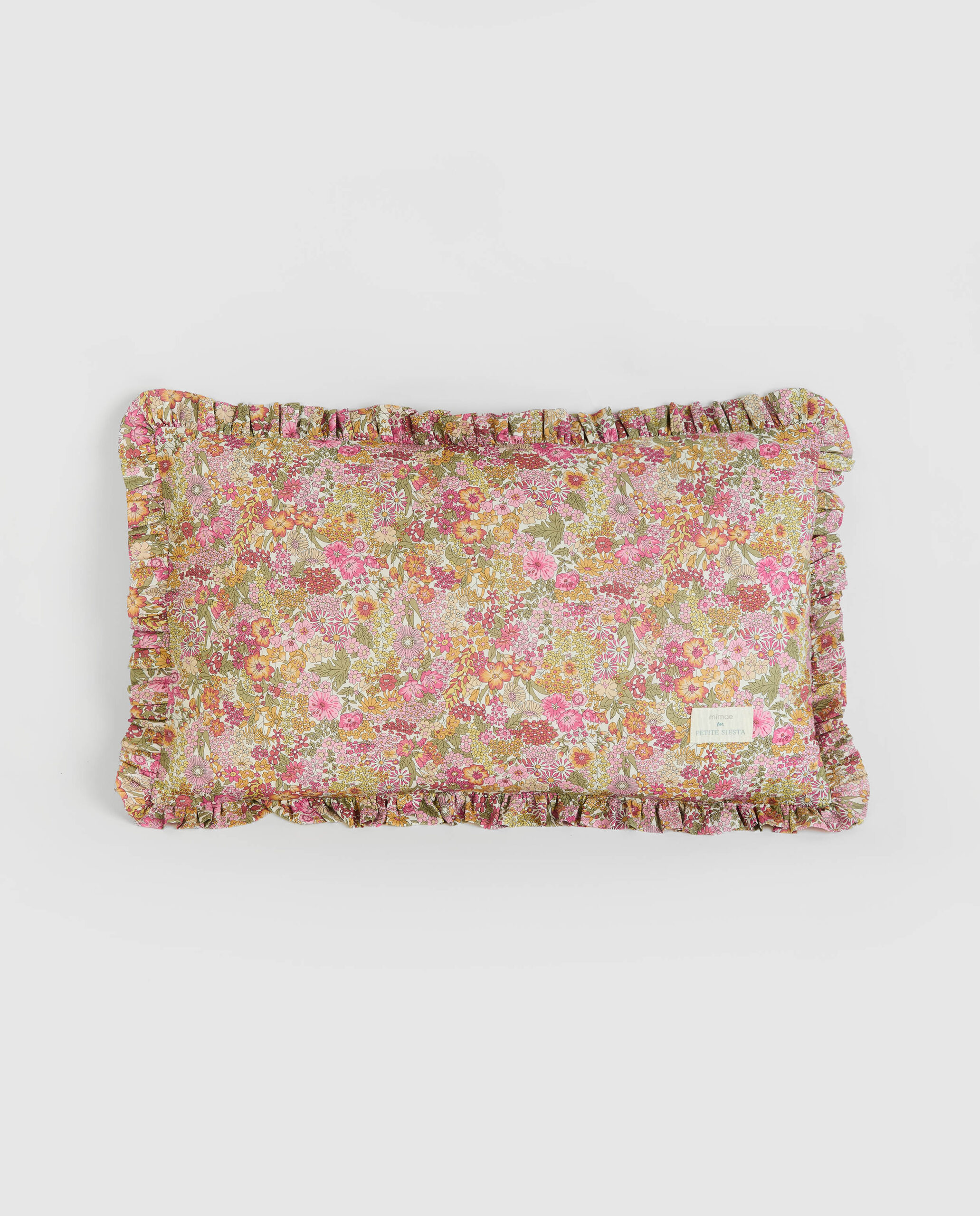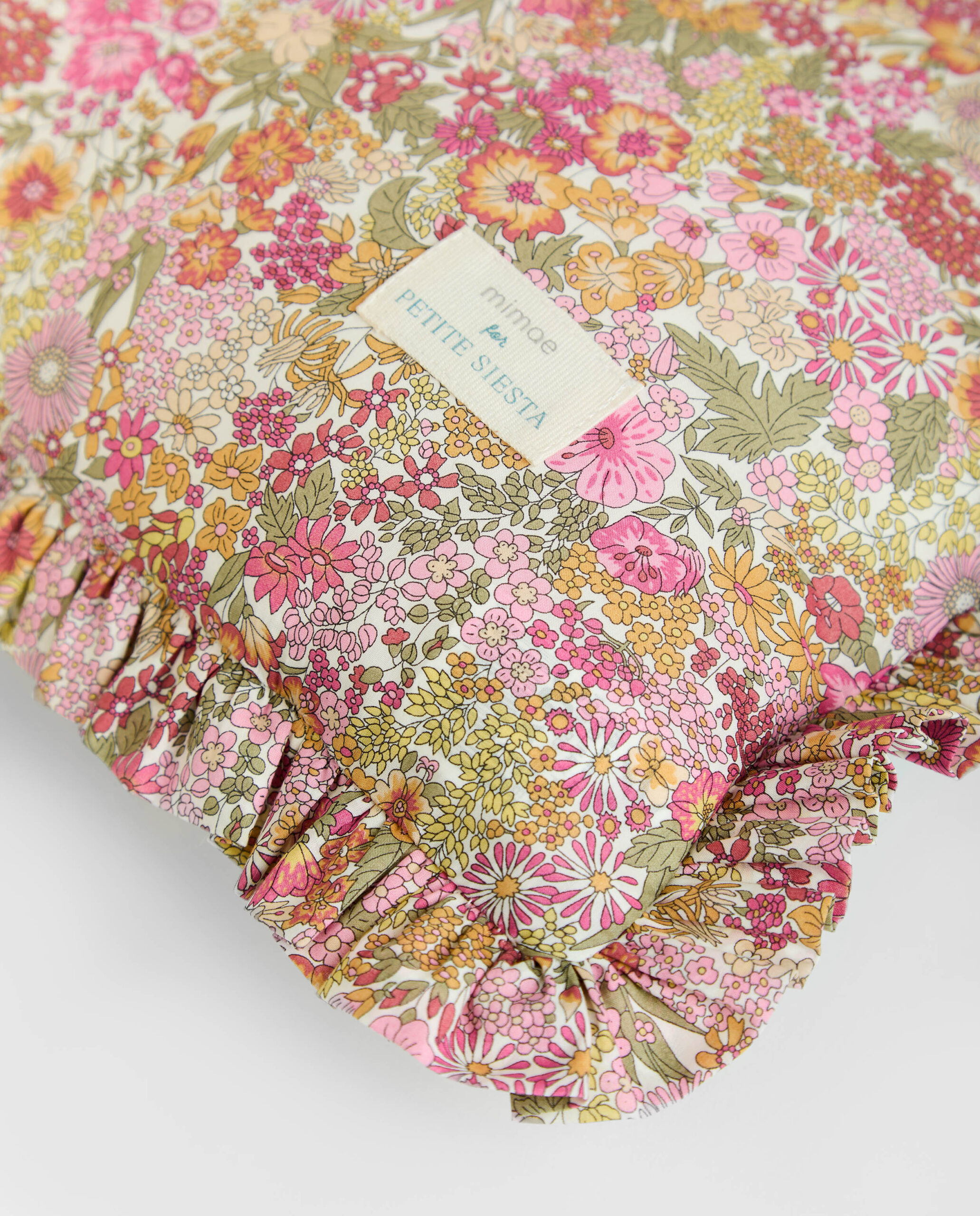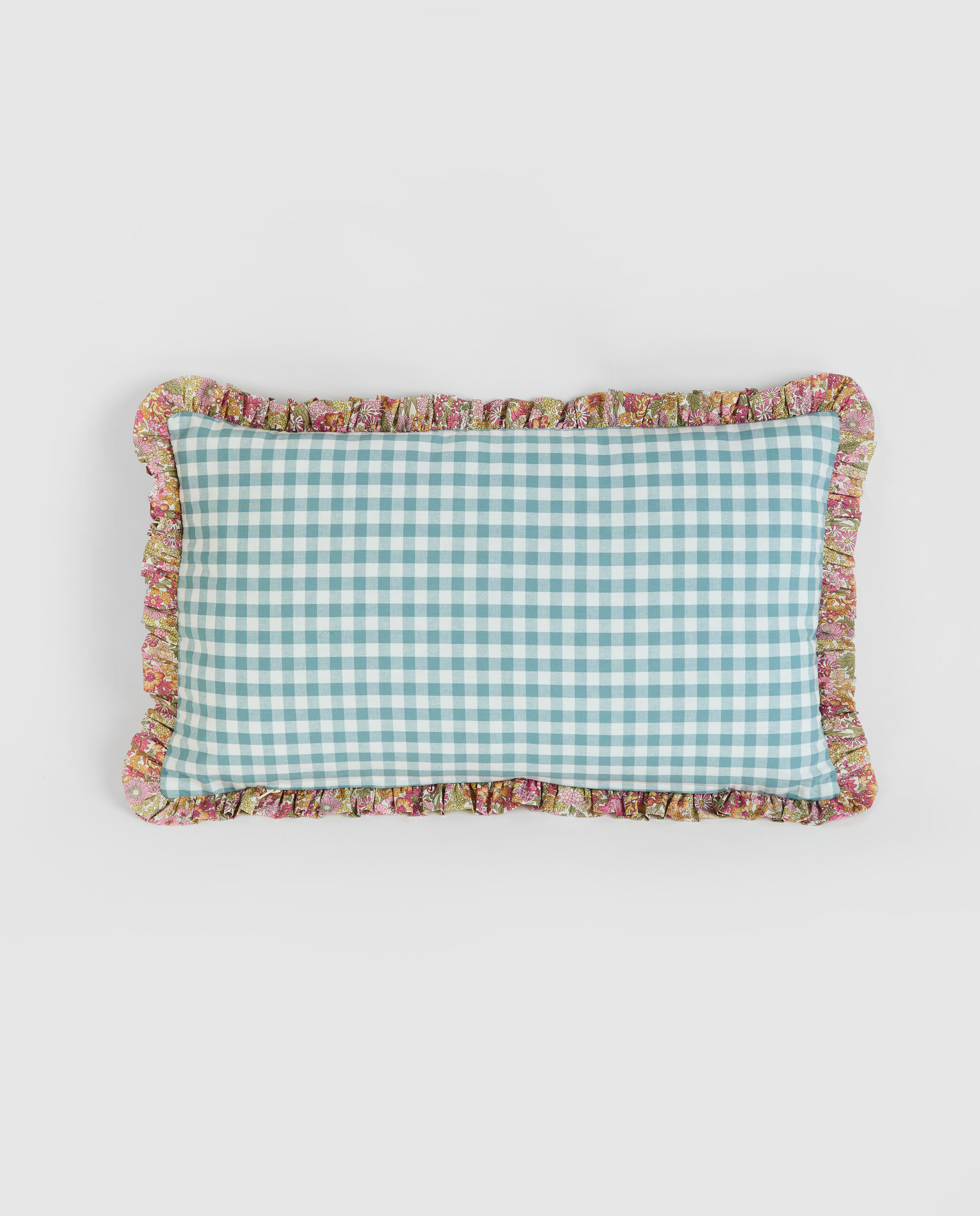 Cojin en estampado Liberty Annie con tejido Liberty Fabrics original y Vichy Menta. Con volante fruncido todo alrededor, abertura con cremallera. TAMAÑO: 30cm x 50cm RELLENO INCLUIDO