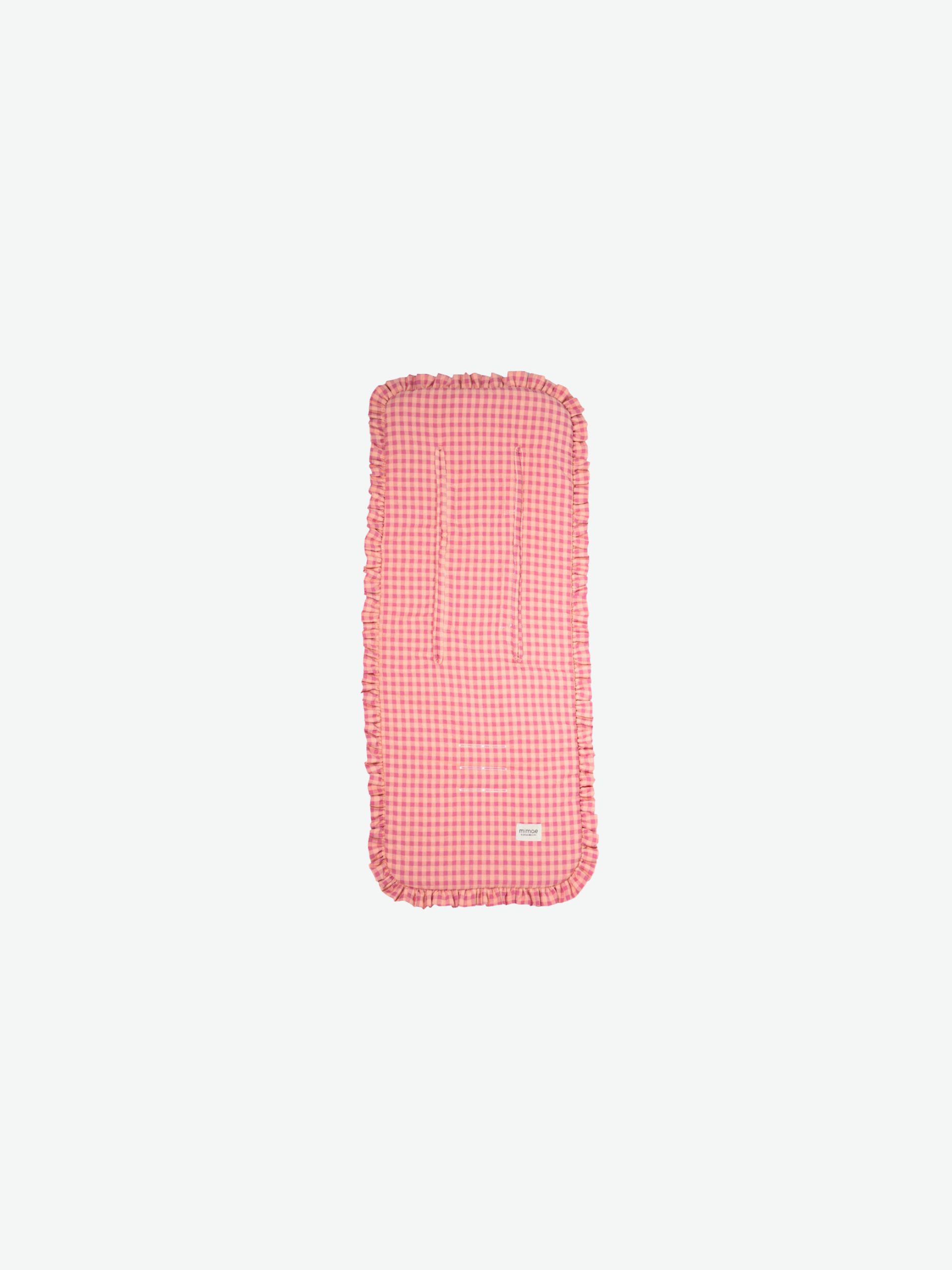 Colchoneta universal para sillas de paseo. Mulliditas tienen una guata de grosor medio y el trasero en tejido Maya 3D acolchado y transpirable. Tienen dos ojales verticales y tres ojales horizontales  para que puedan adaptarse a diferentes tipos de silla. Sistema de enganche mediante goma y lazos. Estampado vichy strawberry.