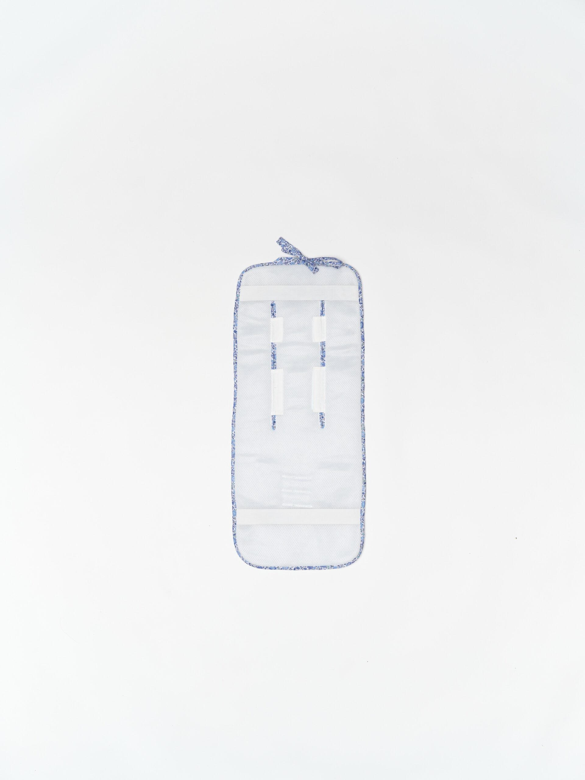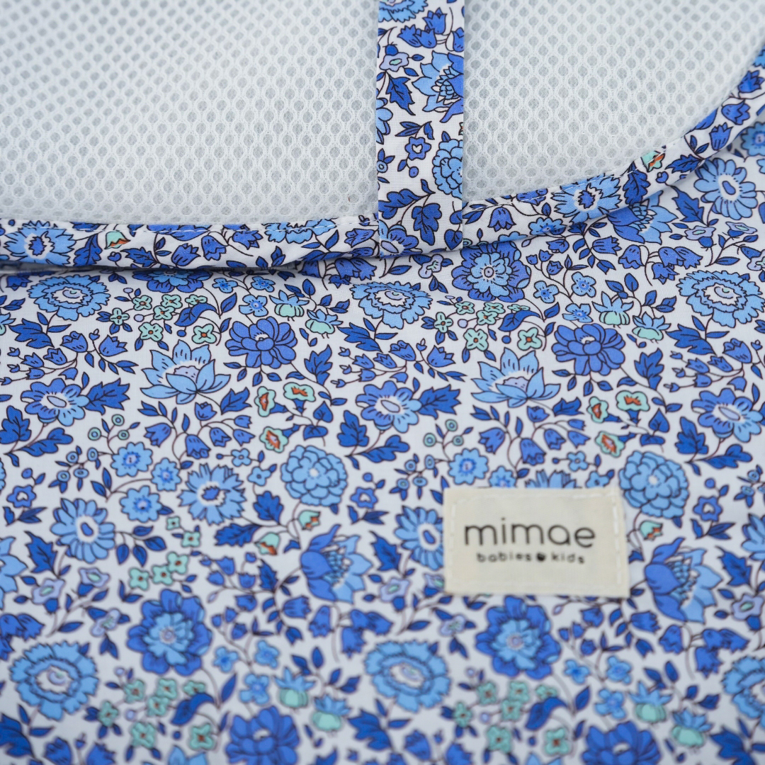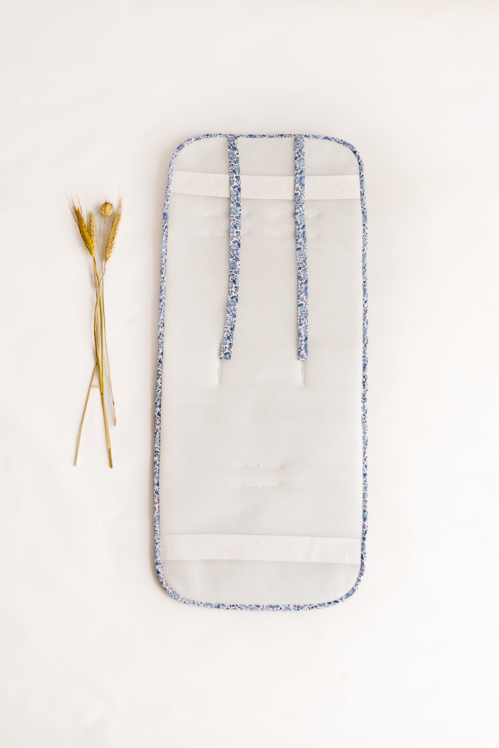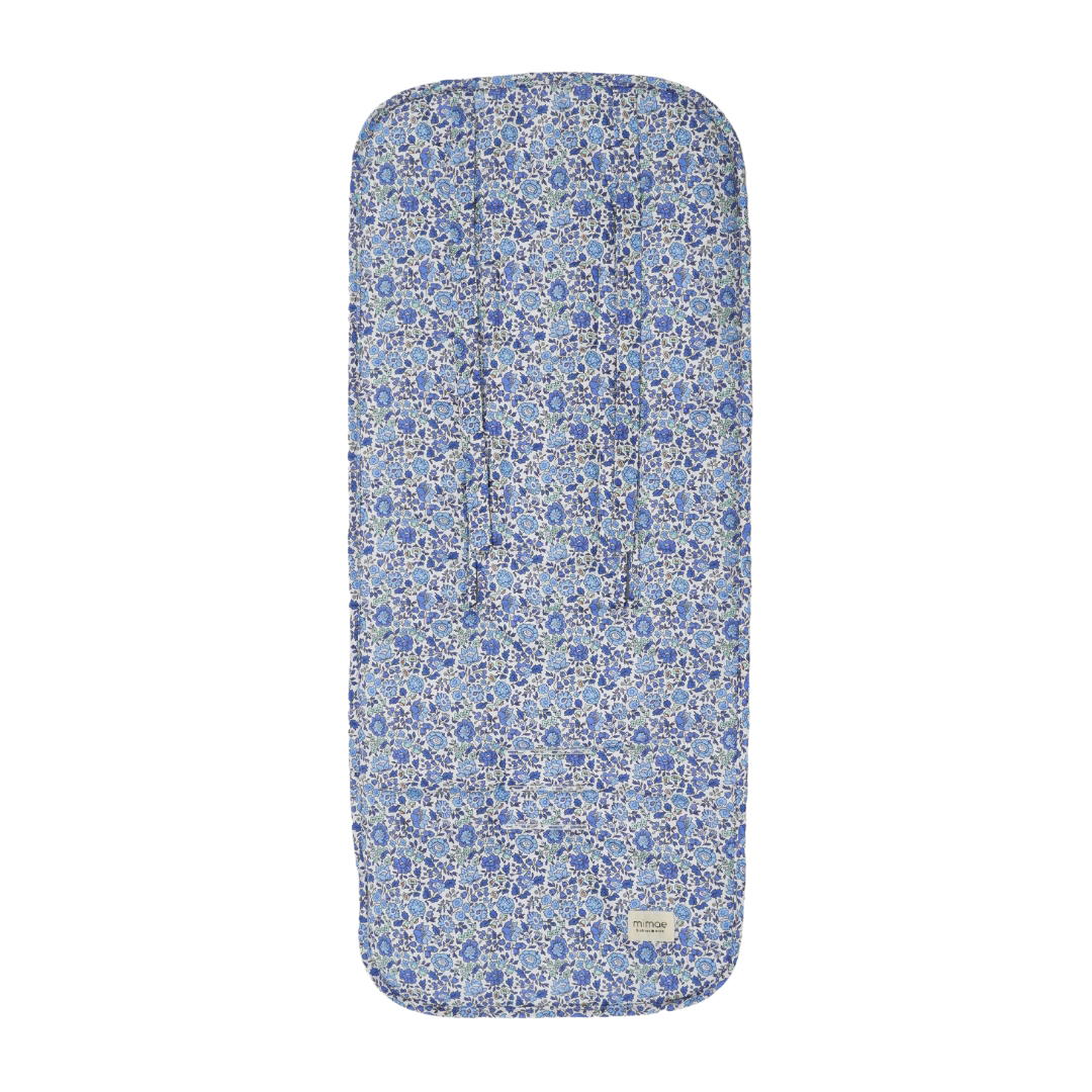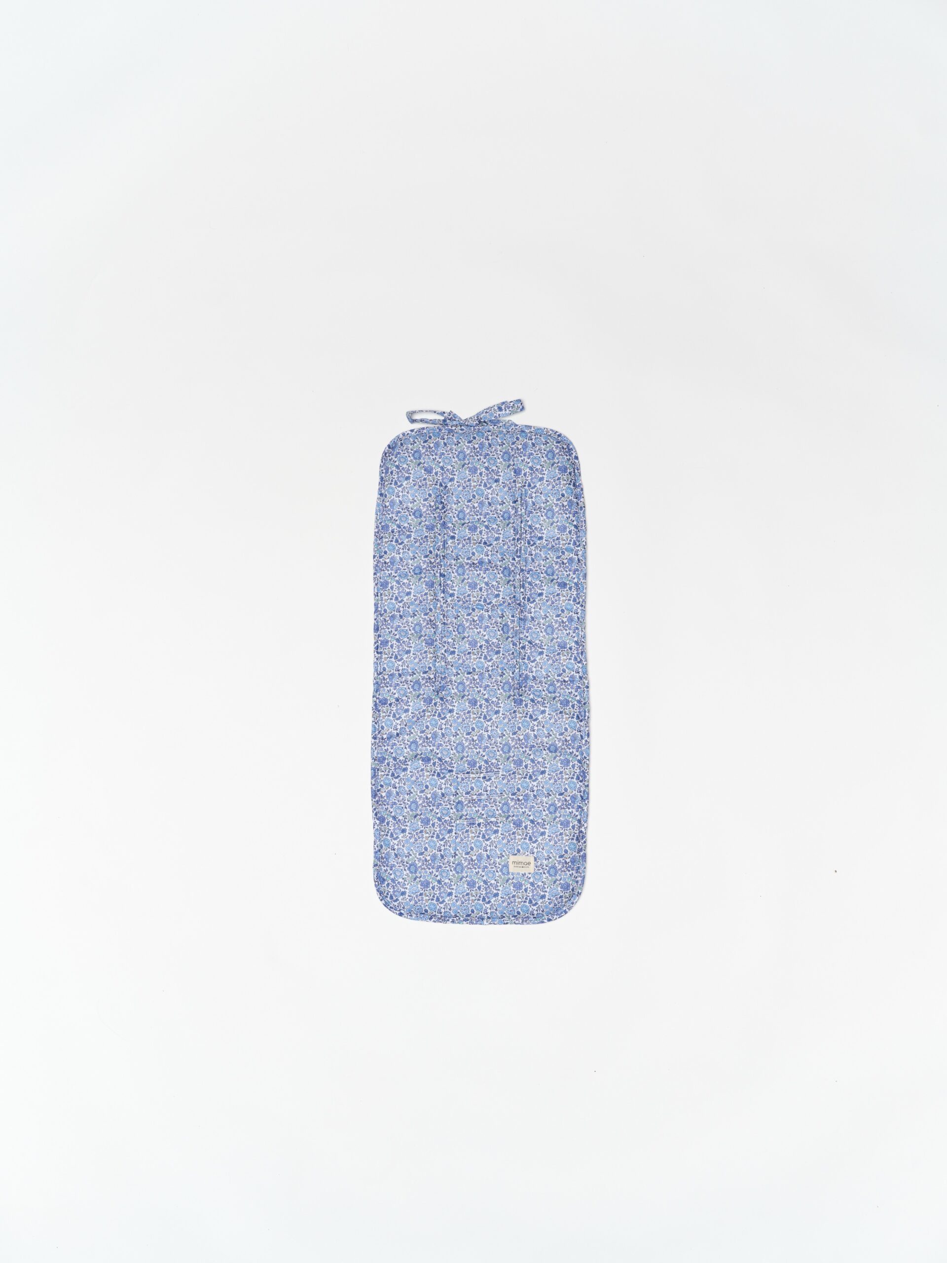 Colchonetas universales para sillas de paseo. Mulliditas tienen una guata de grosor medio y el trasero en tejido Maya 3D acolchado y transpirable. Tienen 10 ojales para que puedan adaptarse a diferentes tipos de silla. Sistema de enganche mediante goma y lazos. Estampado Liberty Azuli.