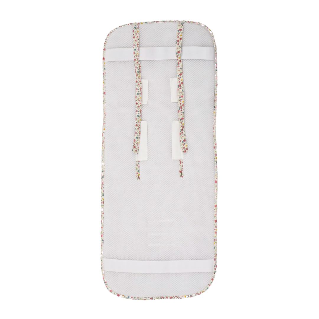 1. Colchonetas universales para sillas de paseo. Mulliditas tienen una guata de grosor medio y el trasero en tejido Maya 3 D acolchado y transpirable. Tiene 2 ojales verticales de tela y 3 ojales que vienen cerrados para que puedan adaptarse a diferentes tipos de silla. Sistema de enganche mediante goma y lazos. Estampado Liberty Olivia.