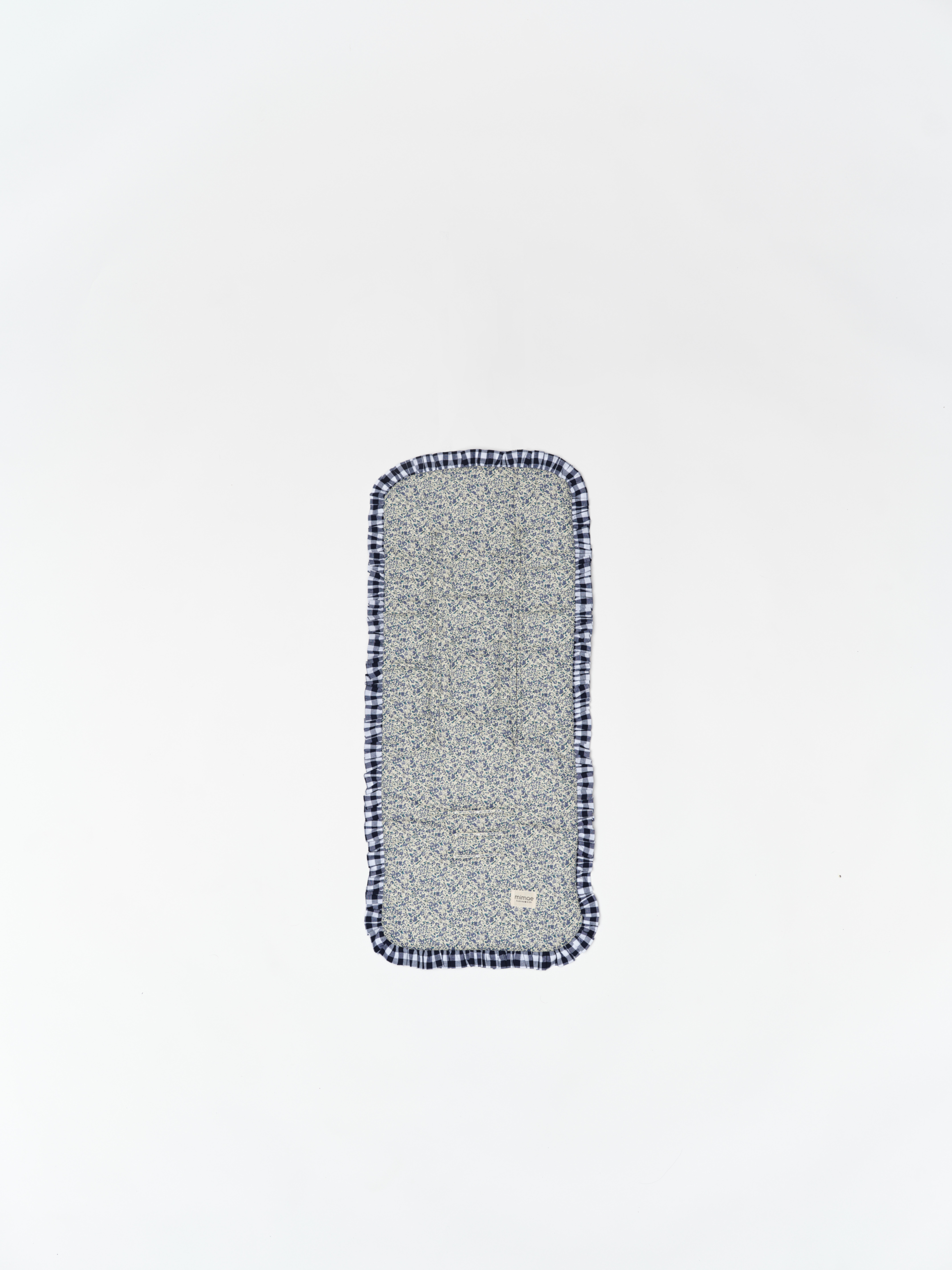 Colchoneta universal para sillas de paseo. Mulliditas tienen una guata de grosor medio y el trasero en tejido Maya 3D acolchado y transpirable. Tienen dos ojales verticales y tres ojales horizontales  para que puedan adaptarse a diferentes tipos de silla. Sistema de enganche mediante goma y lazos. Estampado Paul con volante Vichy navy.