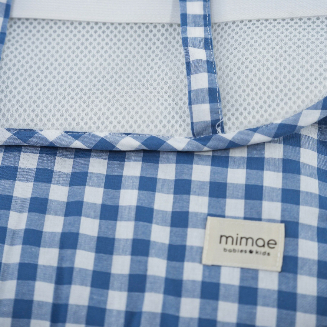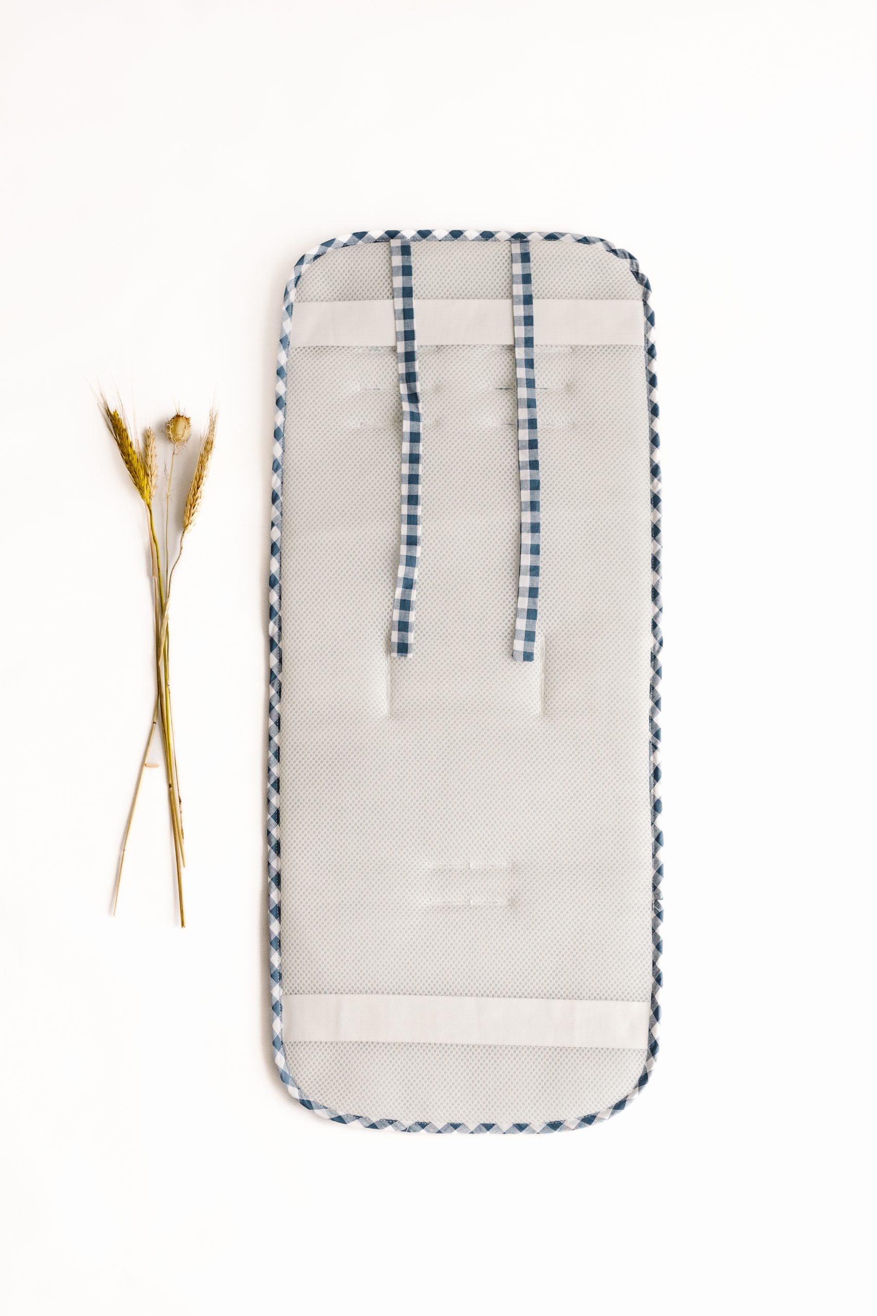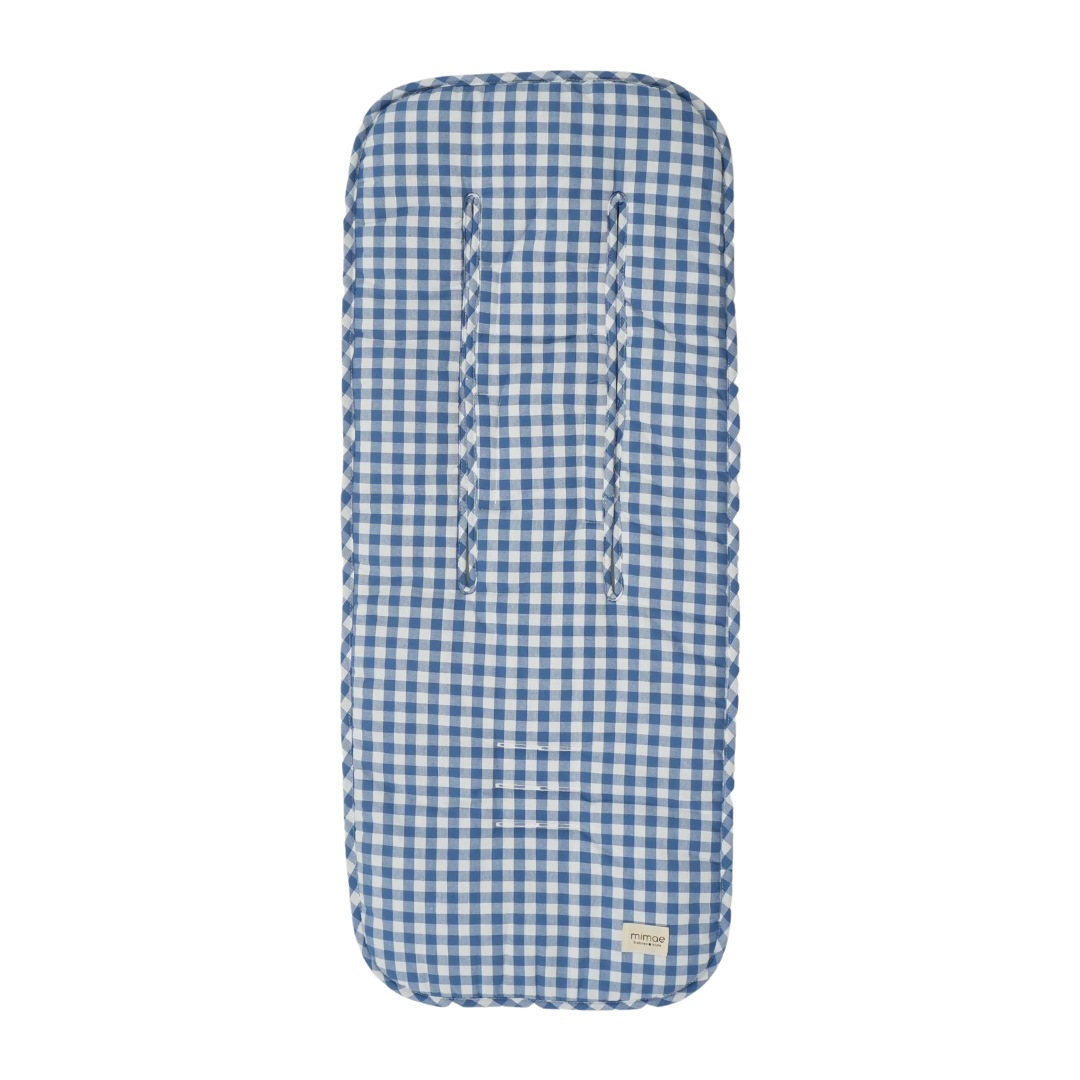 Colchoneta universal para sillas de paseo. Mulliditas tienen una guata de grosor medio y el trasero en tejido Maya 3D acolchado y transpirable. Tienen dos ojales verticales y tres ojales horizontales  para que puedan adaptarse a diferentes tipos de silla. Sistema de enganche mediante goma y lazos. Estampado vichy azul.