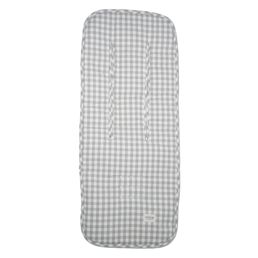 Colchoneta universal para sillas de paseo. Mulliditas tienen una guata de grosor medio y el trasero en tejido Maya 3D acolchado y transpirable. Tienen dos ojales verticales y tres ojales horizontales para que puedan adaptarse a diferentes tipos de silla. Sistema de enganche mediante goma y lazos. Estampado vichy beige.