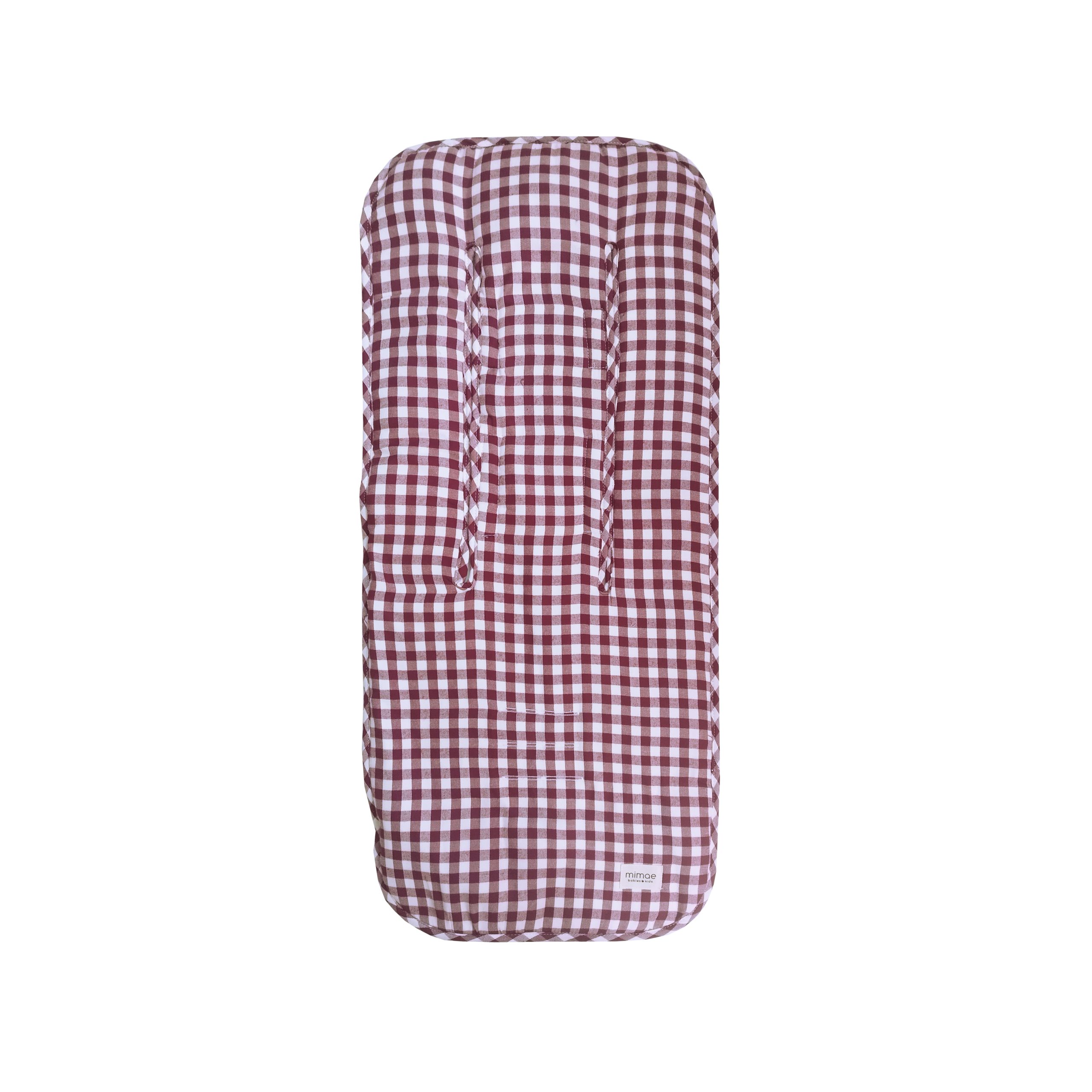 Colchoneta universal para sillas de paseo. Mulliditas tienen una guata de grosor medio y el trasero en tejido Maya 3D acolchado y transpirable. Tienen dos ojales verticales y tres ojales horizontales para que puedan adaptarse a diferentes tipos de silla. Sistema de enganche mediante goma y lazos. Estampado vichy granate.