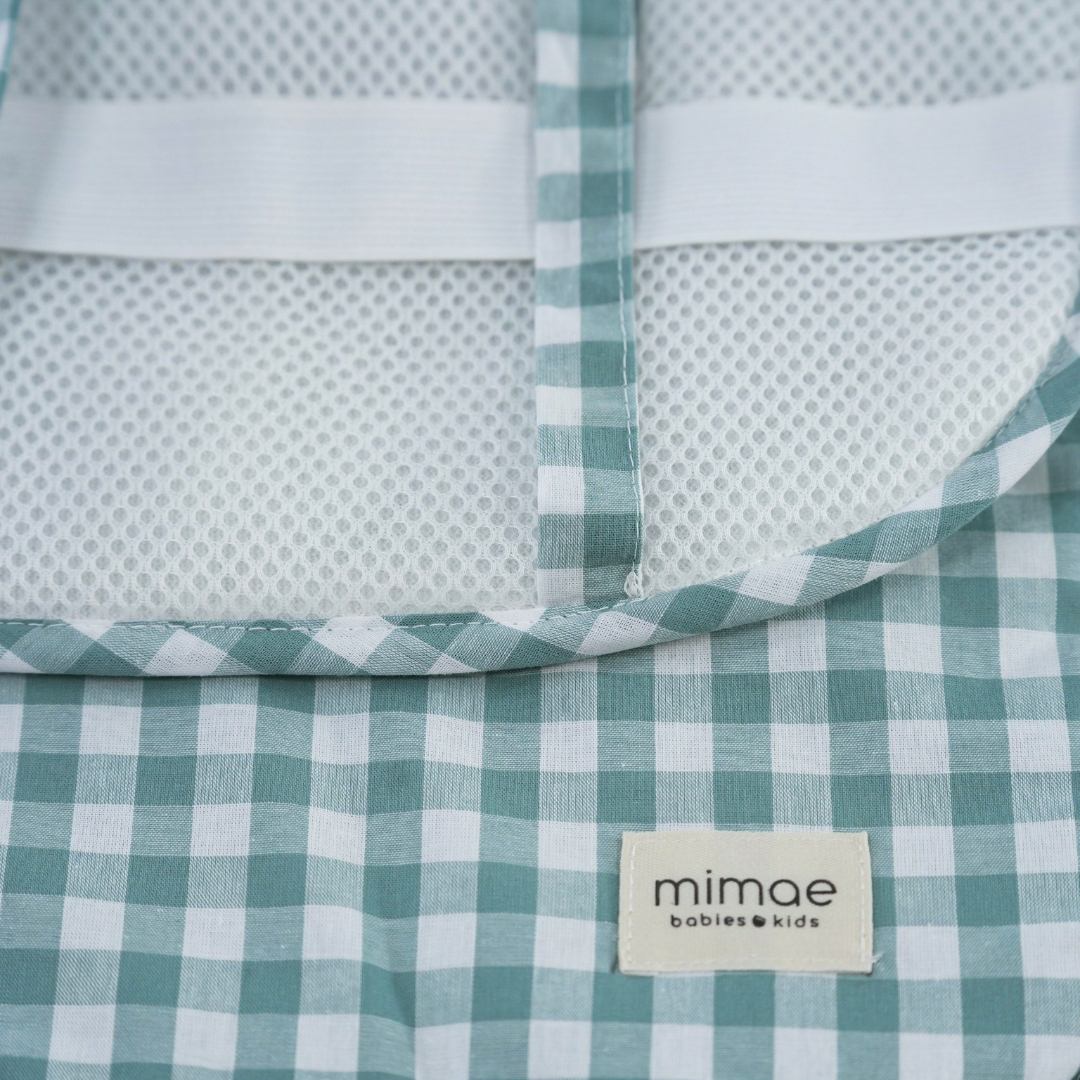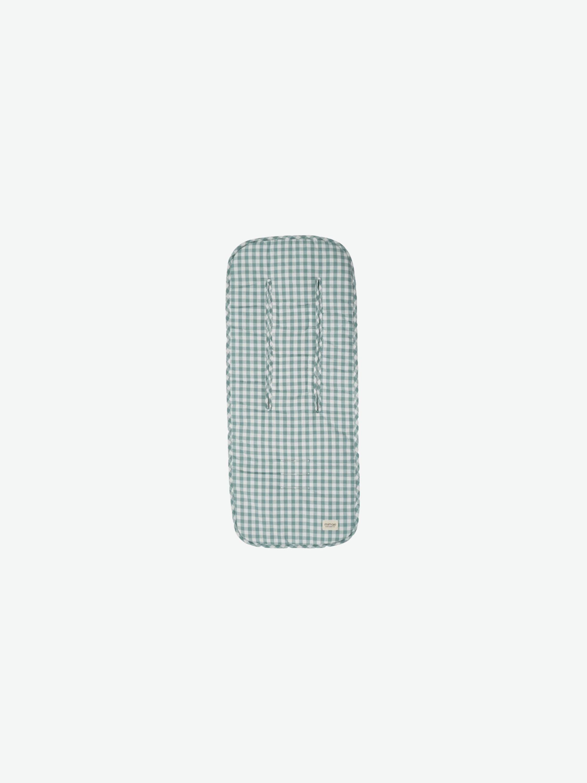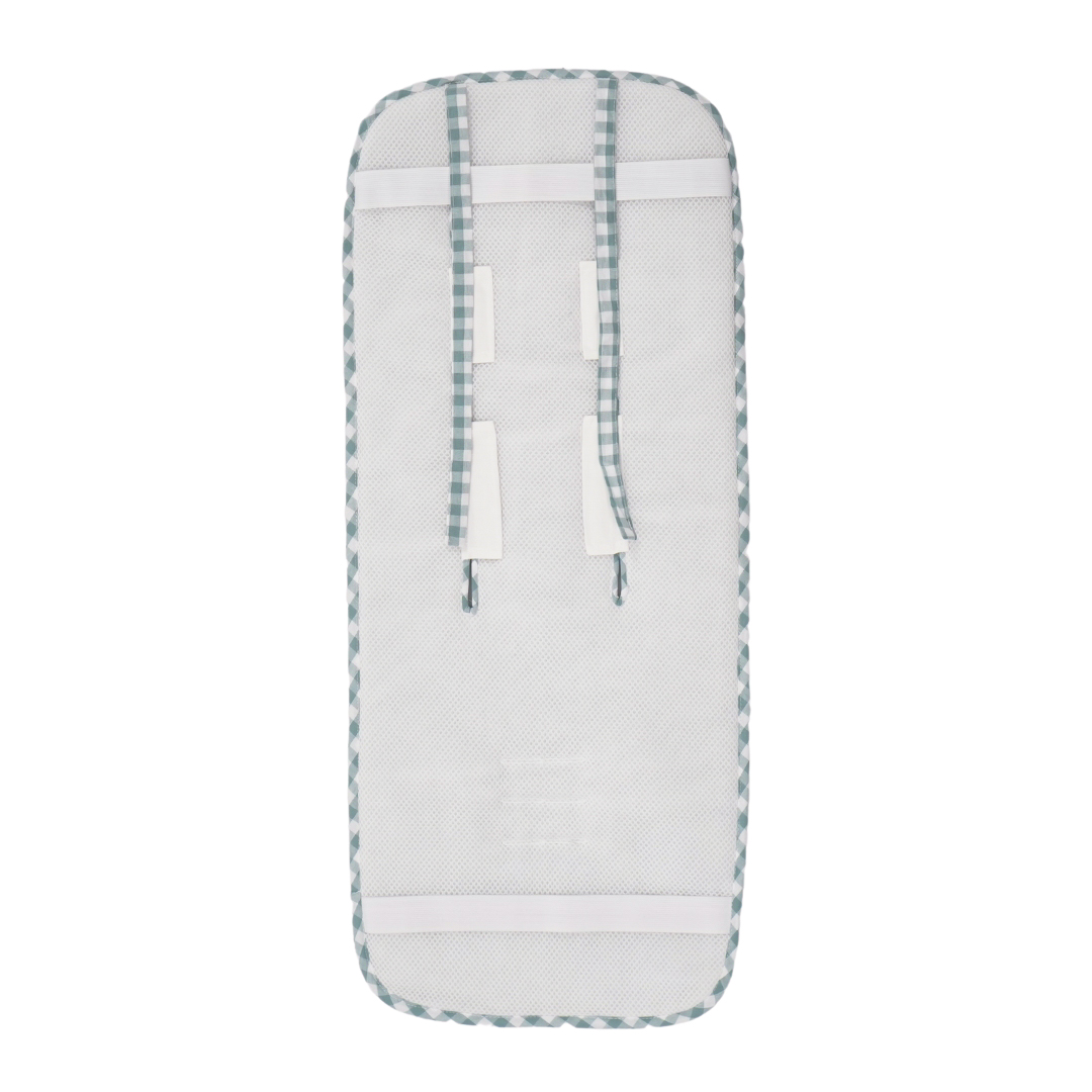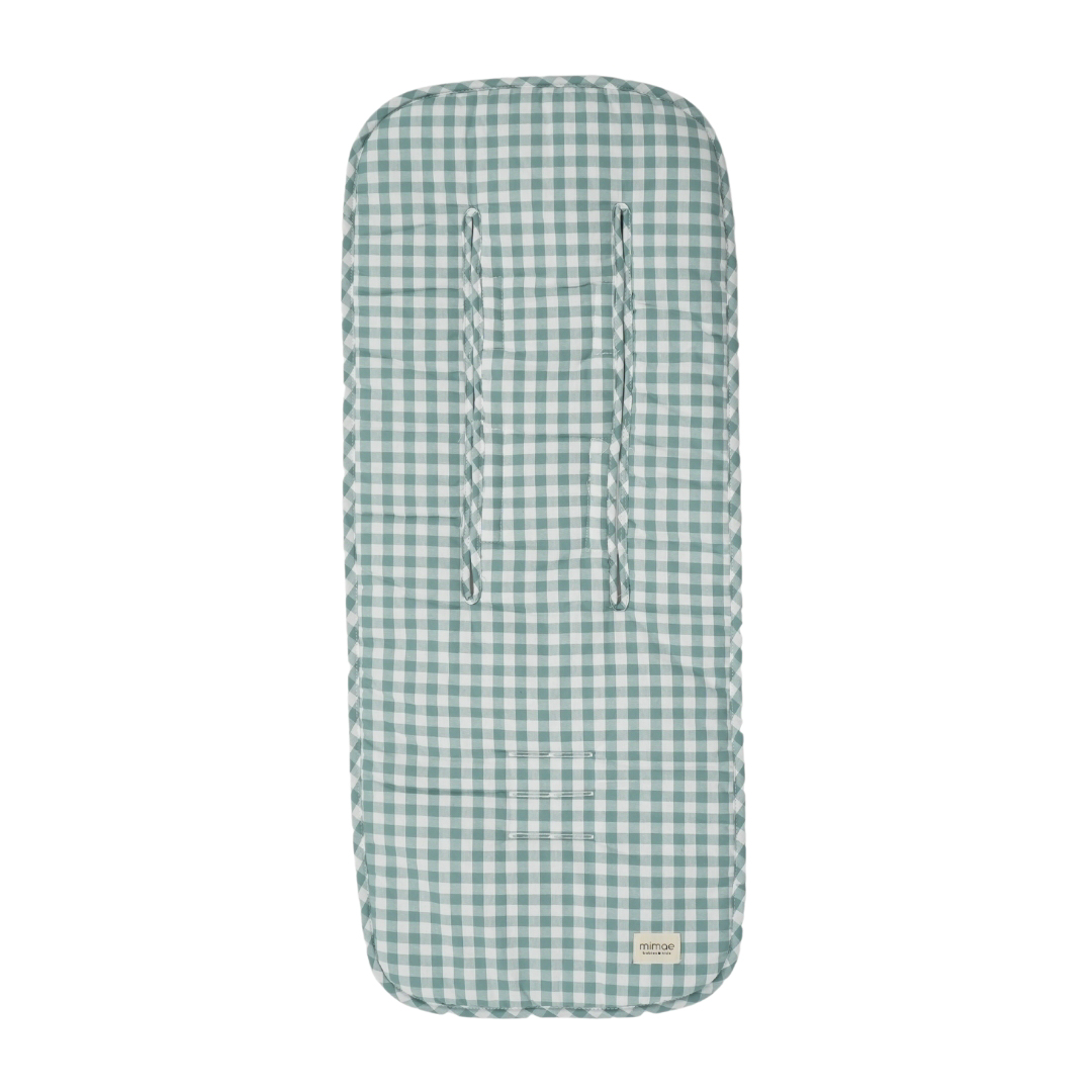 Colchoneta universal para sillas de paseo. Mulliditas tienen una guata de grosor medio y el trasero en tejido Maya 3D acolchado y transpirable. Tienen dos ojales verticales y tres ojales horizontales  para que puedan adaptarse a diferentes tipos de silla. Sistema de enganche mediante goma y lazos. Estampado vichy menta.
