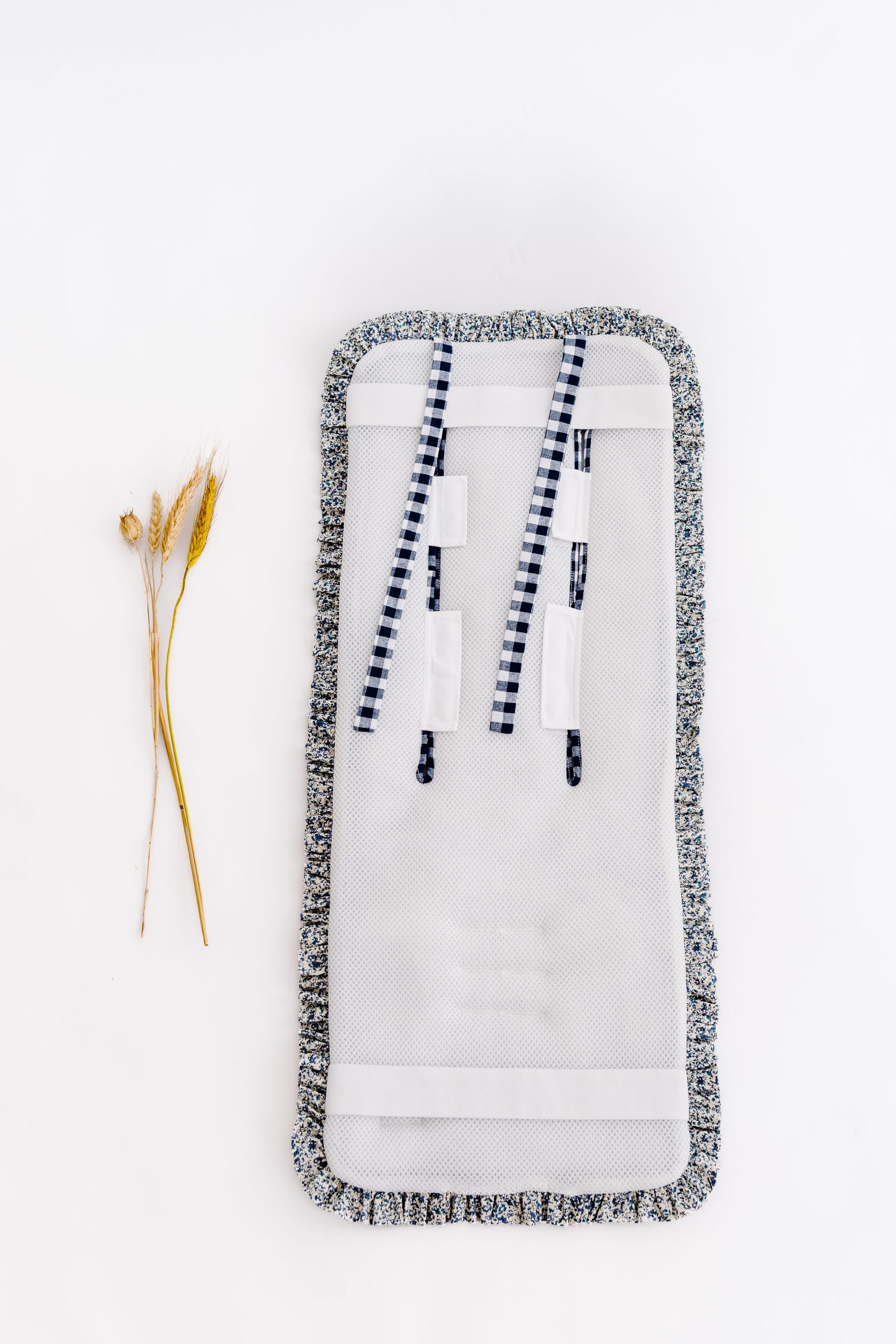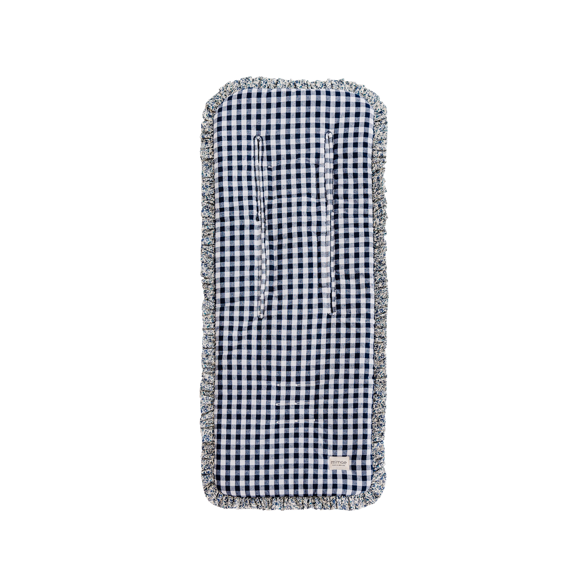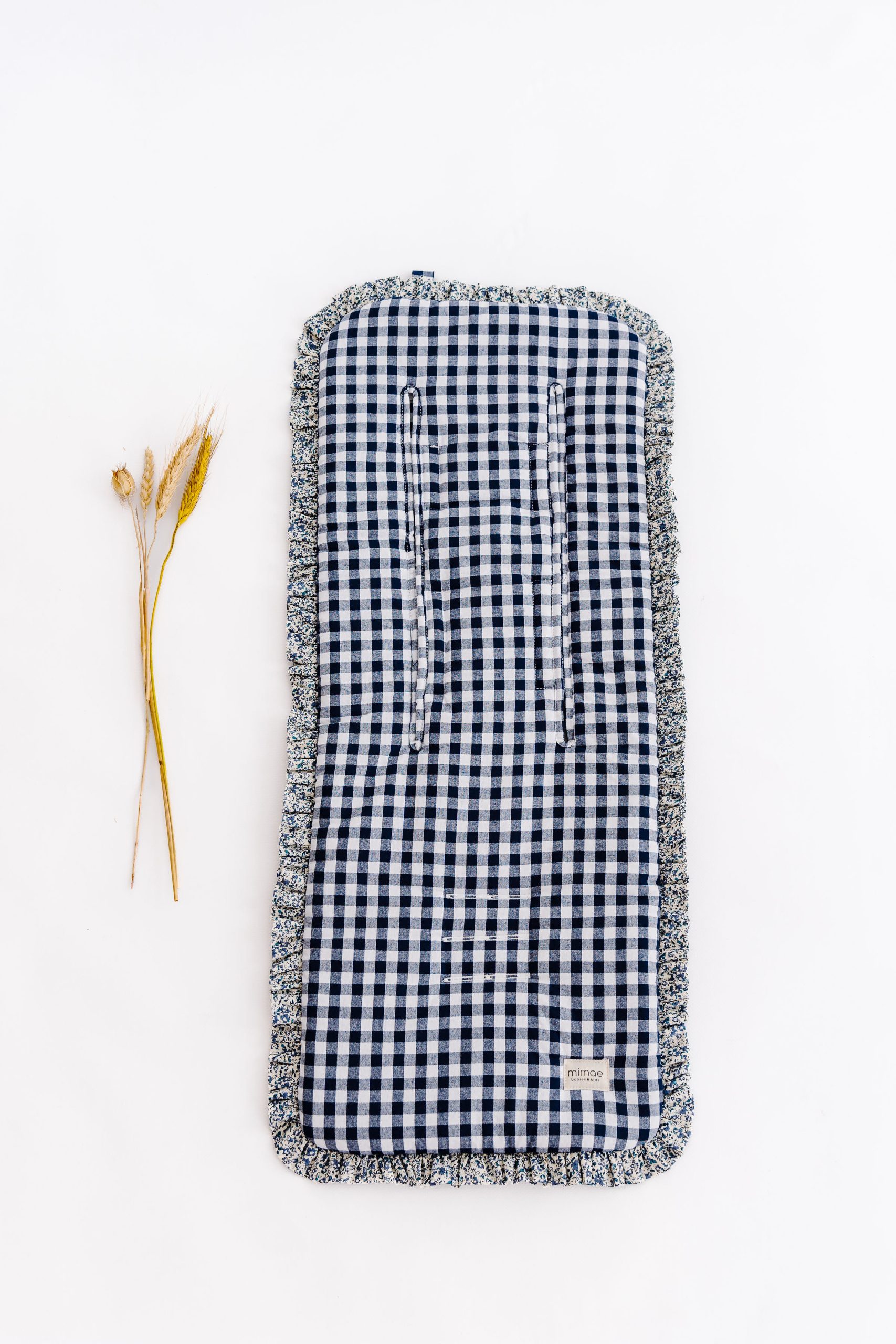 Colchonetas universales para sillas de paseo. Mulliditas tienen una guata de grosor medio y el trasero en tejido Maya 3D acolchado y transpirable. Tiene 2 ojales verticales de tela y 3 ojales para que puedan adaptarse a diferentes tipos de silla. Sistema de enganche mediante goma y lazos. Estampado Vichy navy con volante Liberty Paul