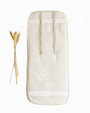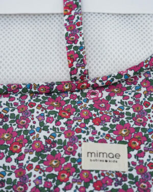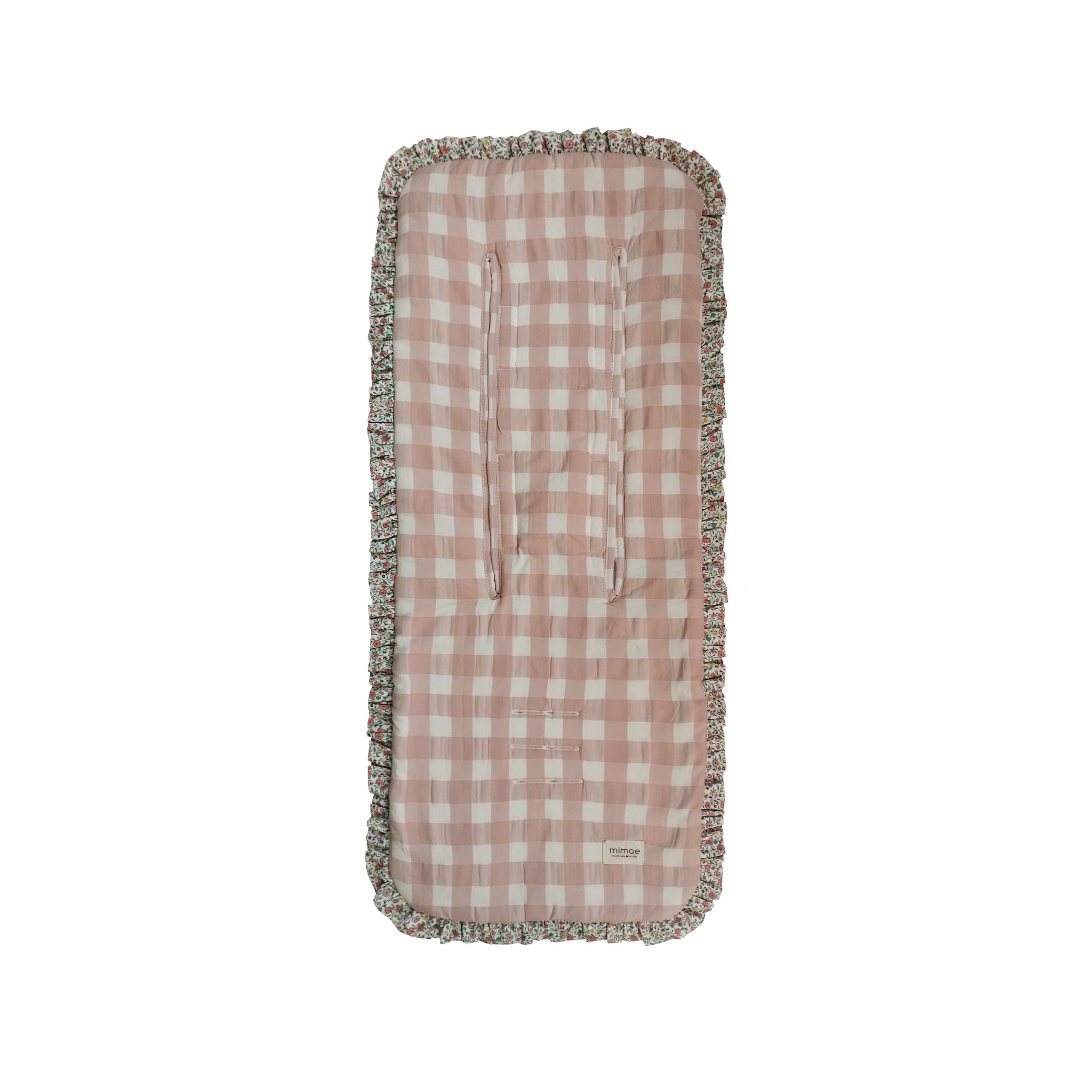Colchonetas universales para sillas de paseo. Mulliditas tienen una guata de grosor medio y el trasero en tejido Maya 3D acolchado y transpirable. Tiene 2 ojales verticales de tela y 3 ojales para que puedan adaptarse a diferentes tipos de silla. Sistema de enganche mediante goma y lazos. Estampado Vichy rosa con volante Liberty Olivia