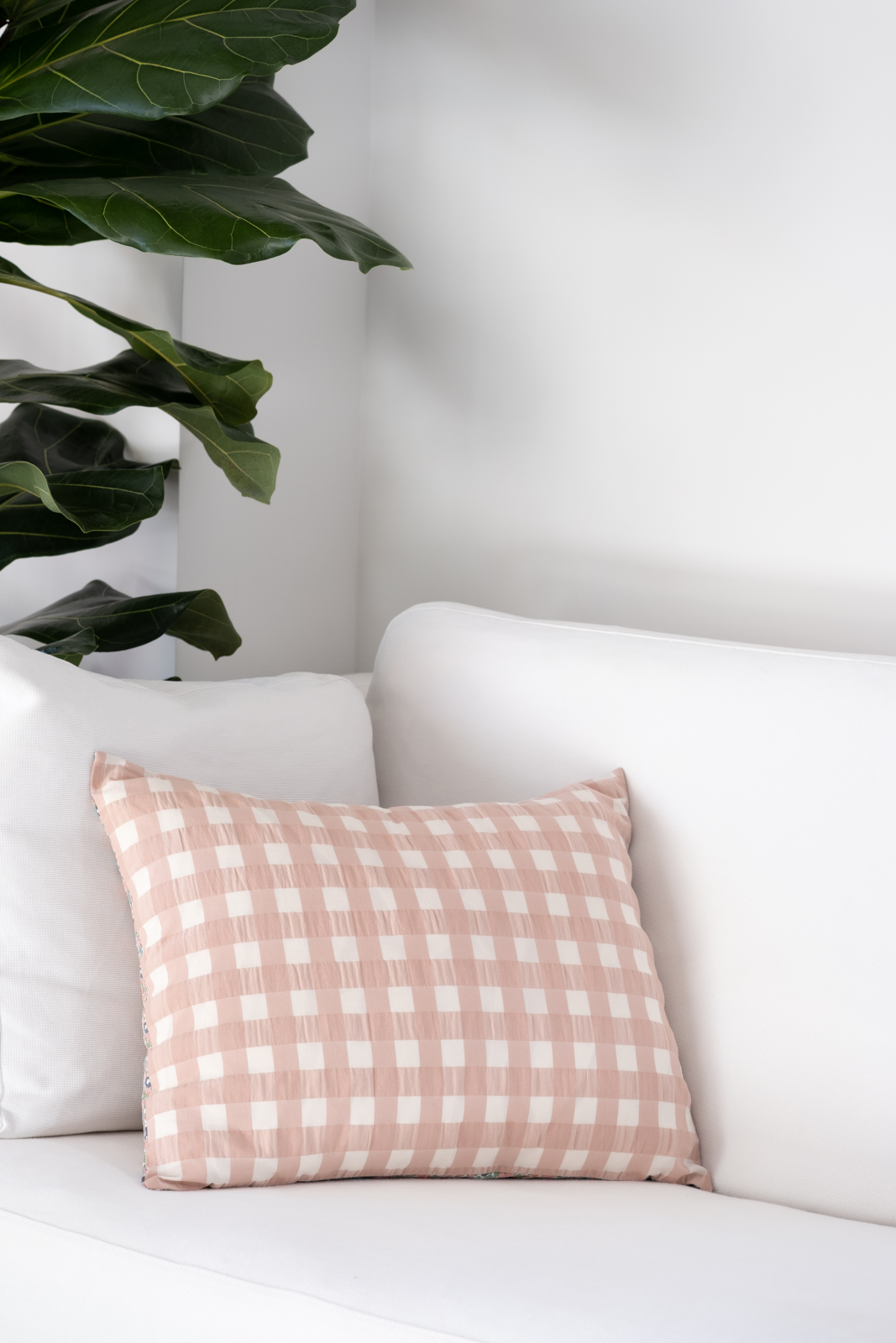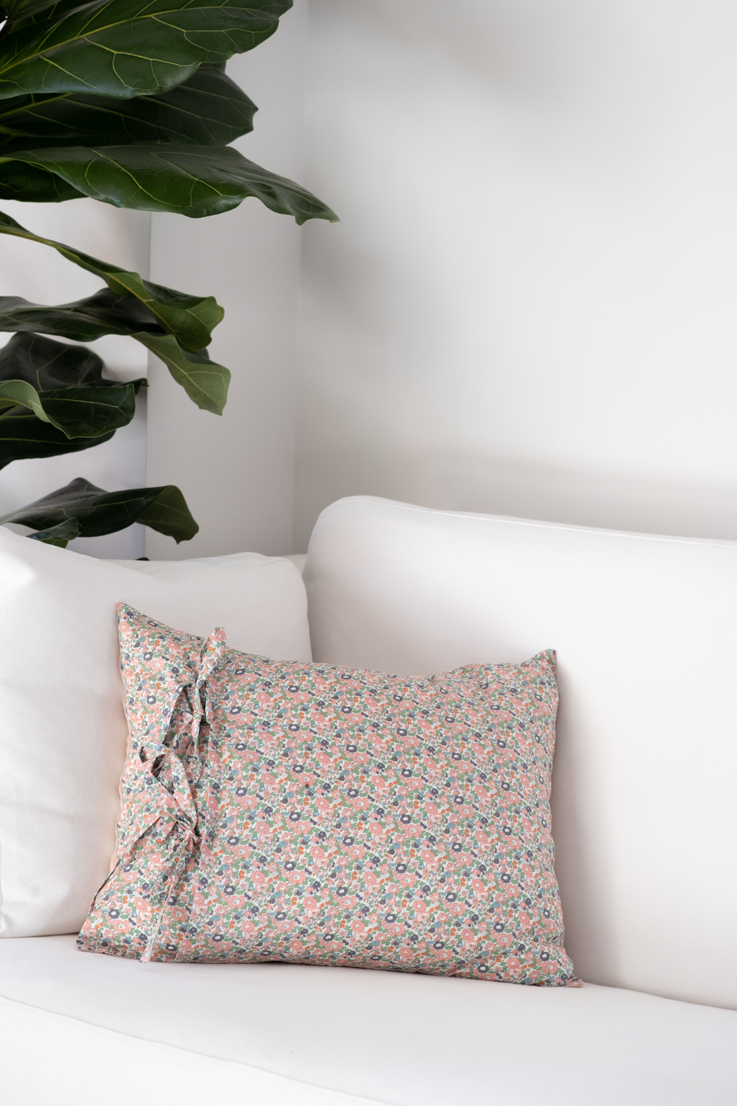 Funda de cojín reversible, con abertura y lazos para introducir el relleno. Tejido Vichy XL Rosa por un lado y Liberty Haize por el otro.