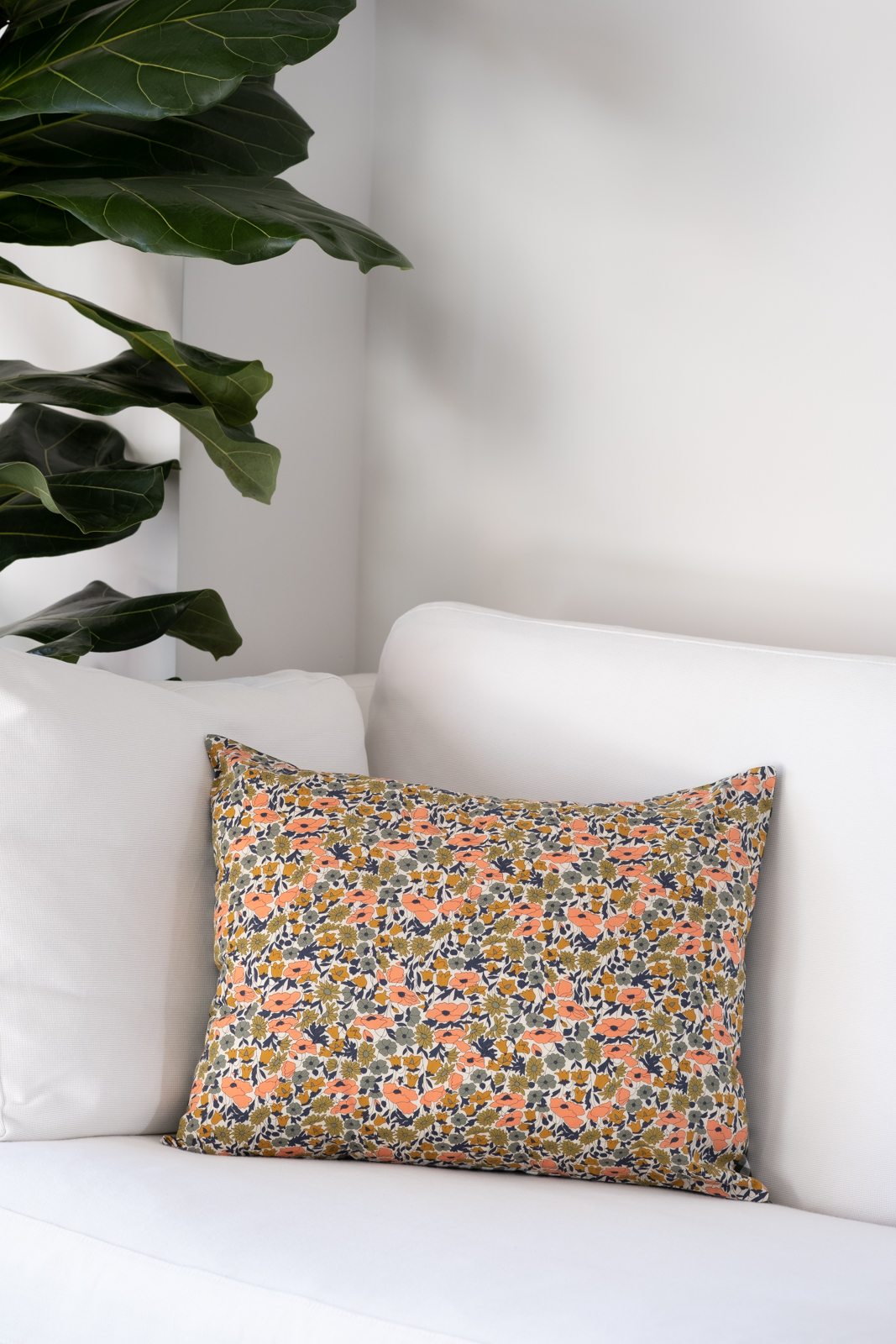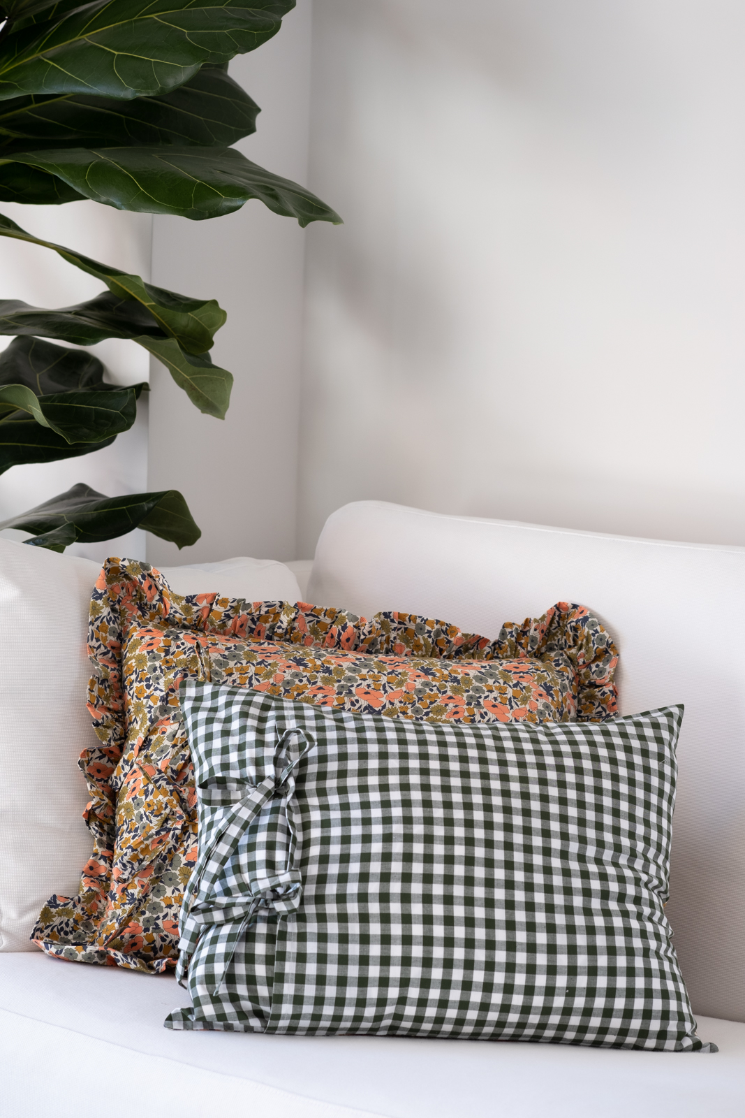 Funda de cojín reversible, con abertura y lazos para introducir el relleno. Tejido Liberty Mae por un lado, y Vichy verde por el otro.