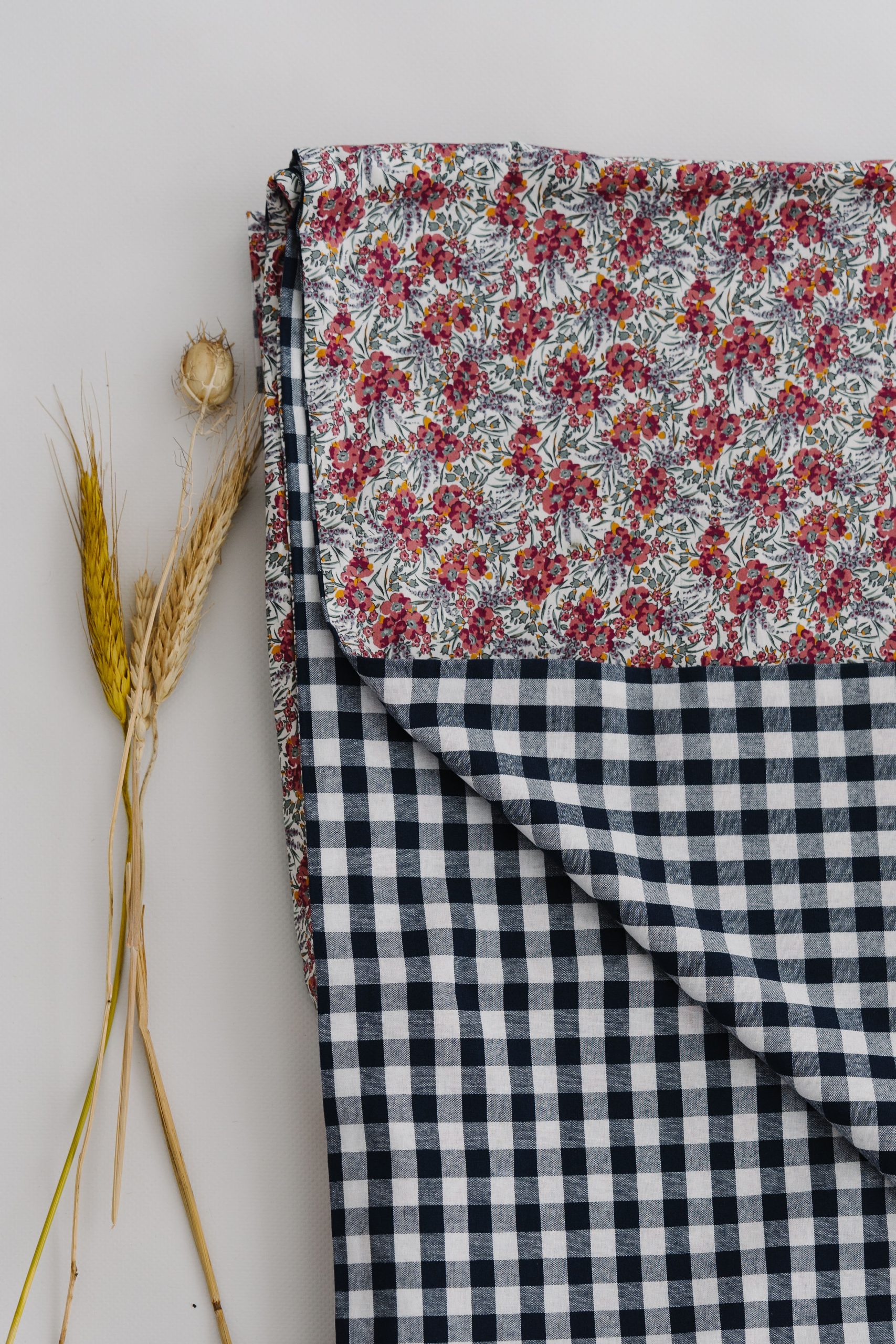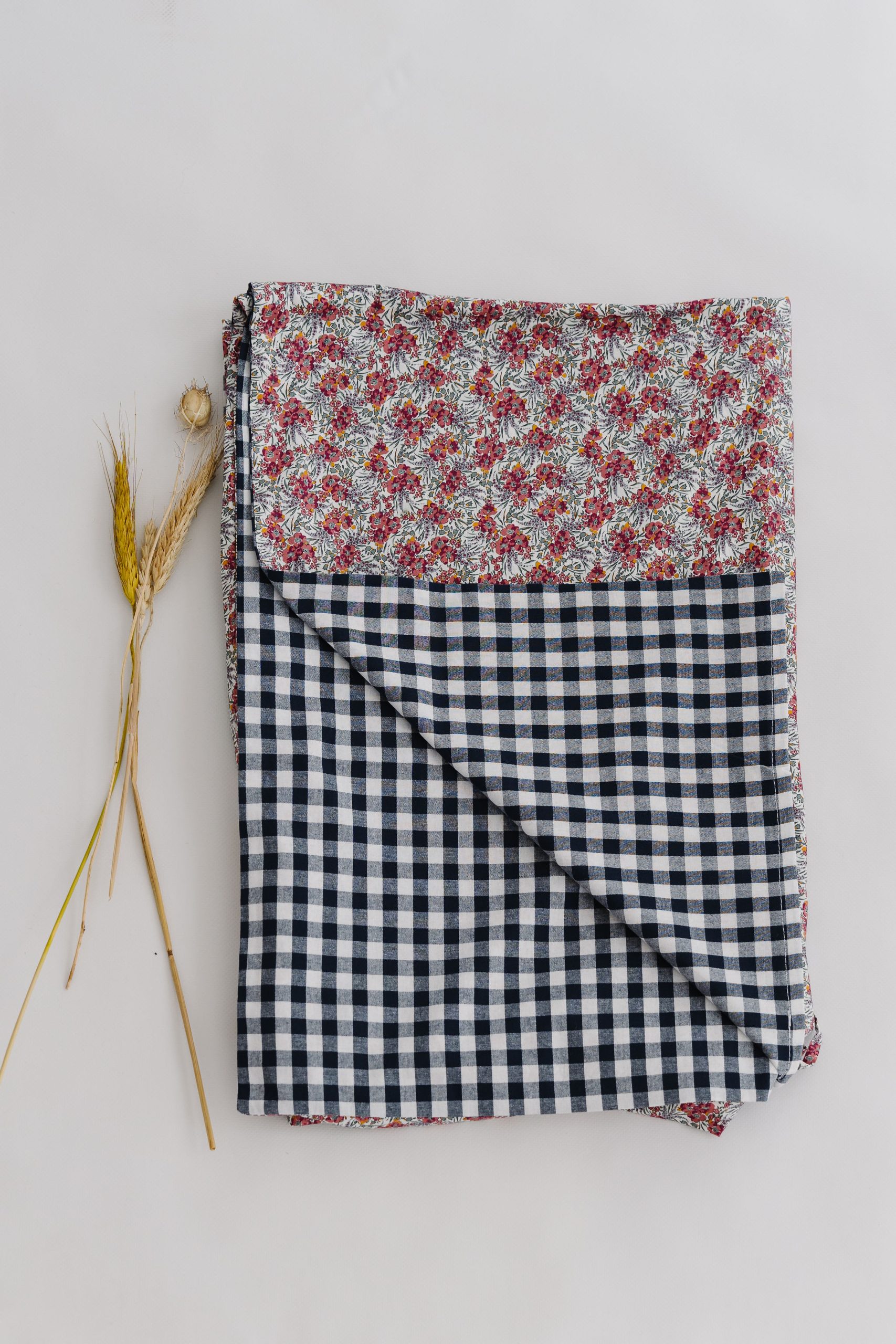 Funda nórdica para camas de 80/90cm. Abertura en la parte de abajo para introducir el relleno deseado, cierre mediante lazo. Confeccionado combinando Liberty Malen y Vichy Navy