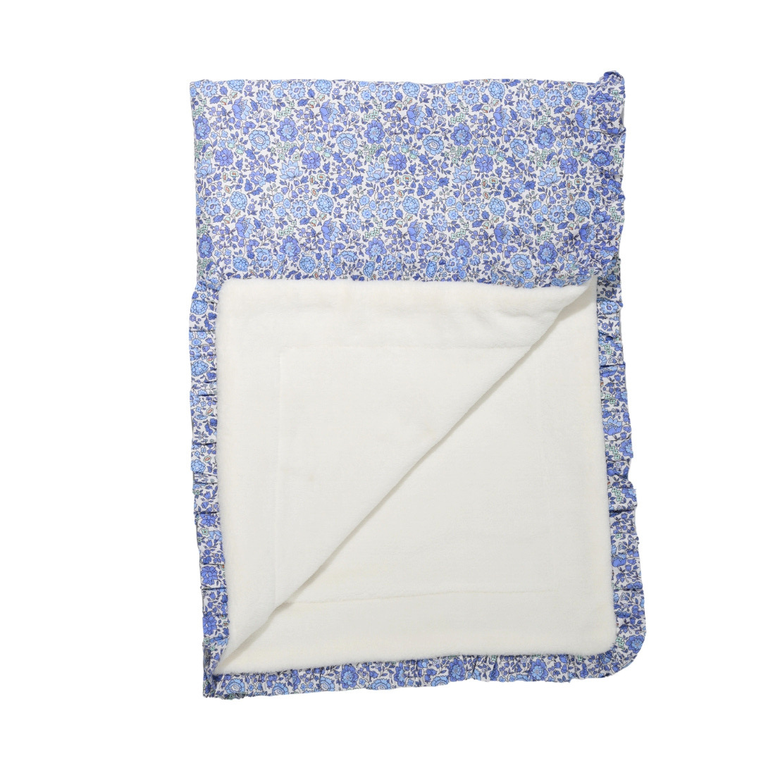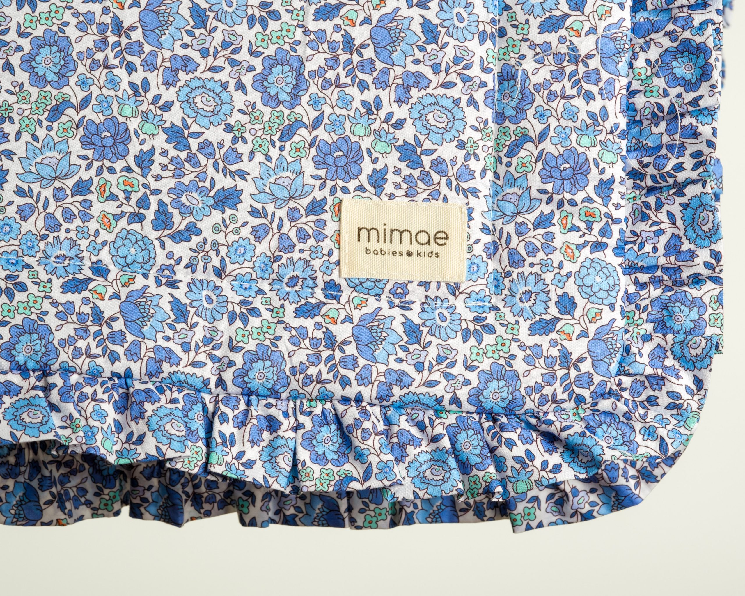 Mantas de algodón mulliditas con una guata fina para que mantenga bien la temperatura del bebé. Por un lado estampado Azuli  y por el otro forrado con bambula cruda. Todo el borde está rematado con volante.
