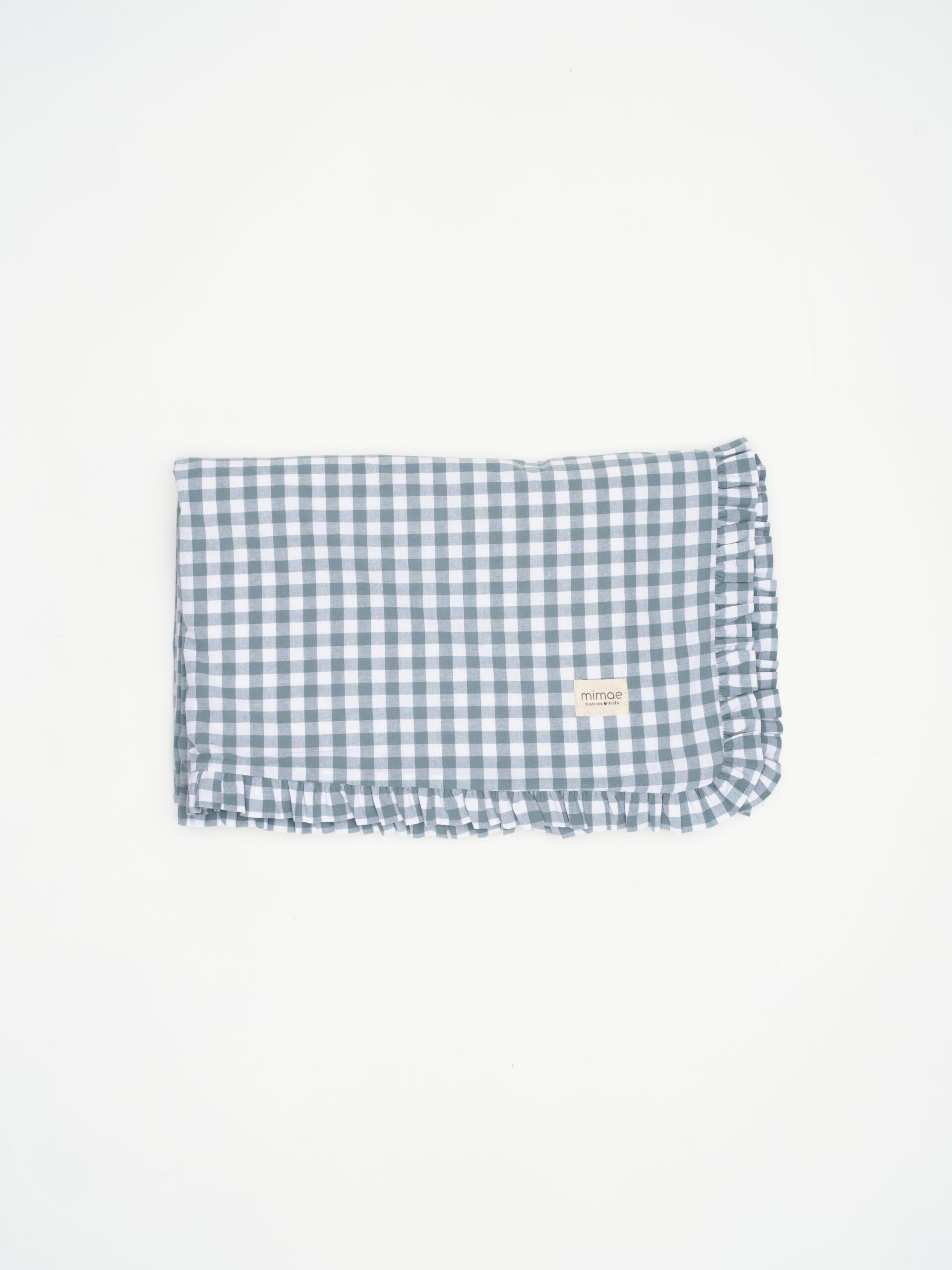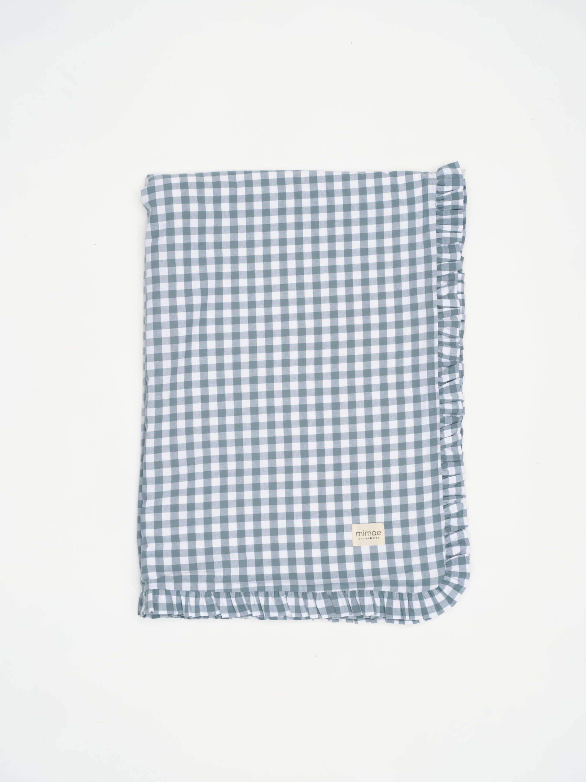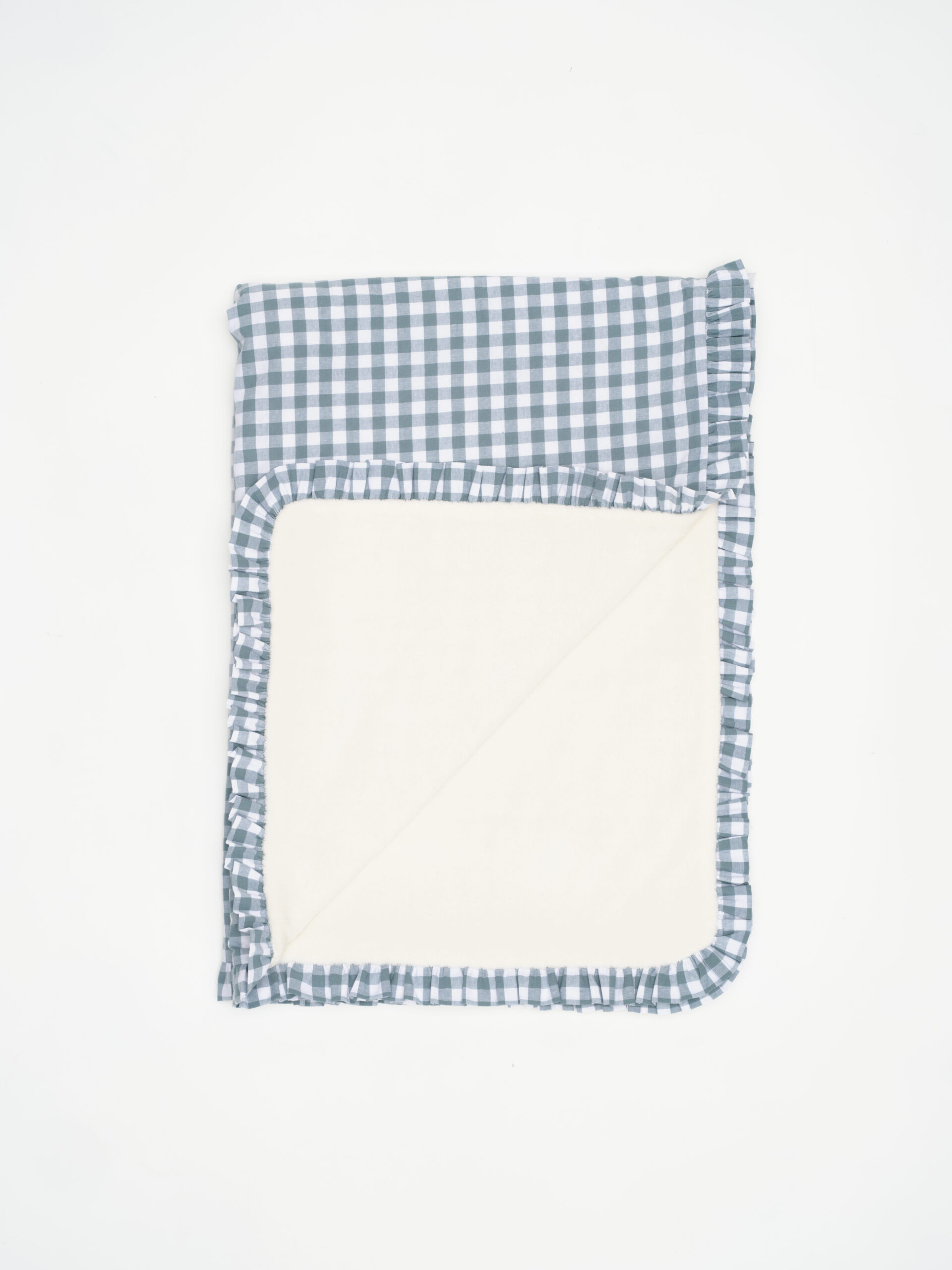 Nuestras mantas de pelito están mulliditas con una guata fina para que mantenga bien la temperatura del bebé. Por un lado estampado vichy menta y por el otro pelito crudo. Todo rematado con volante.