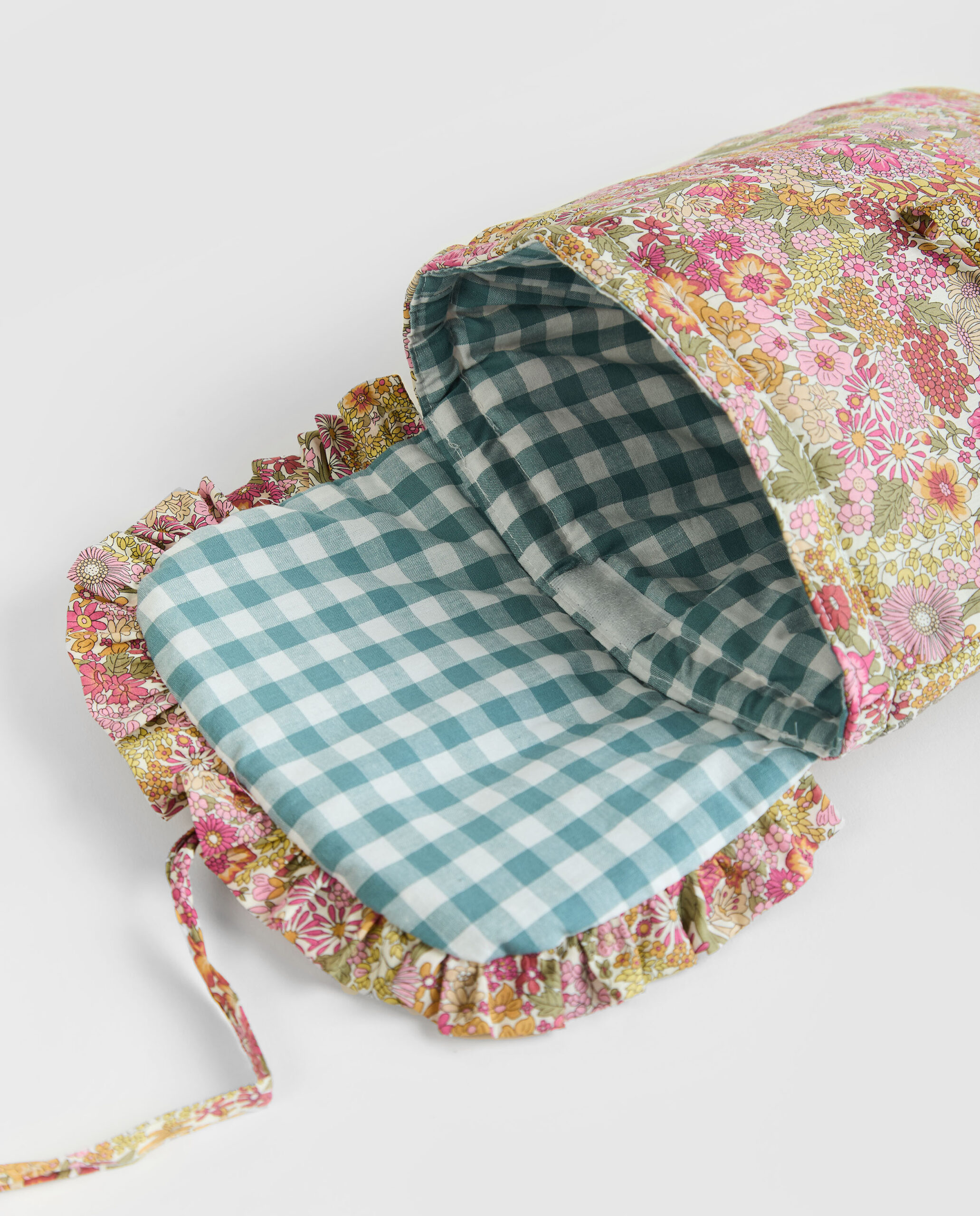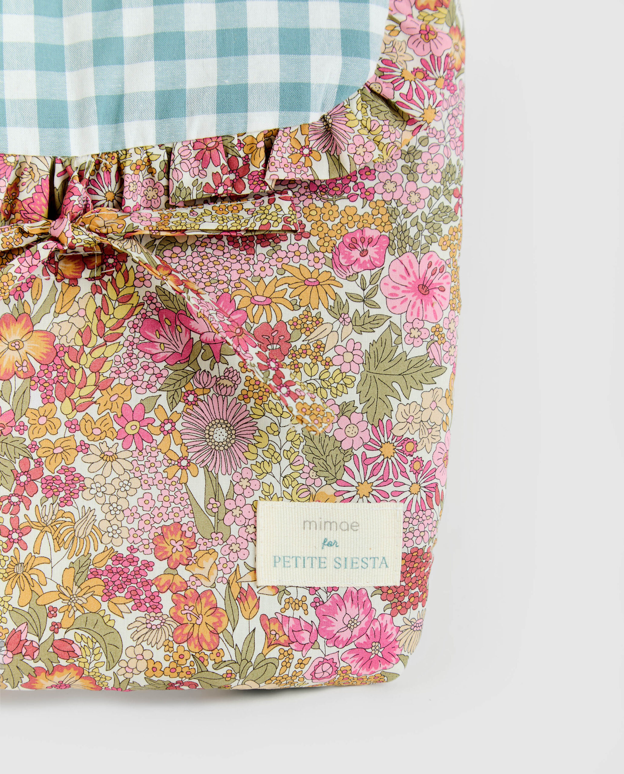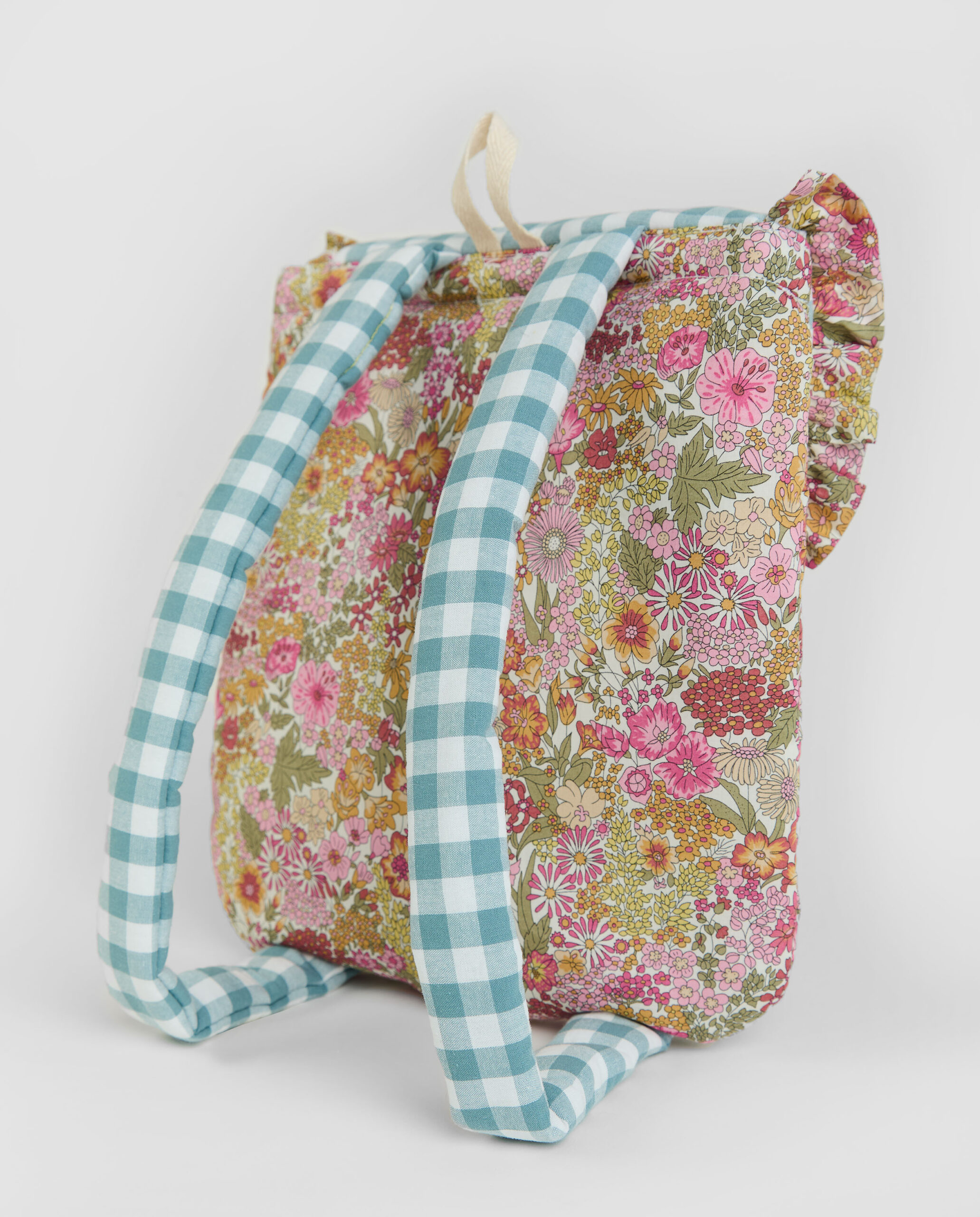 Mochila mini en estampado Liberty Annie con tejido Liberty Fabrics original y Vichy Menta. Acolchados con una guata de grosor medio, se cierra con velcro y lazo. Además entre el forro y la guata tiene un tejido impermeable para que la mochila no se empape si se derrama algún líquido.