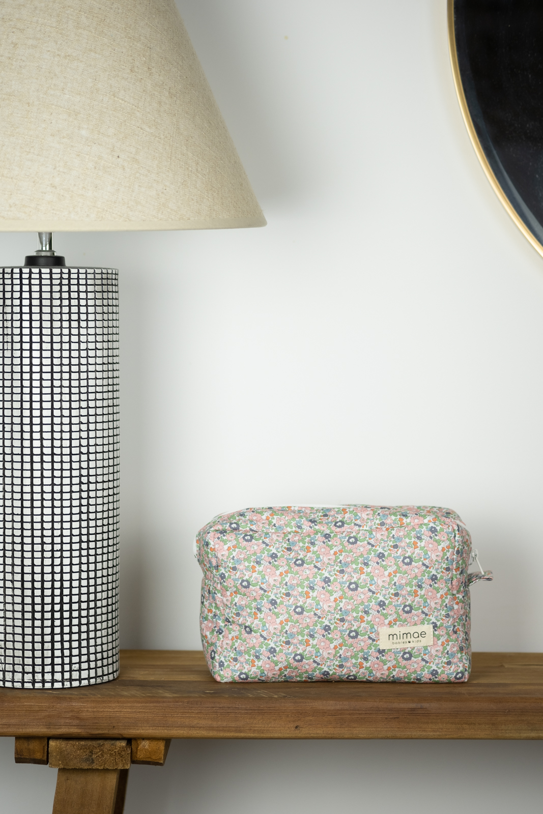 Nuestros neceseres tienen el tamaño perfecto para guardar todo lo necesario para nuestro bebe. Acolchados con una guata de grosor medio, están forrados con  algodón orgánico y se cierra con cremallera. Además entre el forro y la guata tiene un tejido impermeable para que el bolso no se empape si se derrama algún líquido. Estampado Liberty Haize en tonos rosa.