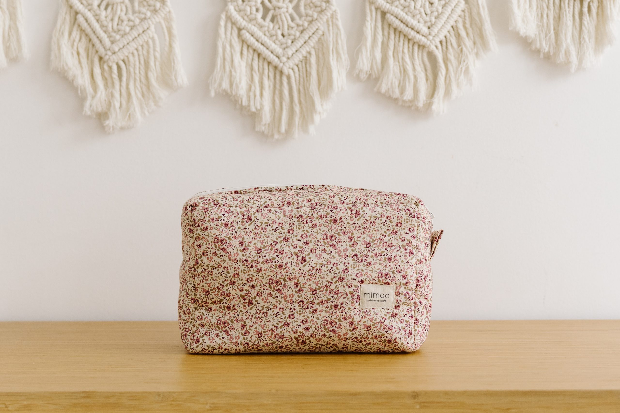 Nuestros neceseres tienen el tamaño perfecto para guardar todo lo necesario para nuestro bebe. Acolchados con una guata de grosor medio, están forrados con  algodón orgánico y se cierra con cremallera. Además entre el forro y la guata tiene un tejido impermeable para que el bolso no se empape si se derrama algún líquido. Estampado Liberty Nikole.