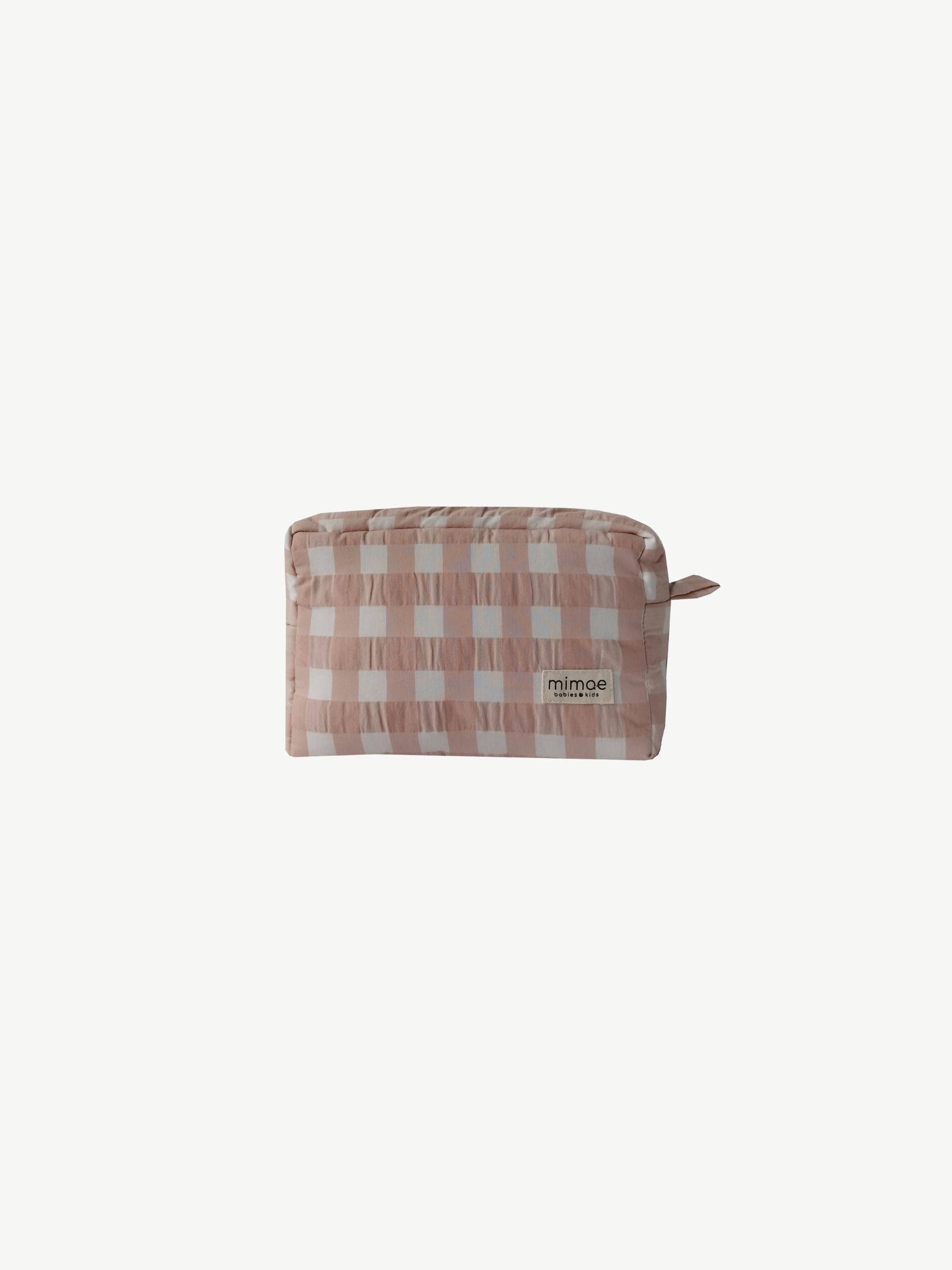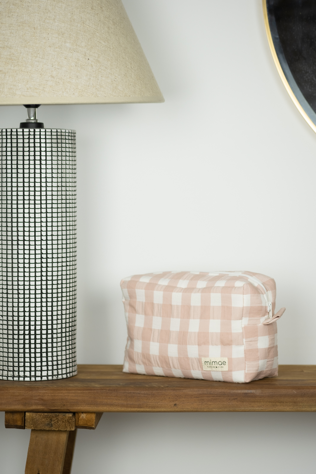 Nuestros neceseres tienen el tamaño perfecto para guardar todo lo necesario para nuestro bebe. Acolchados con una guata de grosor medio, están forrados con  algodón orgánico y se cierra con cremallera. Además entre el forro y la guata tiene un tejido impermeable para que el bolso no se empape si se derrama algún líquido. Estampado Vichy Rosa Sherkusser