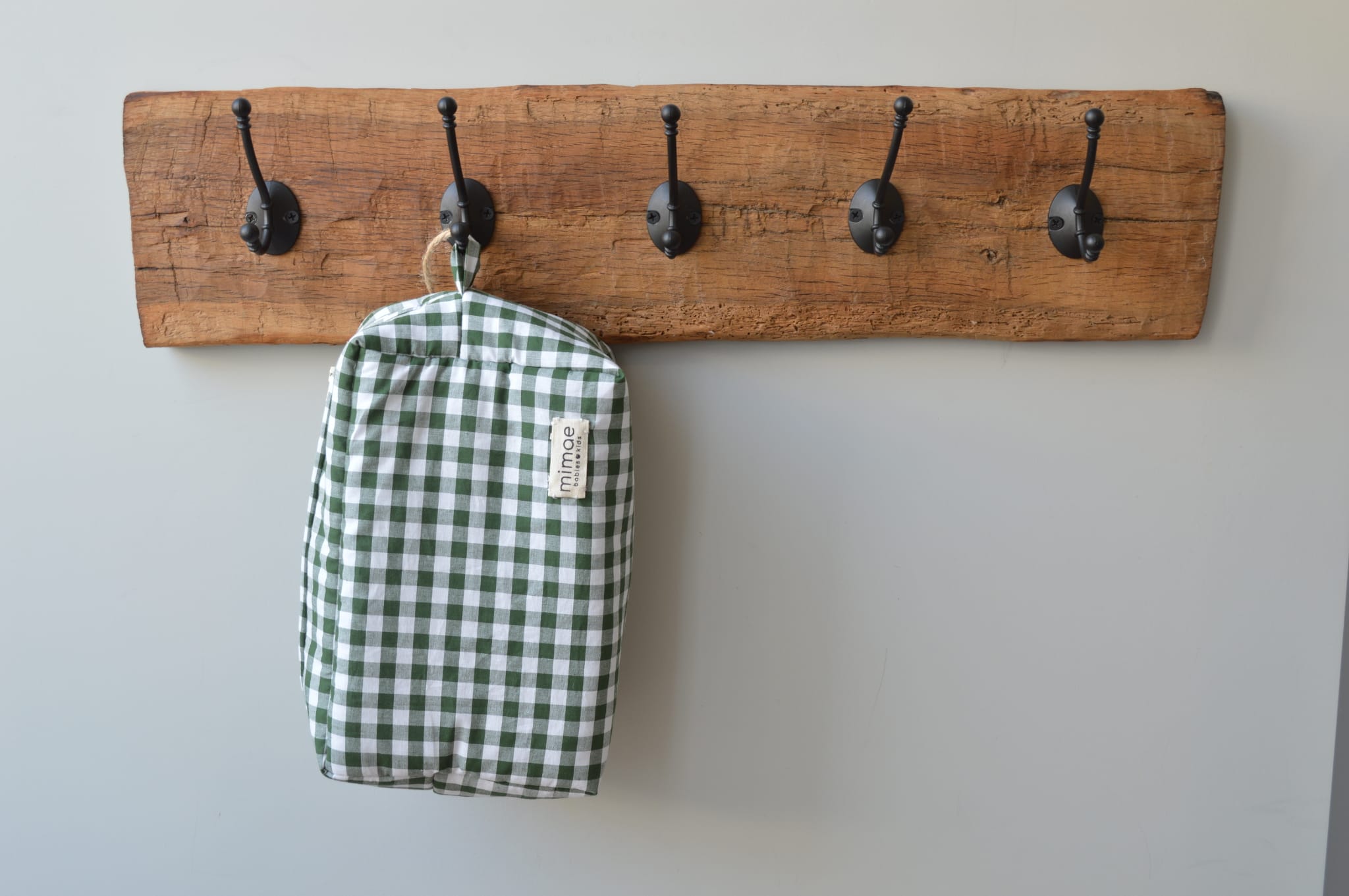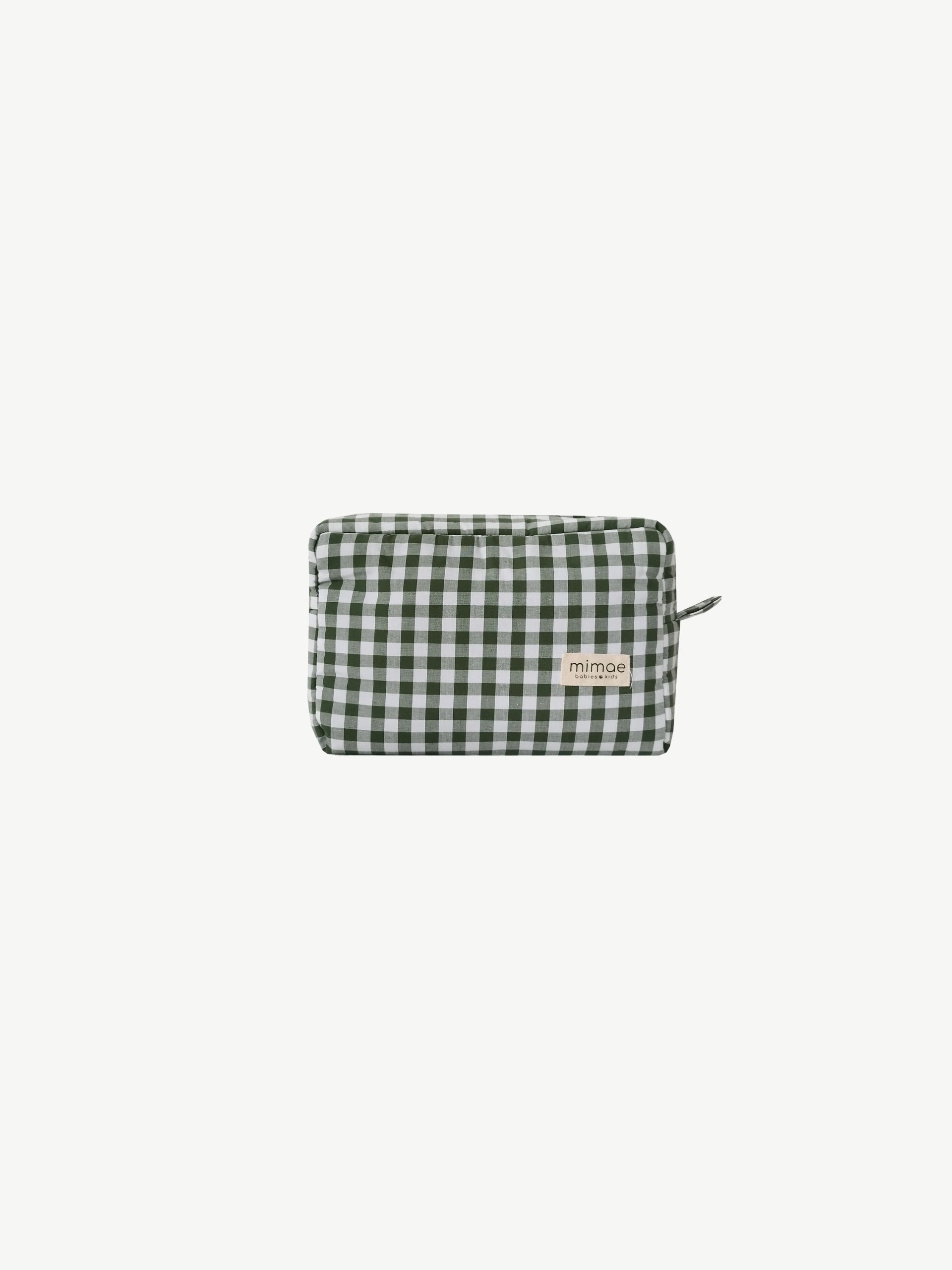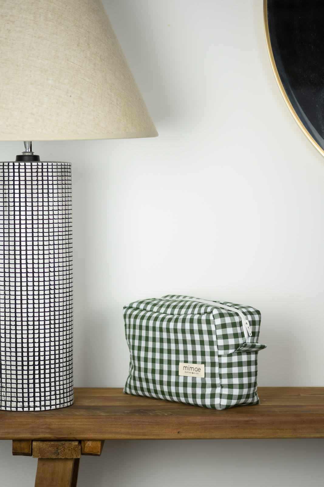 Nuestros neceseres tienen el tamaño perfecto para guardar todo lo necesario para nuestro bebe. Acolchados con una guata de grosor medio, están forrados con  algodón orgánico y se cierra con cremallera. Además entre el forro y la guata tiene un tejido impermeable para que el bolso no se empape si se derrama algún líquido. Estampado Vichy verde y blanco.