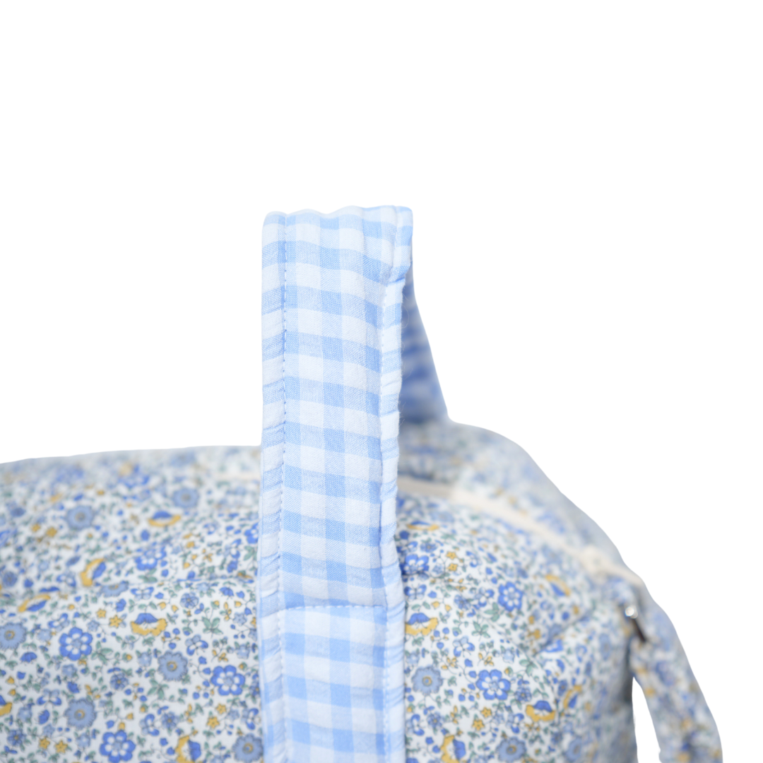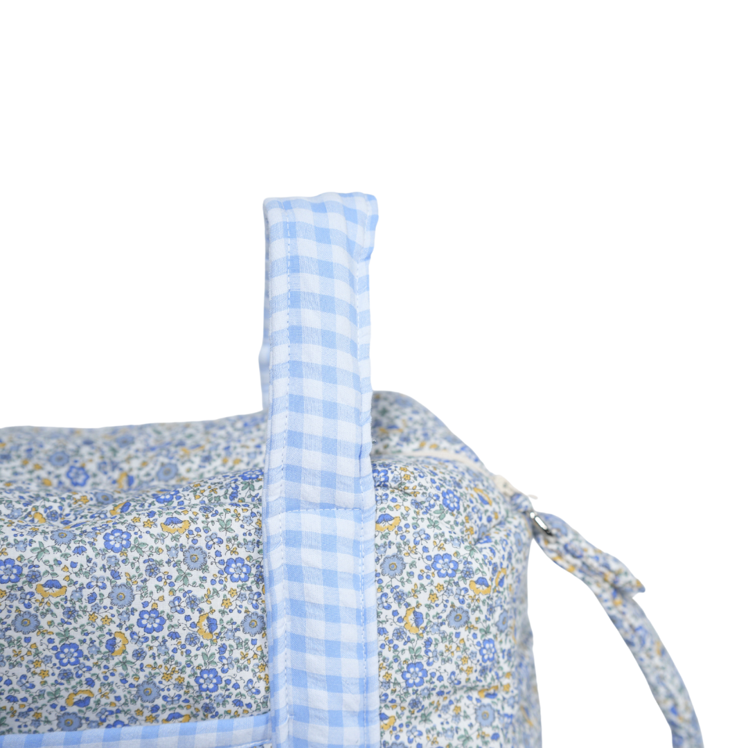 Nuestro new big es ideal para guardar todo lo necesario cuando salimos de paseo. Acolchado con una guata de grosor medio está forrado con un algodón orgánico y se cierra con cremallera. Además entre el forro y la guata tiene un tejido impermeable para que el bolso no se empape si se derrama algún líquido. Tiene un bolsillo en el exterior y otros dos en el interior para llevar todo bien organizado. Se engancha al carro mediante dos asas con corchetes. Tiene asa larga. Estampado Inar y vichy dream.