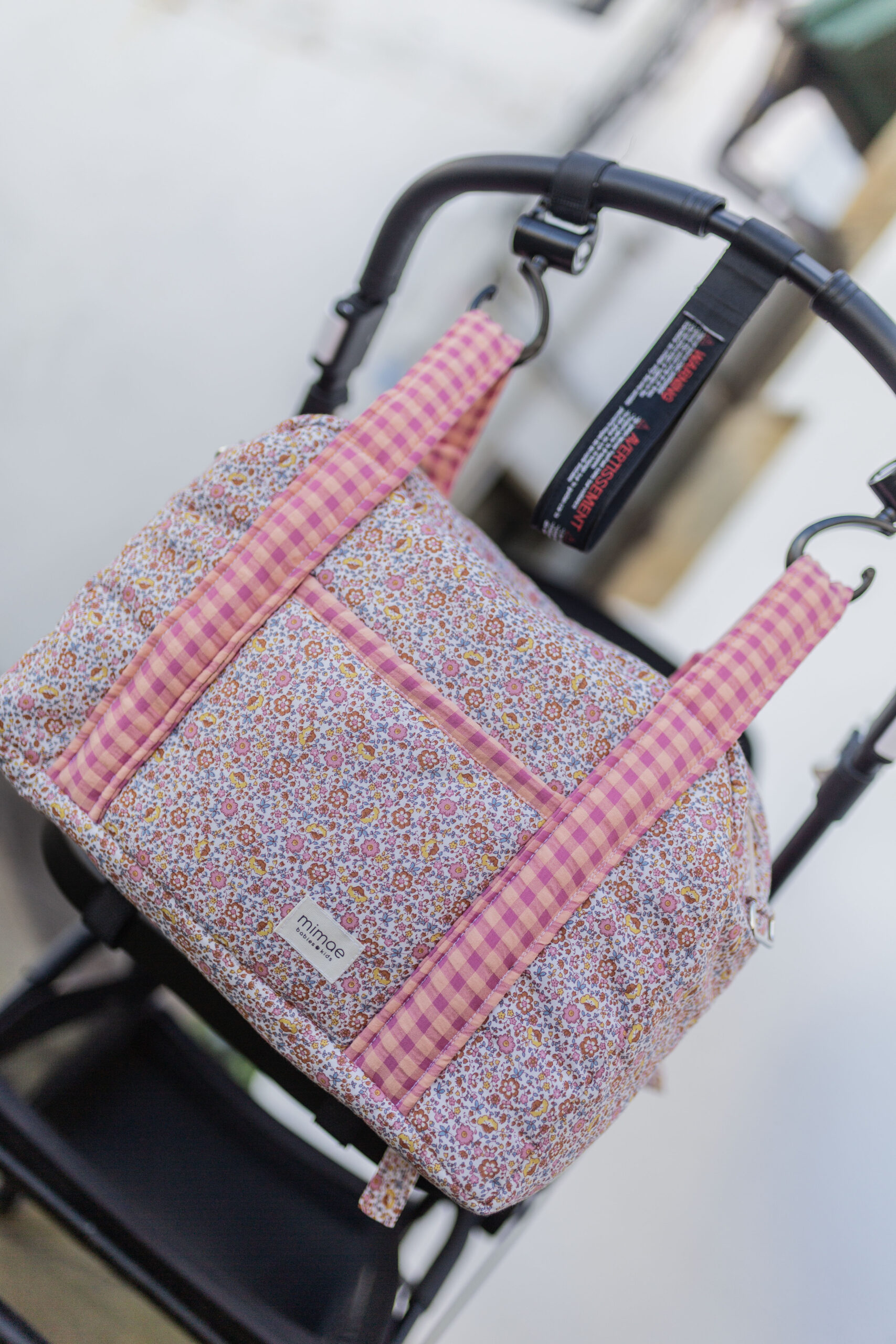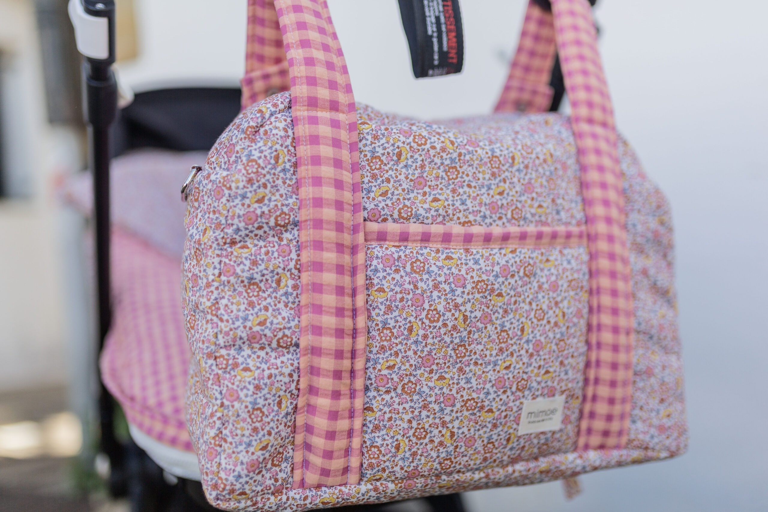 Nuestro new big es ideal para guardar todo lo necesario cuando salimos de paseo. Acolchado con una guata de grosor medio está forrado con un algodón orgánico y se cierra con cremallera. Además entre el forro y la guata tiene un tejido impermeable para que el bolso no se empape si se derrama algún líquido. Tiene un bolsillo en el exterior y otros dos en el interior para llevar todo bien organizado. Se engancha al carro mediante dos asas con corchetes. Tiene asa larga. Estampado Laida y vichy strawberry