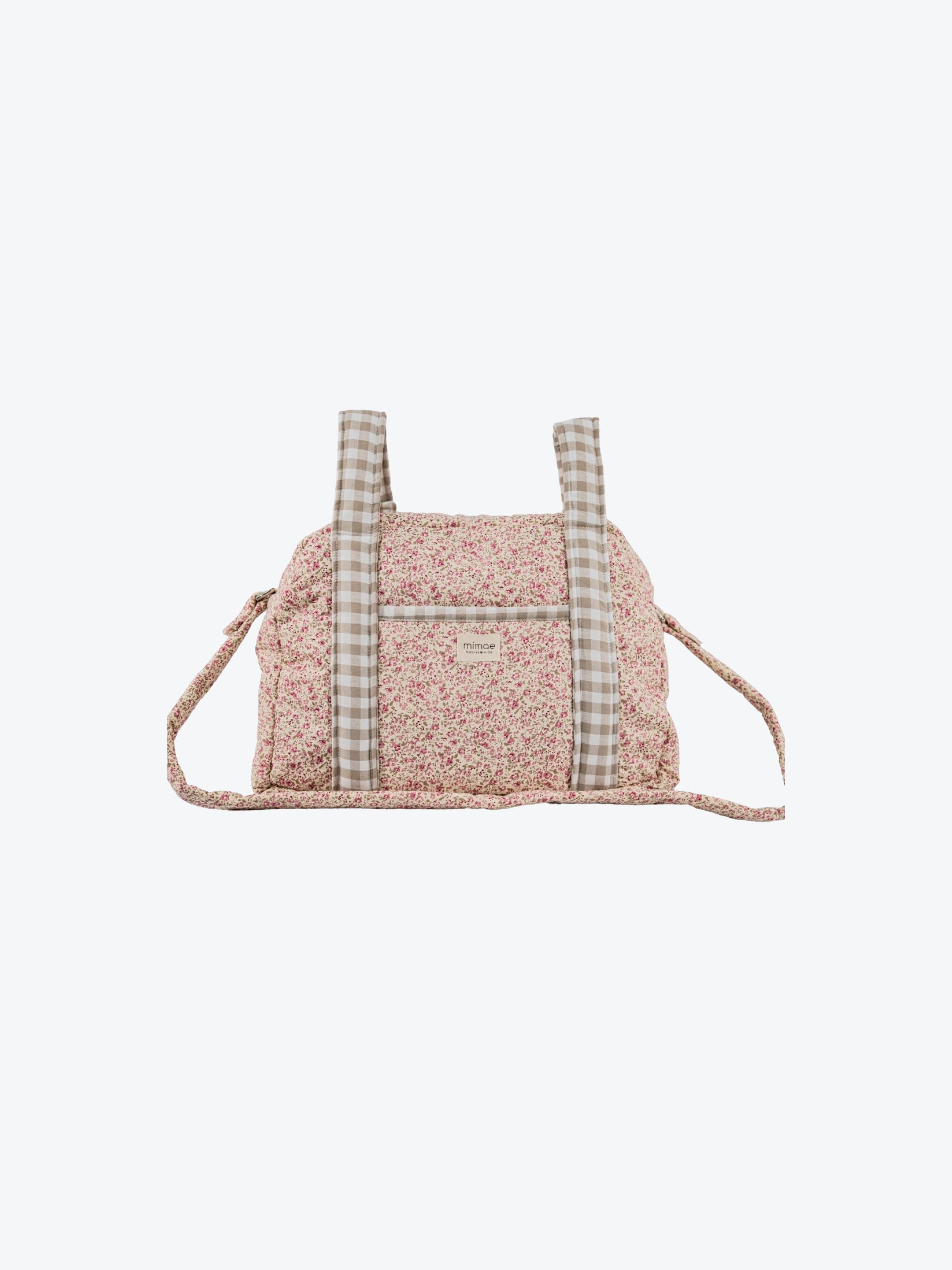 Nuestro new big es ideal para guardar todo lo necesario cuando salimos de paseo. Acolchado con una guata de grosor medio está forrado con un algodón orgánico y se cierra con cremallera. Además entre el forro y la guata tiene un tejido impermeable para que el bolso no se empape si se derrama algún líquido. Tiene un bolsillo en el exterior y otros dos en el interior para llevar todo bien organizado. Se engancha al carro mediante dos asas con corchetes. Tiene asa larga. Estampado Nikole y vichy beige.